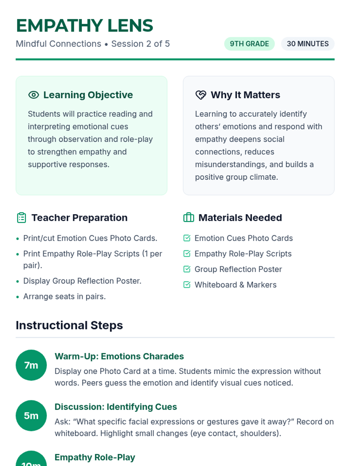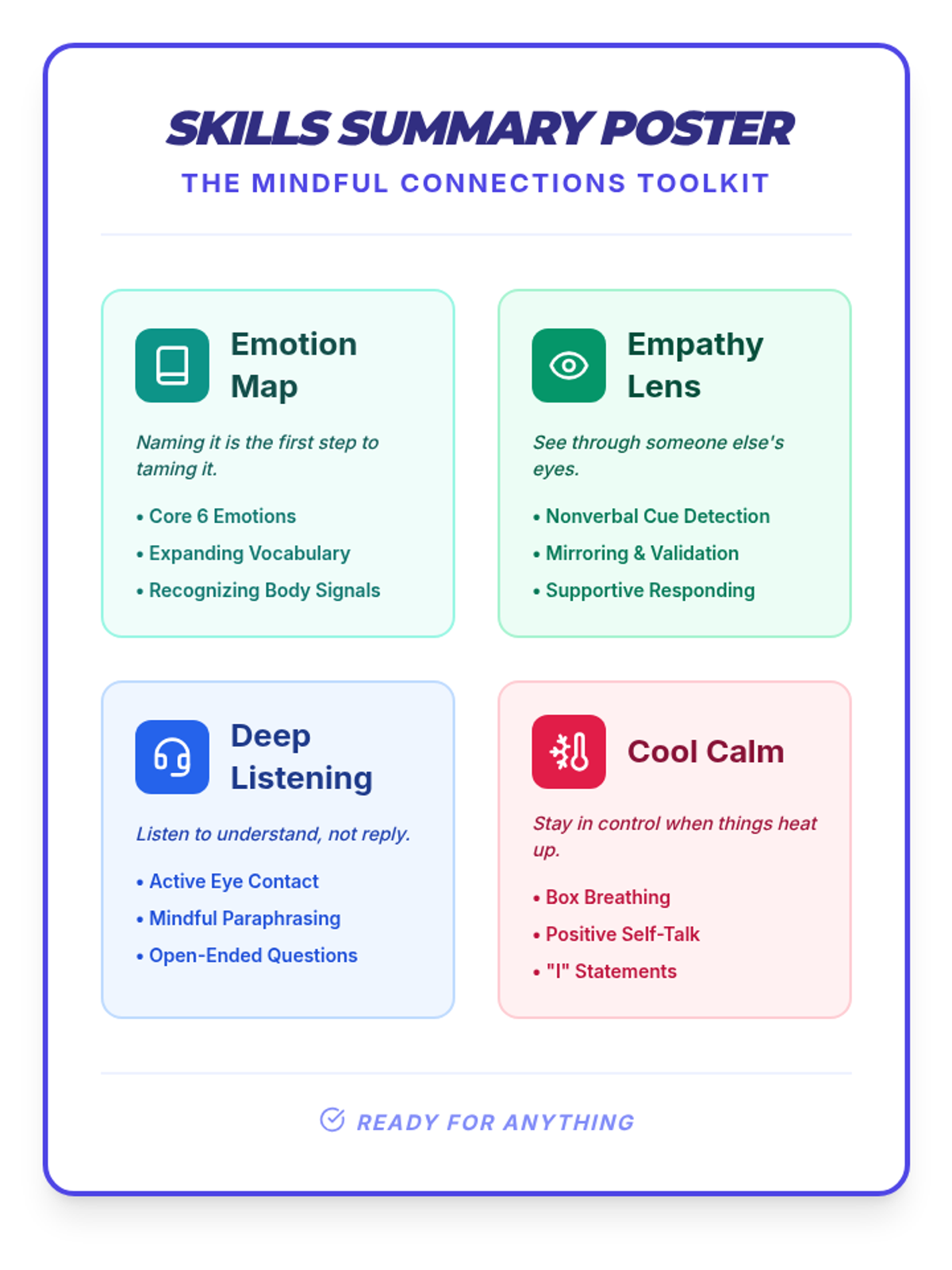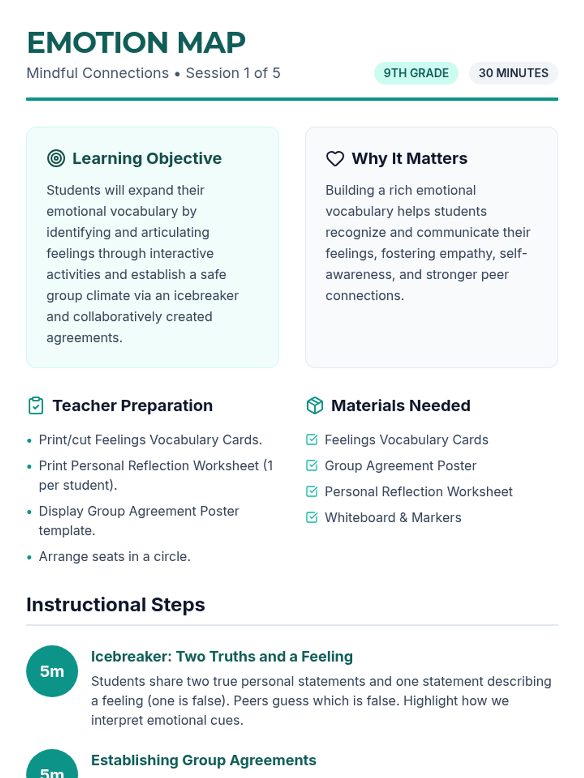 A 5-session small-group program for 9th graders to develop social skills, emotional awareness, and healthy coping strategies.