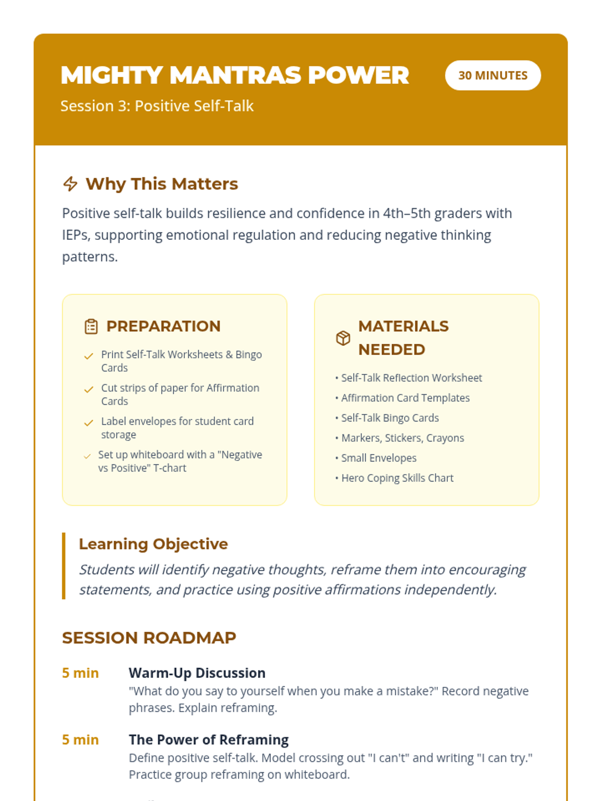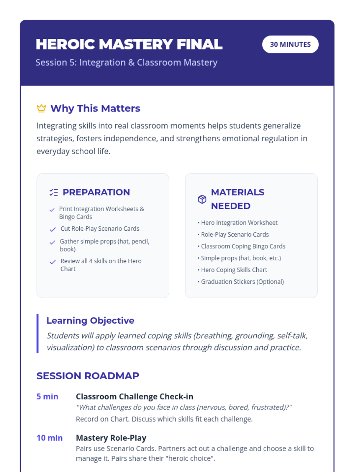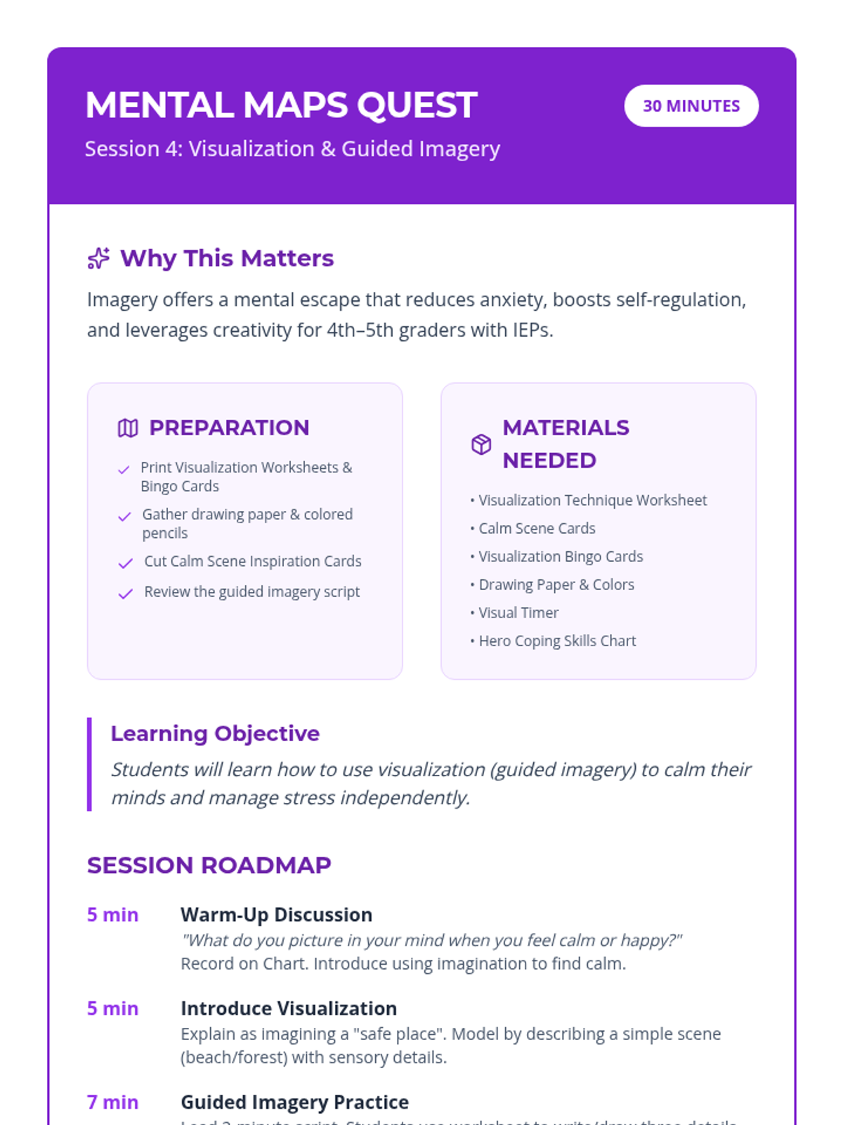 A 5-session mindfulness and emotional regulation series for 4th and 5th graders with IEPs, using a 'Hero's Journey' theme to teach coping skills like belly breathing, grounding, self-talk, and visualization.