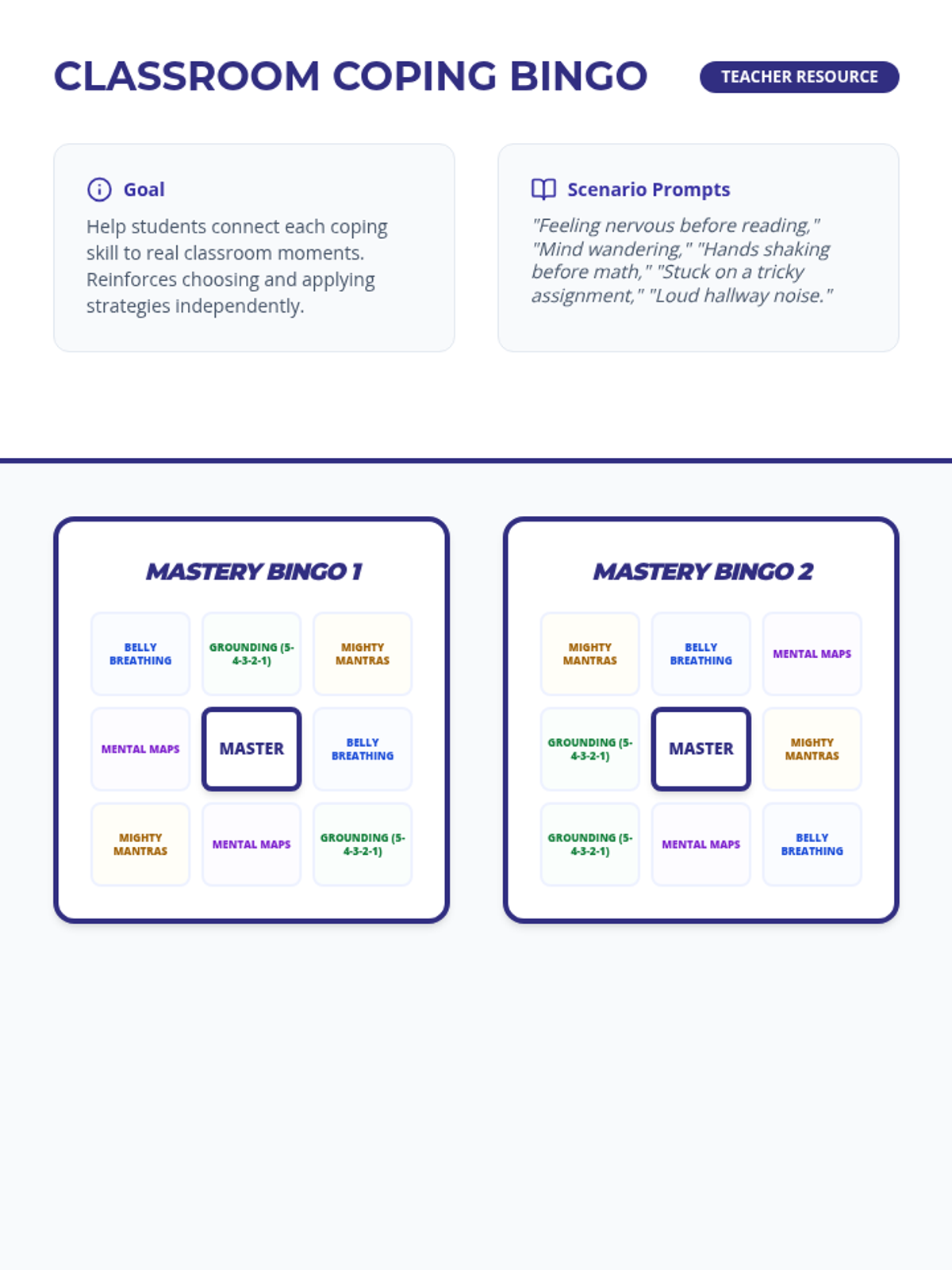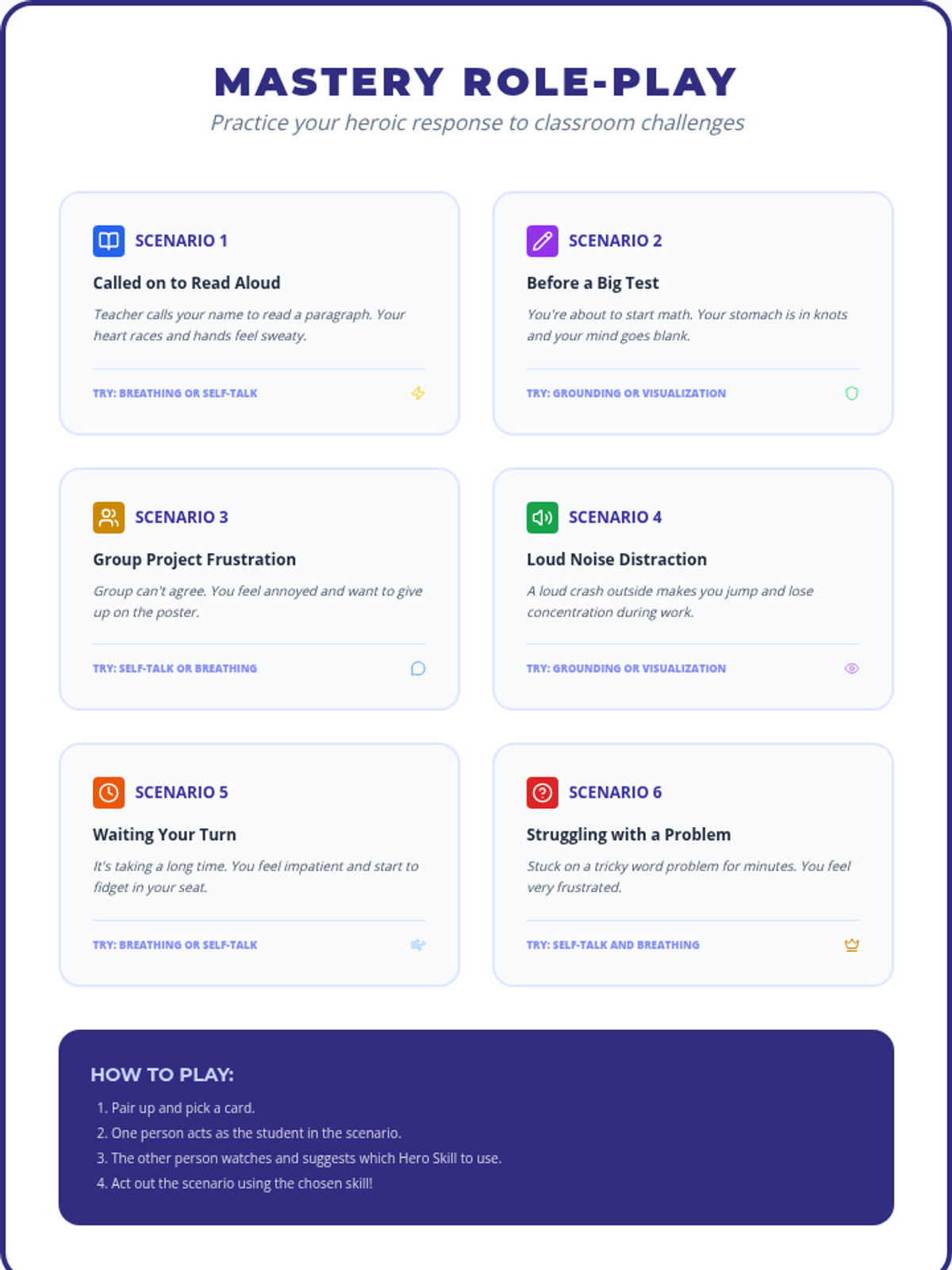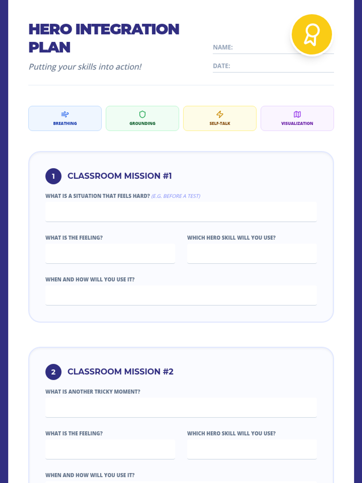 A 5-session mindfulness and emotional regulation series for 4th and 5th graders with IEPs, using a 'Hero's Journey' theme to teach coping skills like belly breathing, grounding, self-talk, and visualization.