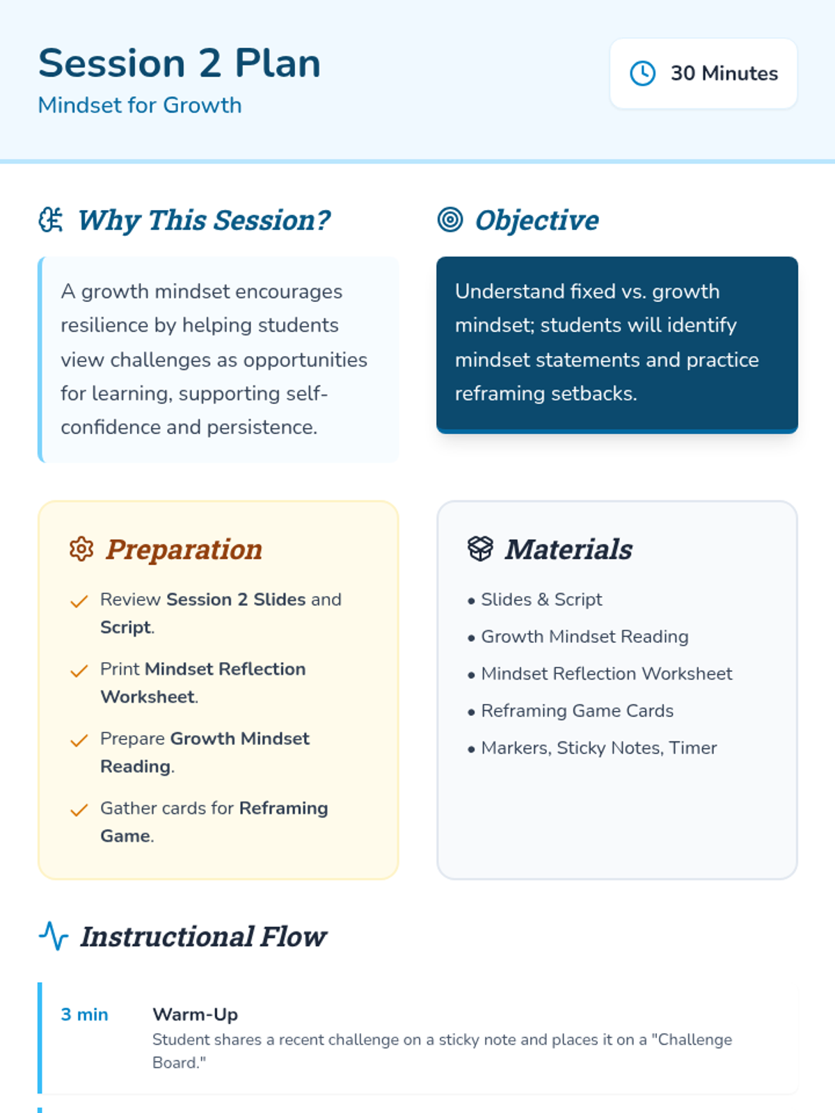 A 6-session individual support series for 4th-grade students focused on building emotion regulation, growth mindset, and positive self-talk skills through interactive activities and reflective practice.