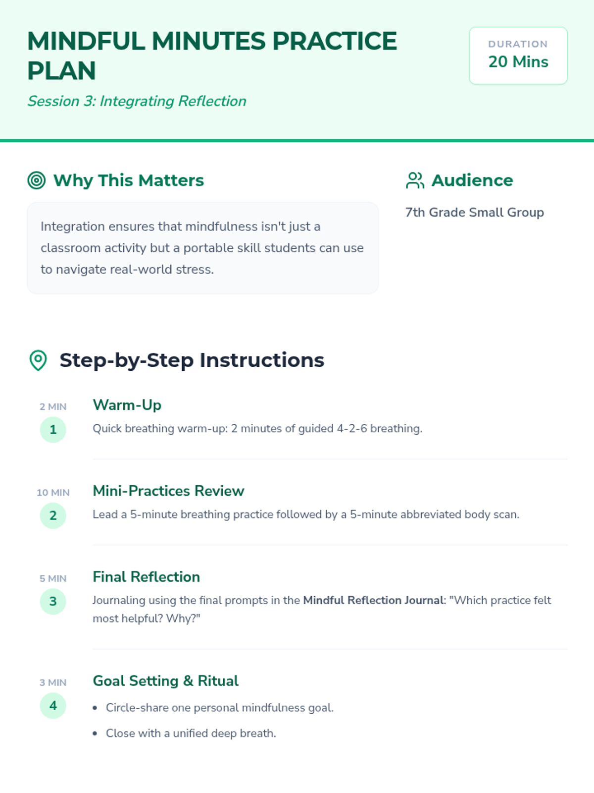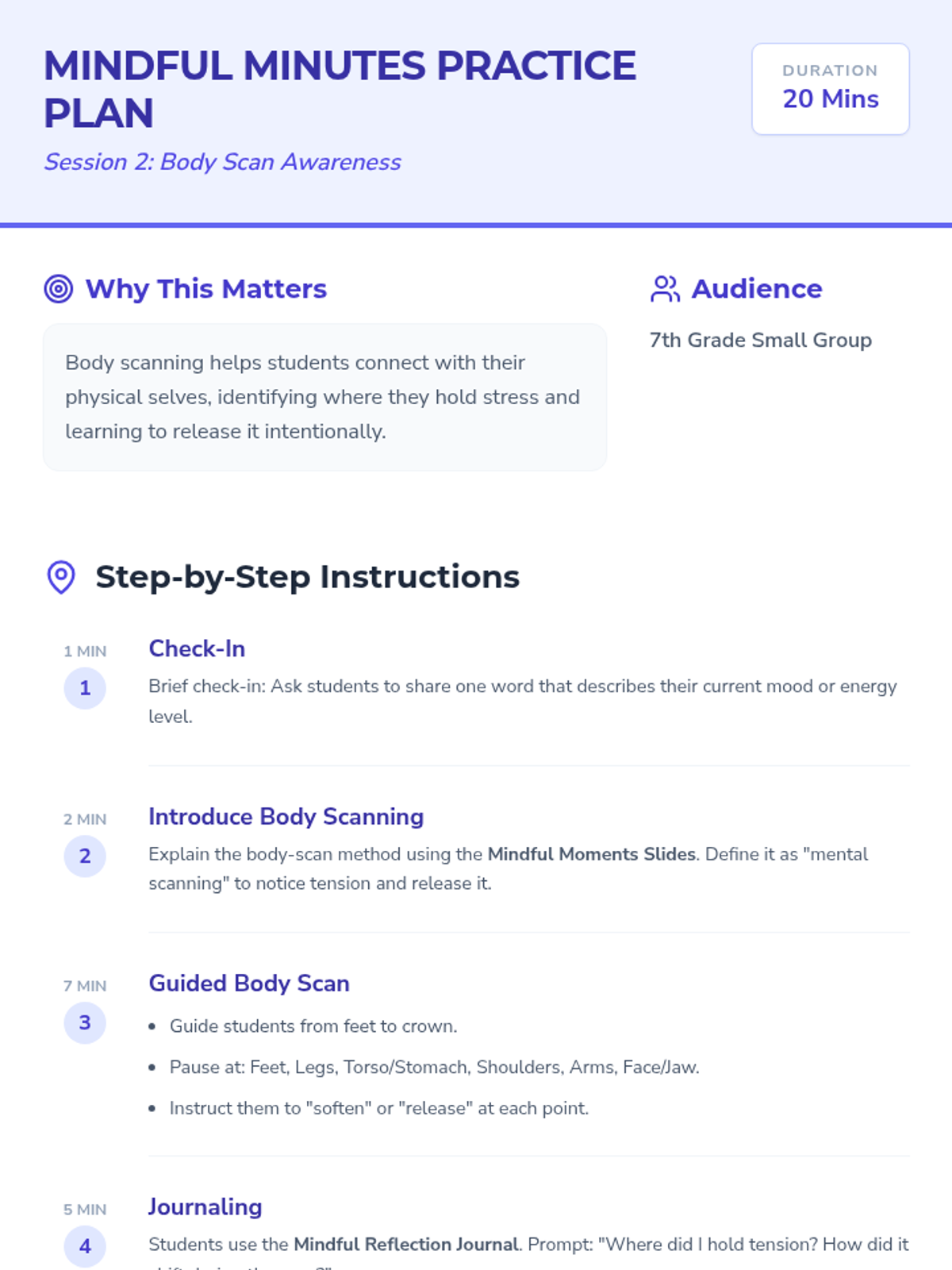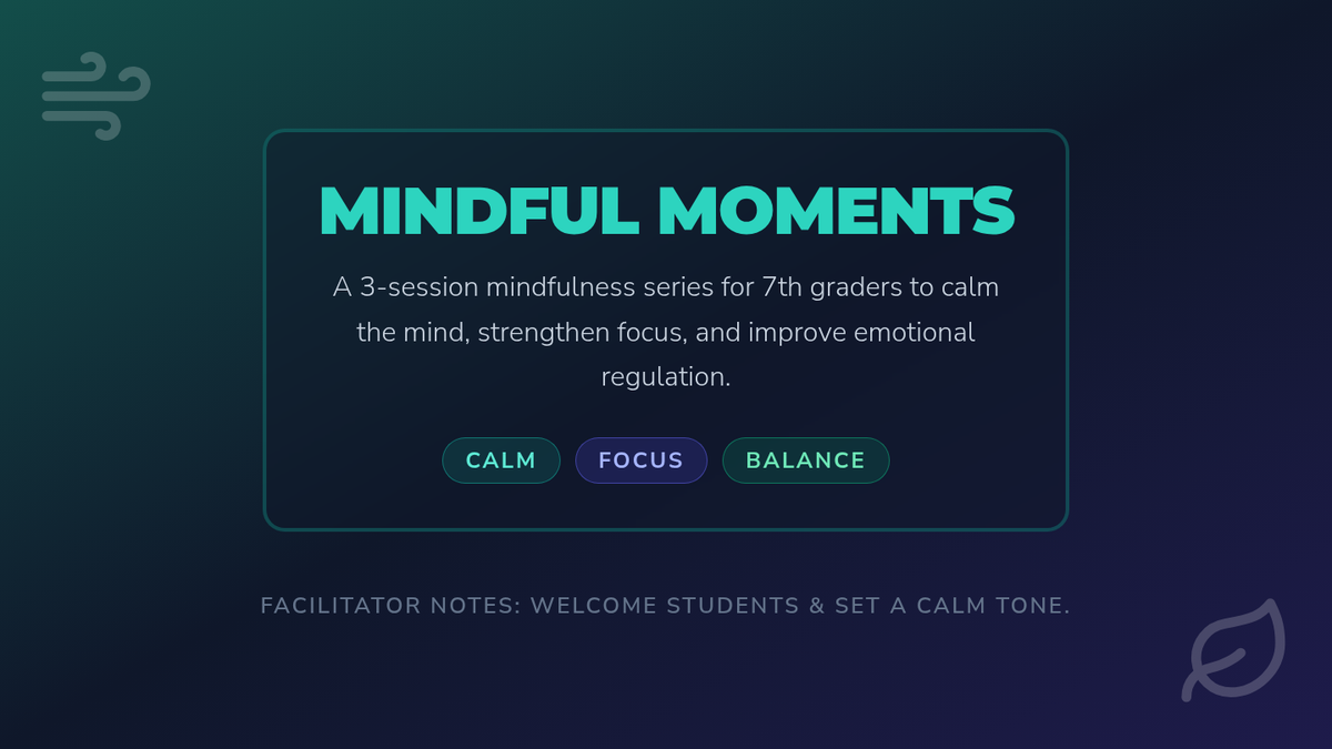 A 3-session mindfulness series for 7th graders to develop emotional regulation, focus, and stress management through guided breathing, body scans, and reflective journaling.