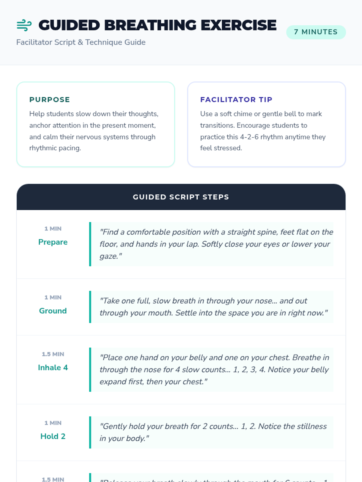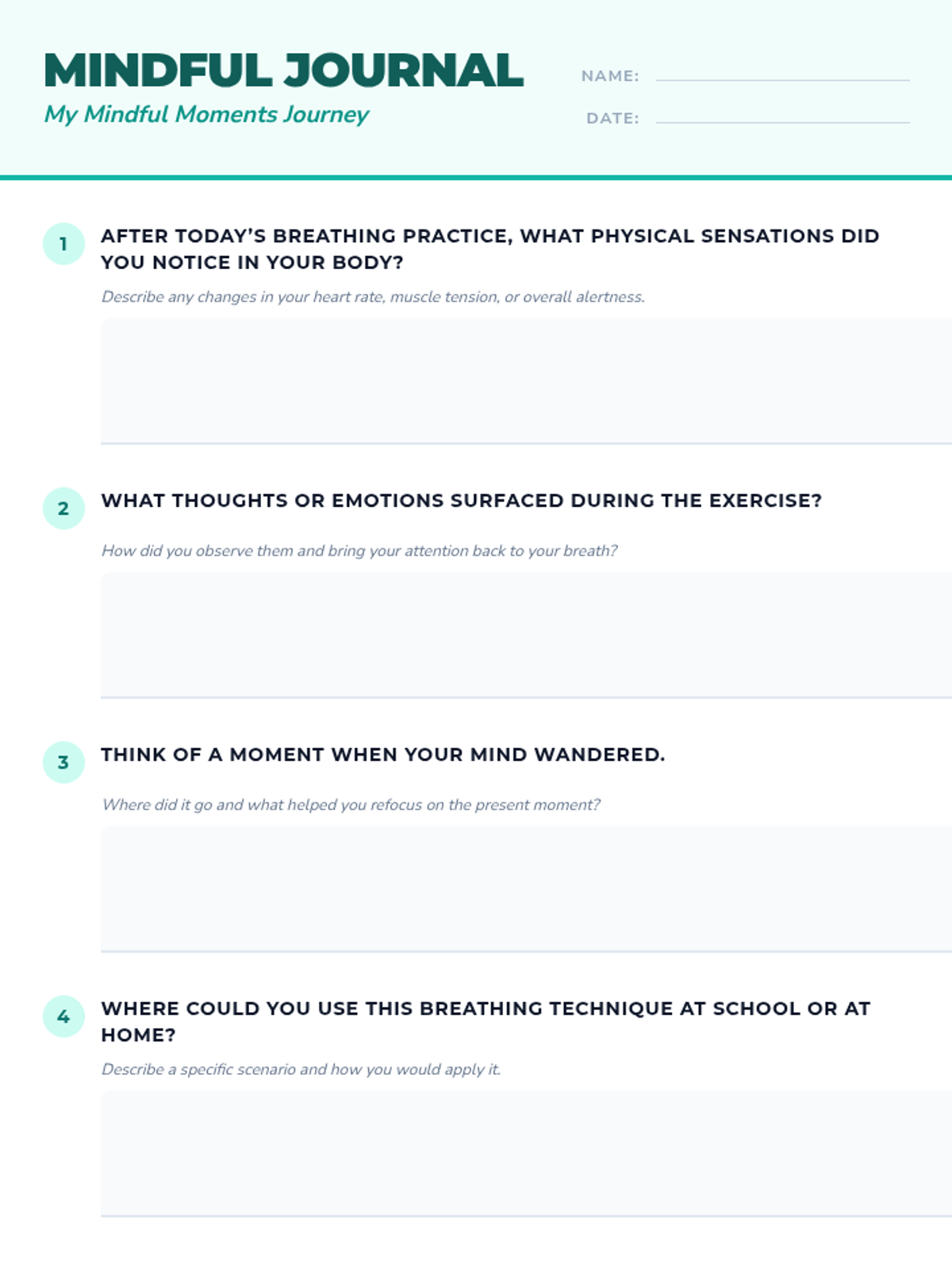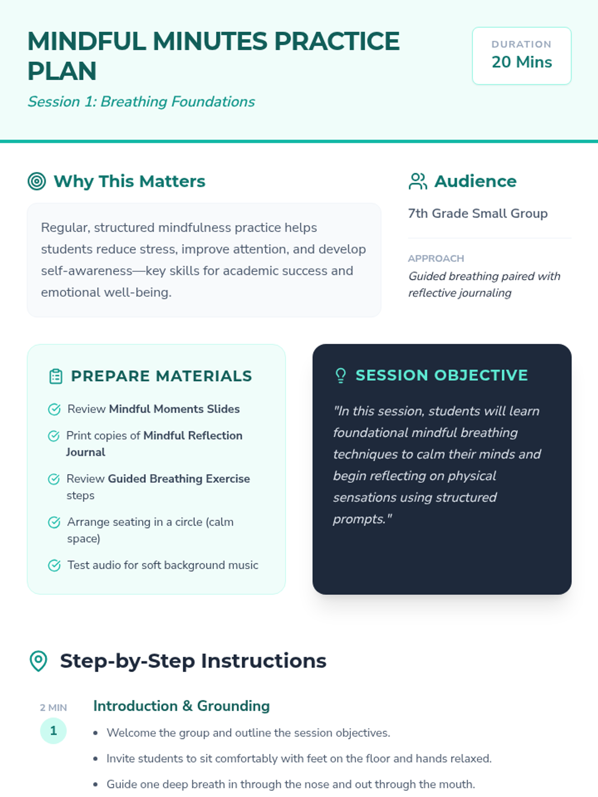 A 3-session mindfulness series for 7th graders to develop emotional regulation, focus, and stress management through guided breathing, body scans, and reflective journaling.