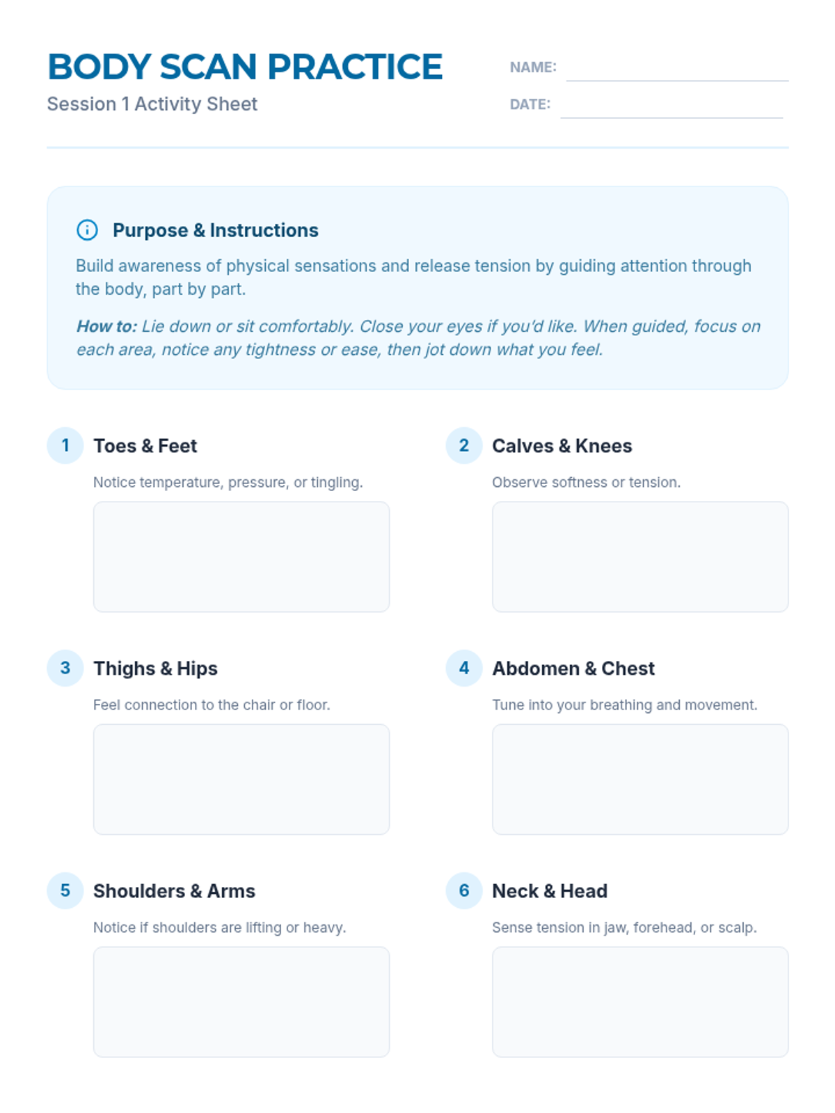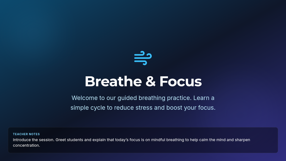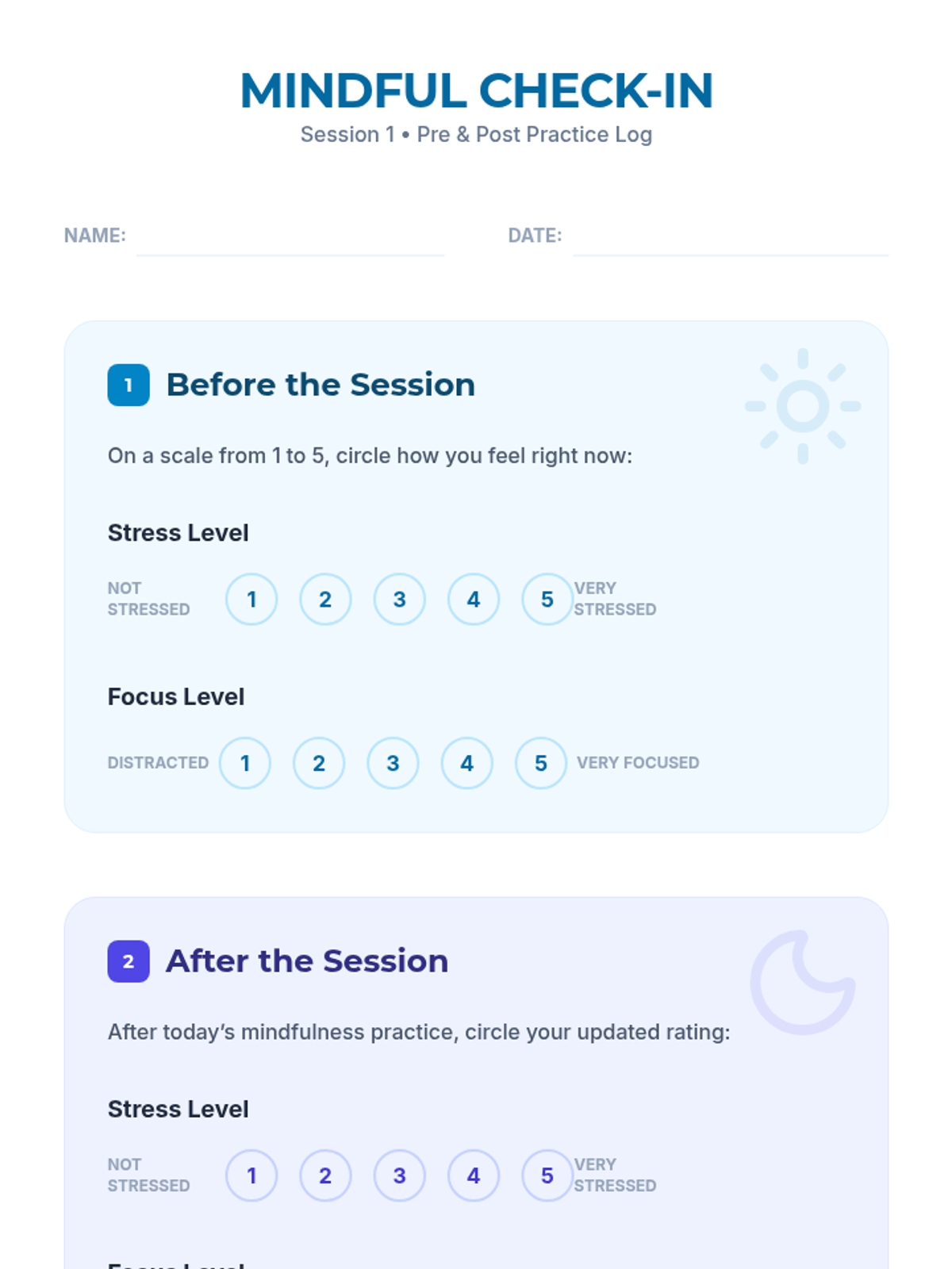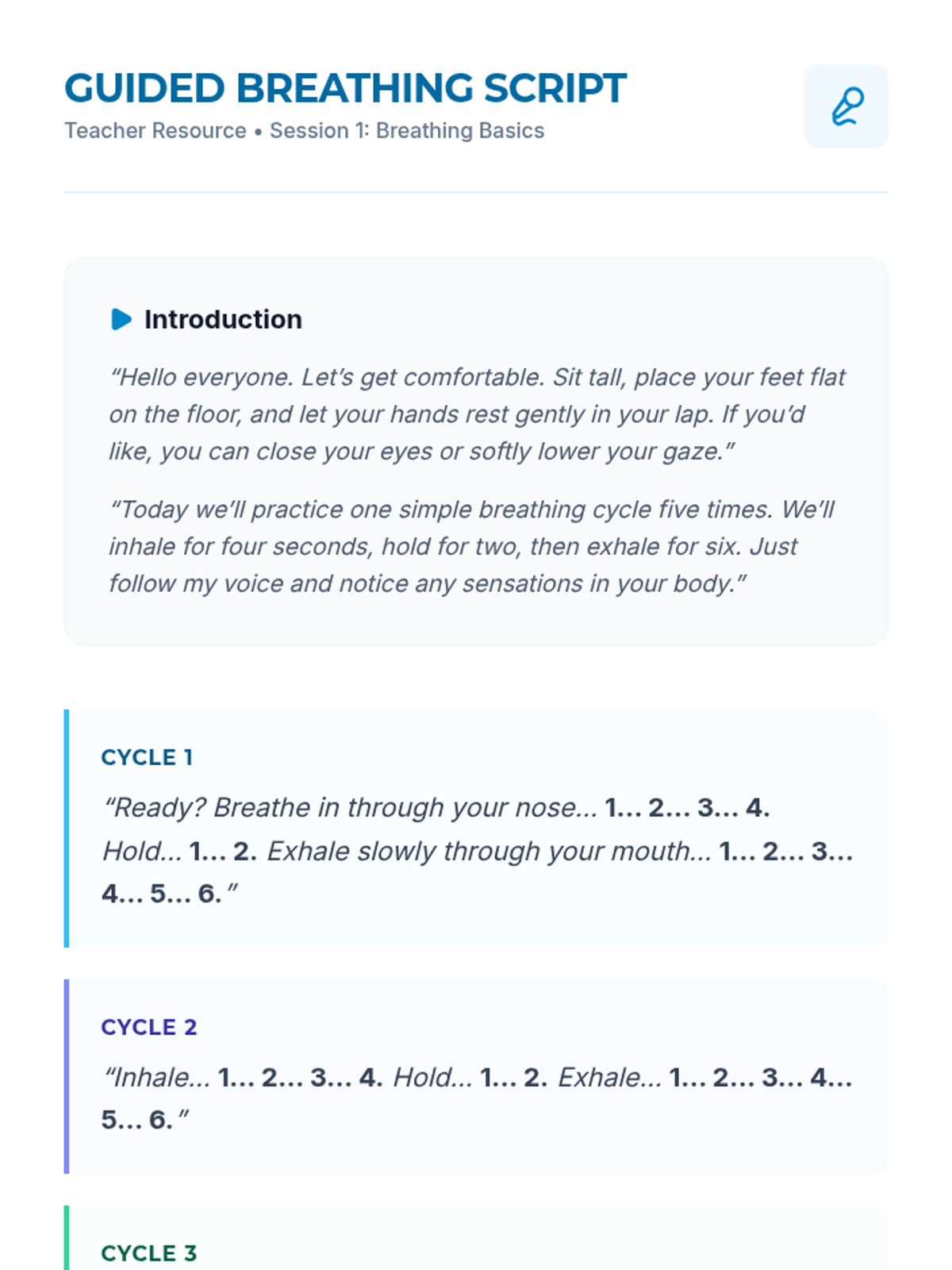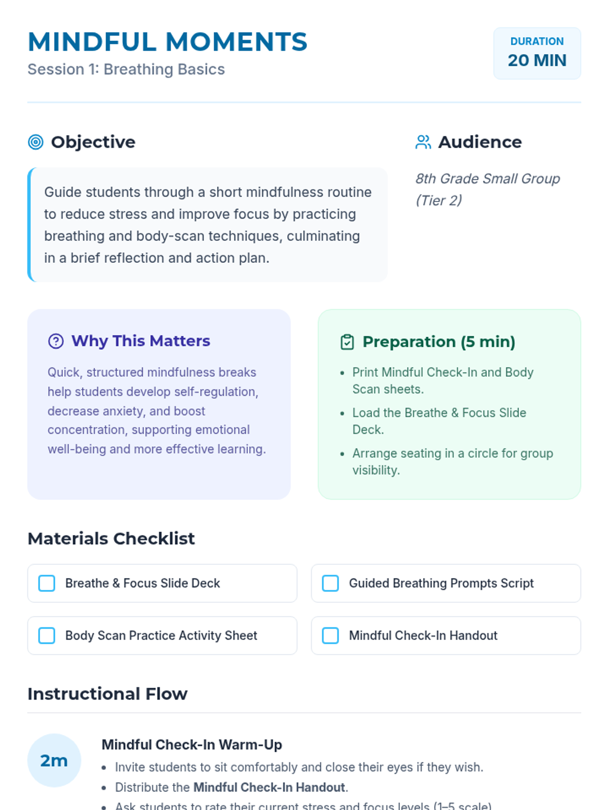 A four-session Tier 2 small-group program for 8th graders, teaching practical mindfulness techniques to reduce stress, improve emotional regulation, and boost academic focus. Each 20-minute session provides hands-on practice with breathing, grounding, and self-awareness tools.