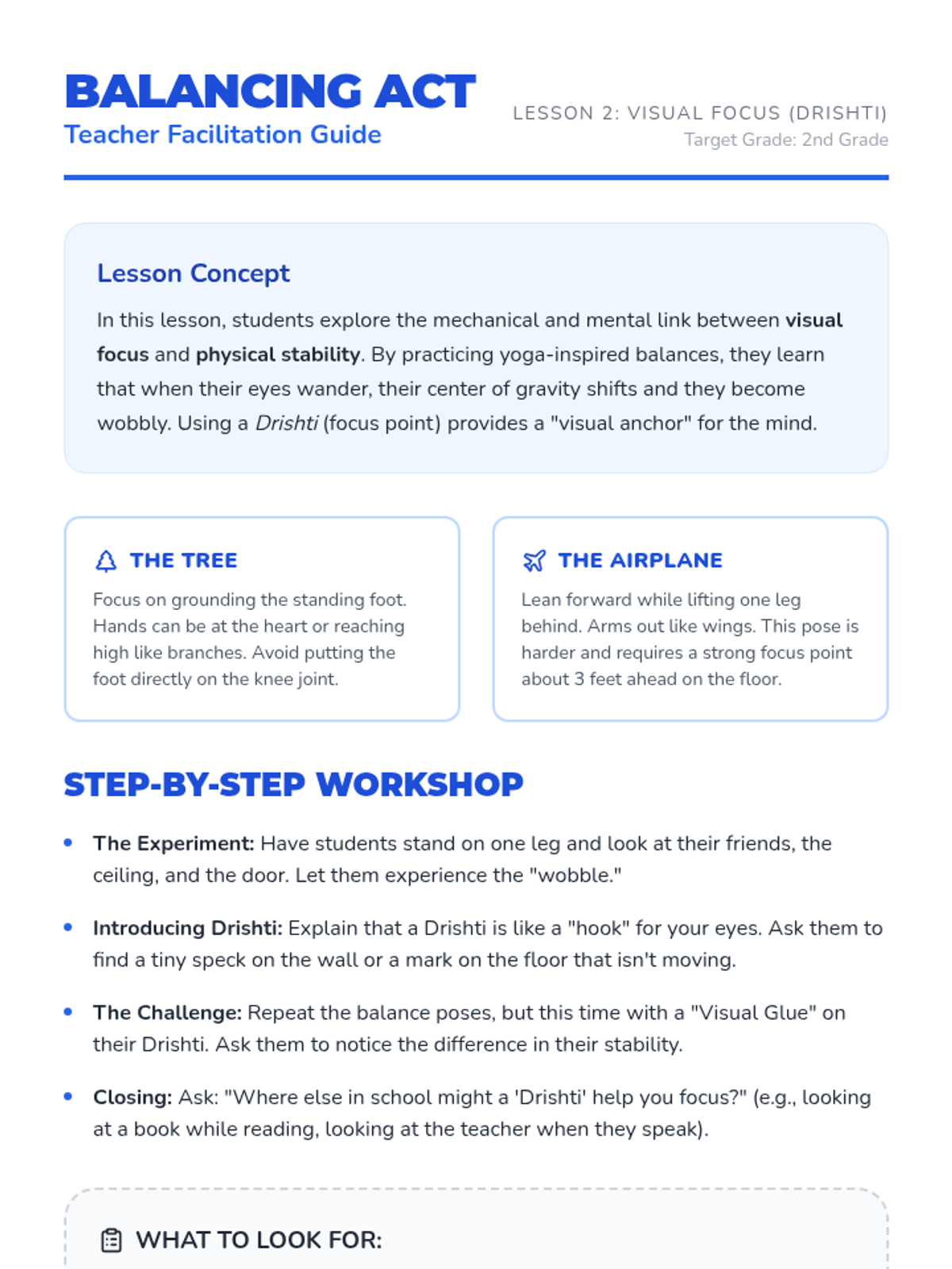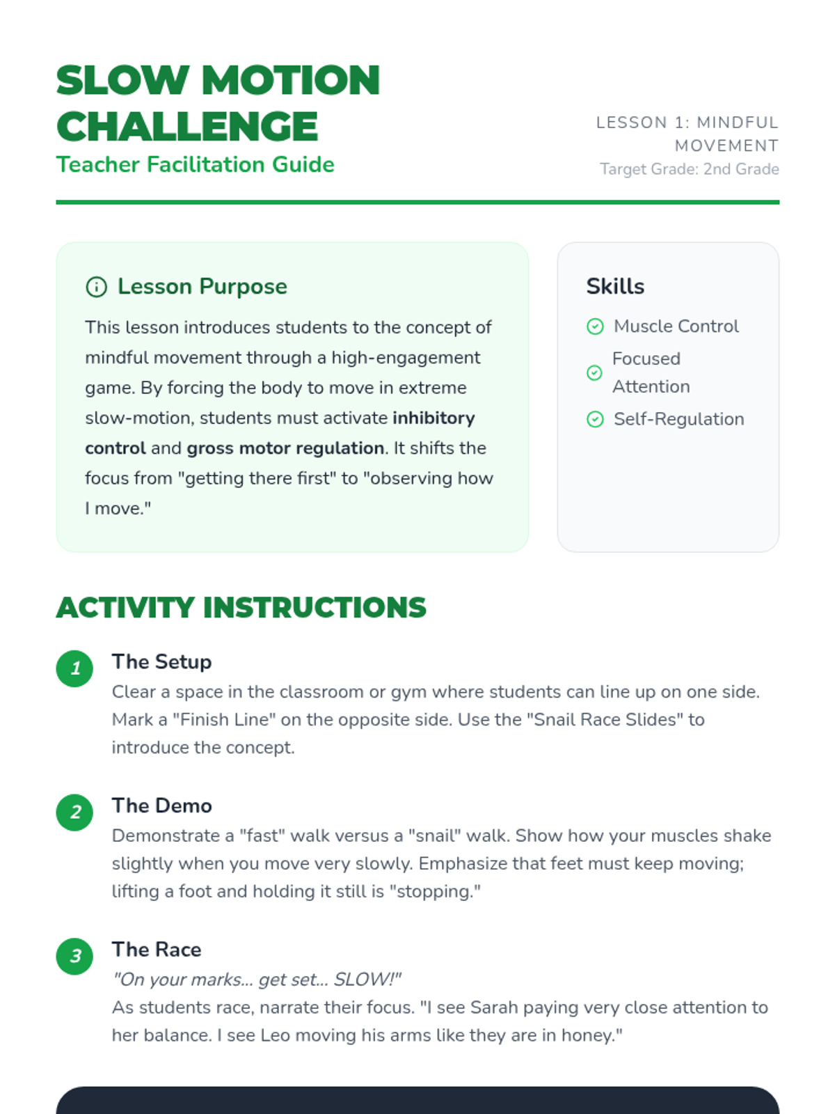 This 2nd-grade mindfulness sequence bridges stillness and activity through mindful movement. Students practice sustaining attention through slow-motion challenges, balancing, mirroring, and smooth transitions, learning to apply mindfulness to their physical bodies and daily routines.