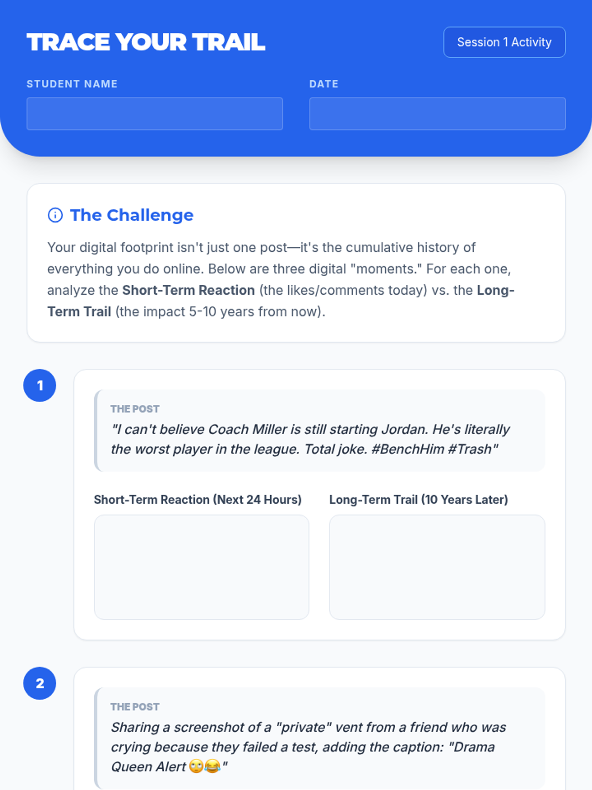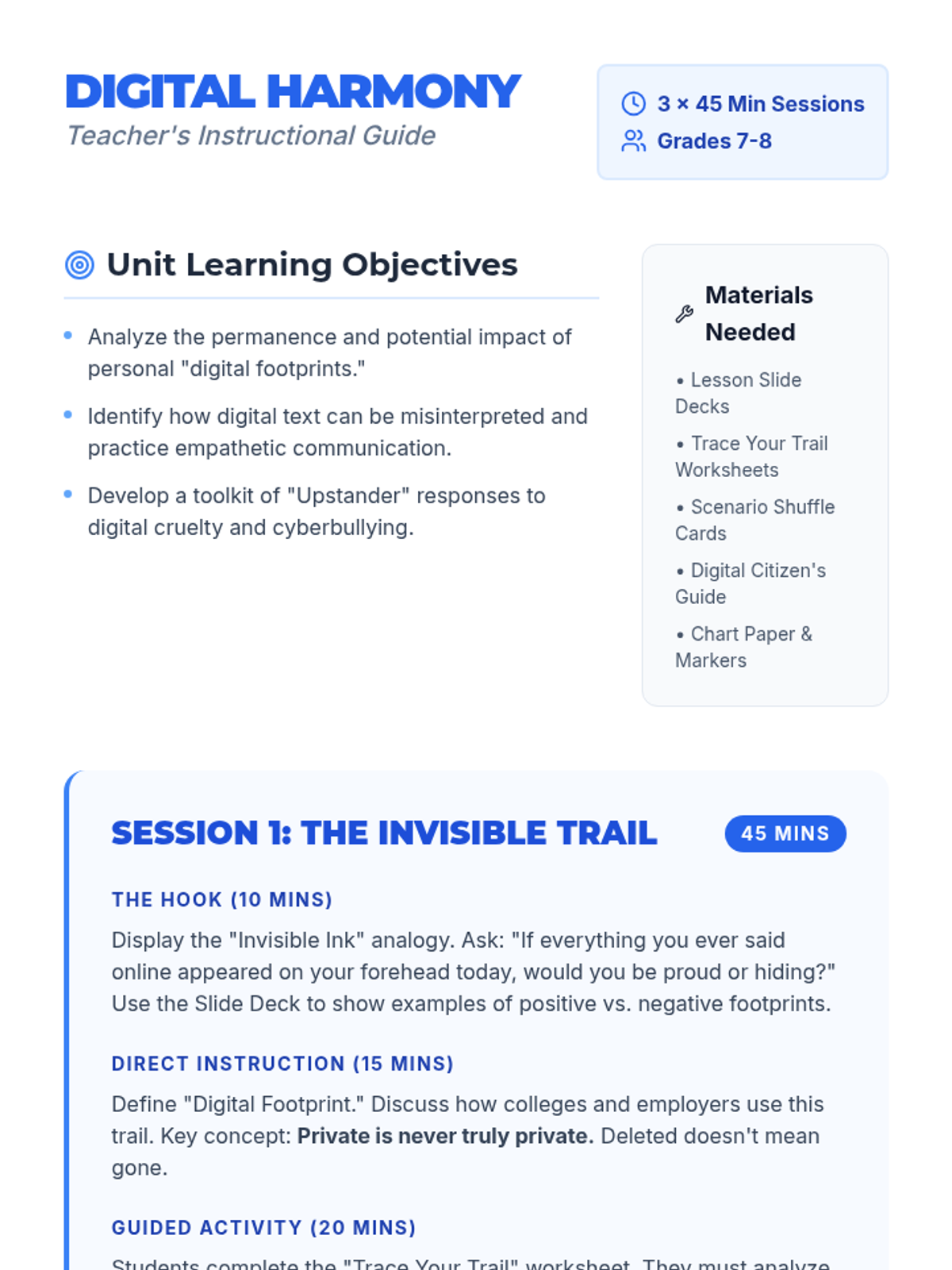 A three-part lesson series designed for middle schoolers to navigate the digital world with empathy, integrity, and safety. Students explore their digital footprint, practice nuanced communication, and develop strategies to combat cyberbullying as upstanders.