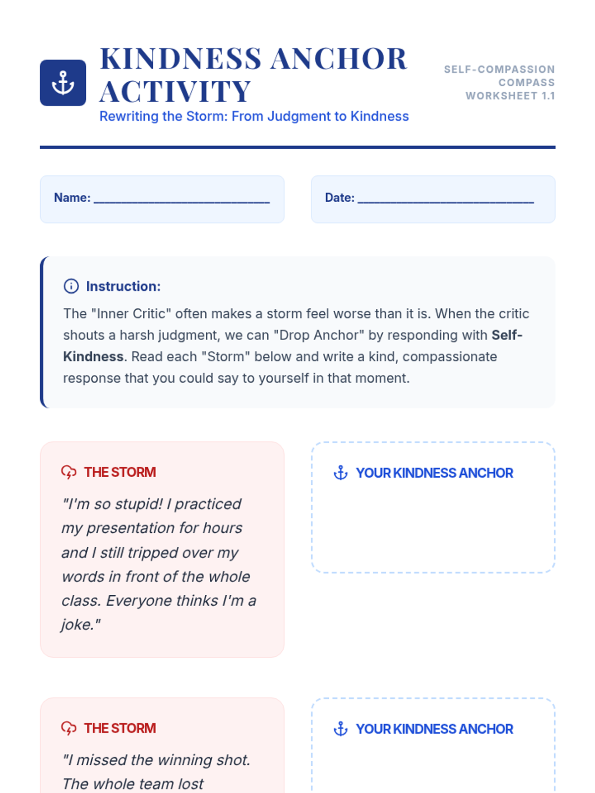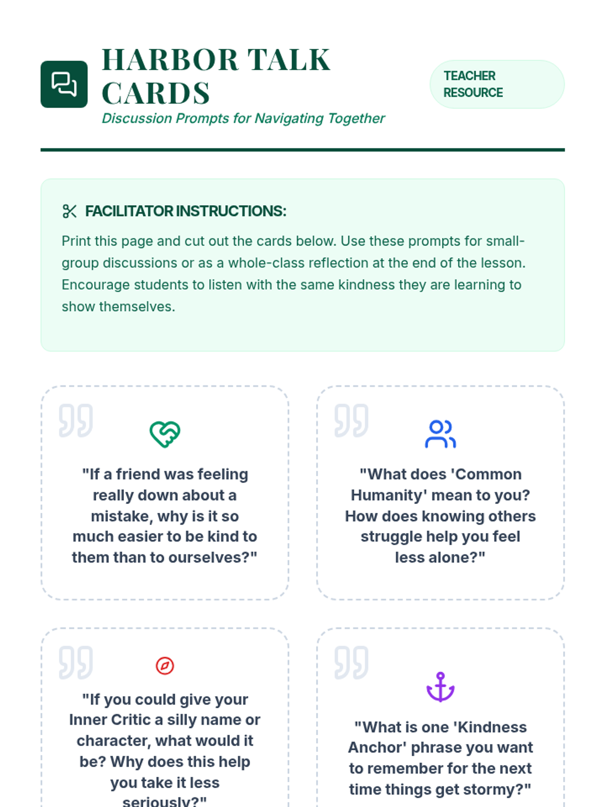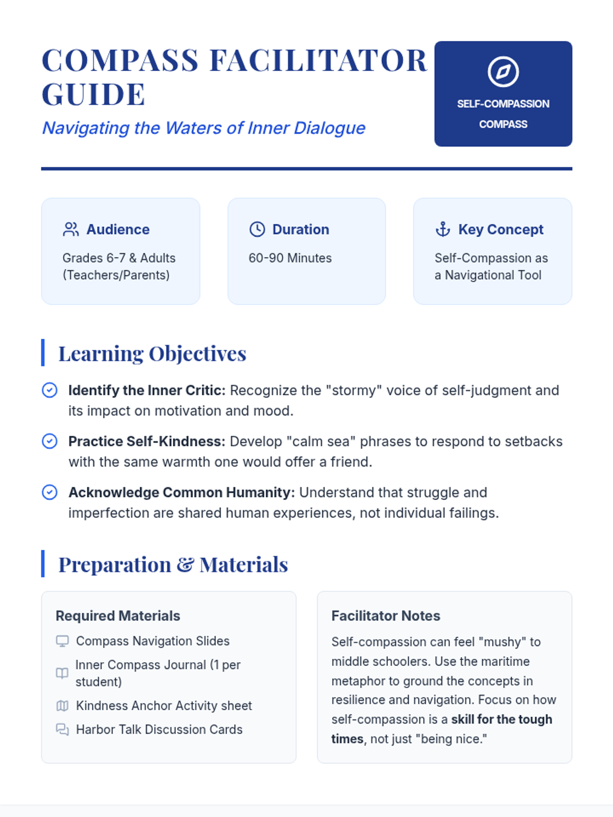 A comprehensive social-emotional learning sequence focused on developing self-compassion, identifying harsh inner critics, and fostering emotional resilience through the metaphor of navigation.