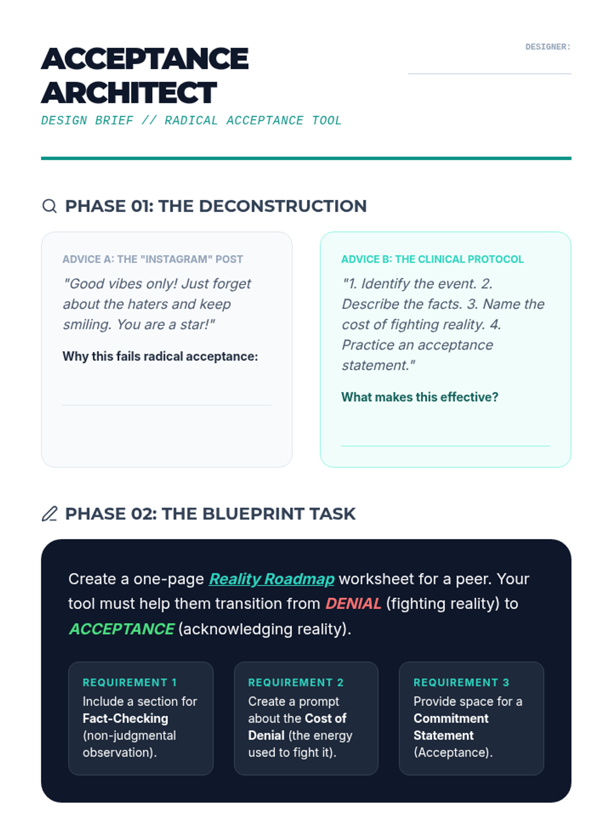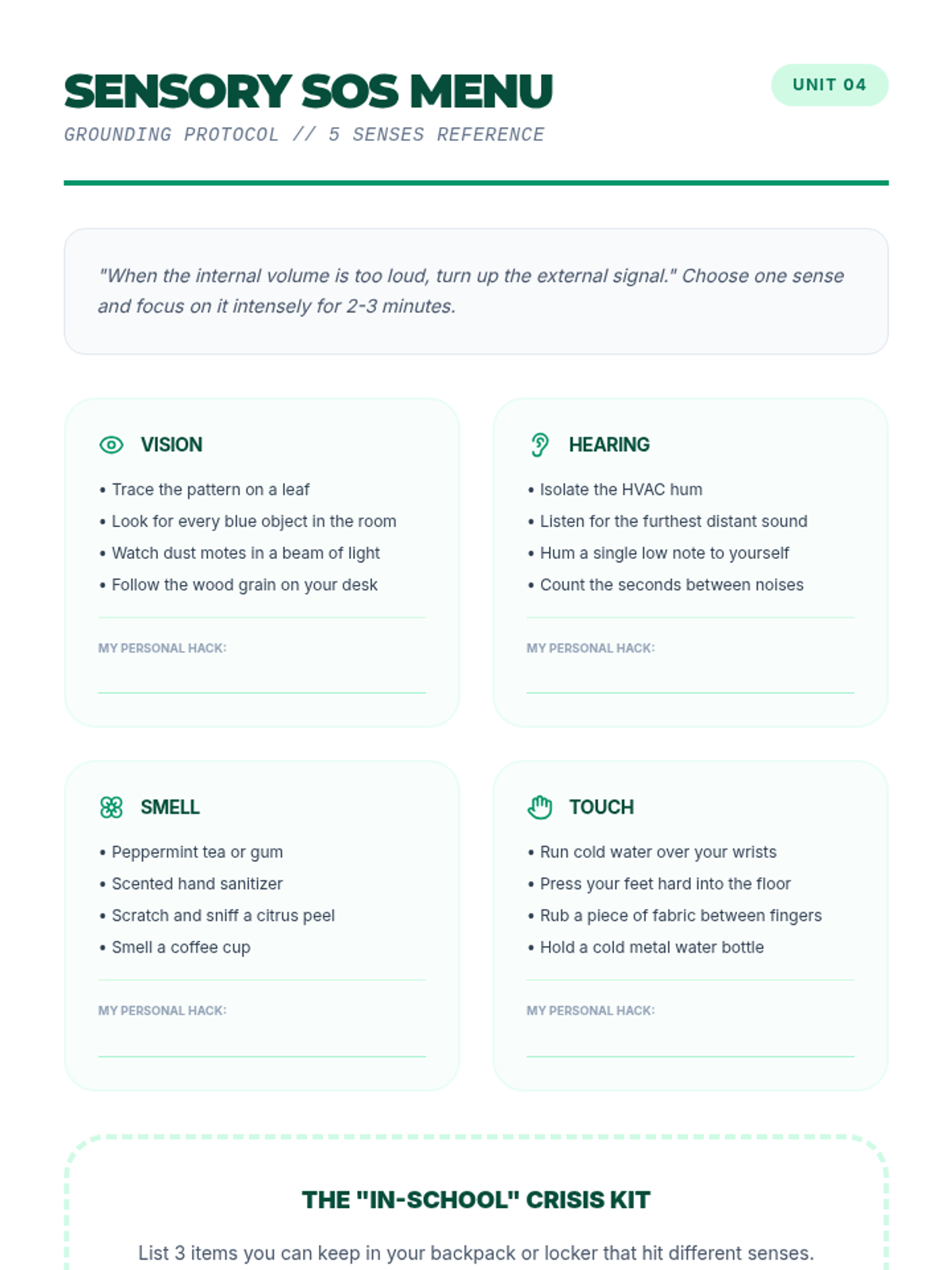 A comprehensive 5-lesson sequence for 11th-grade students focusing on mindfulness, distress tolerance, and radical acceptance. Students move from basic observational skills to creating a personalized 'Personal Crisis Manual' for emotional regulation.