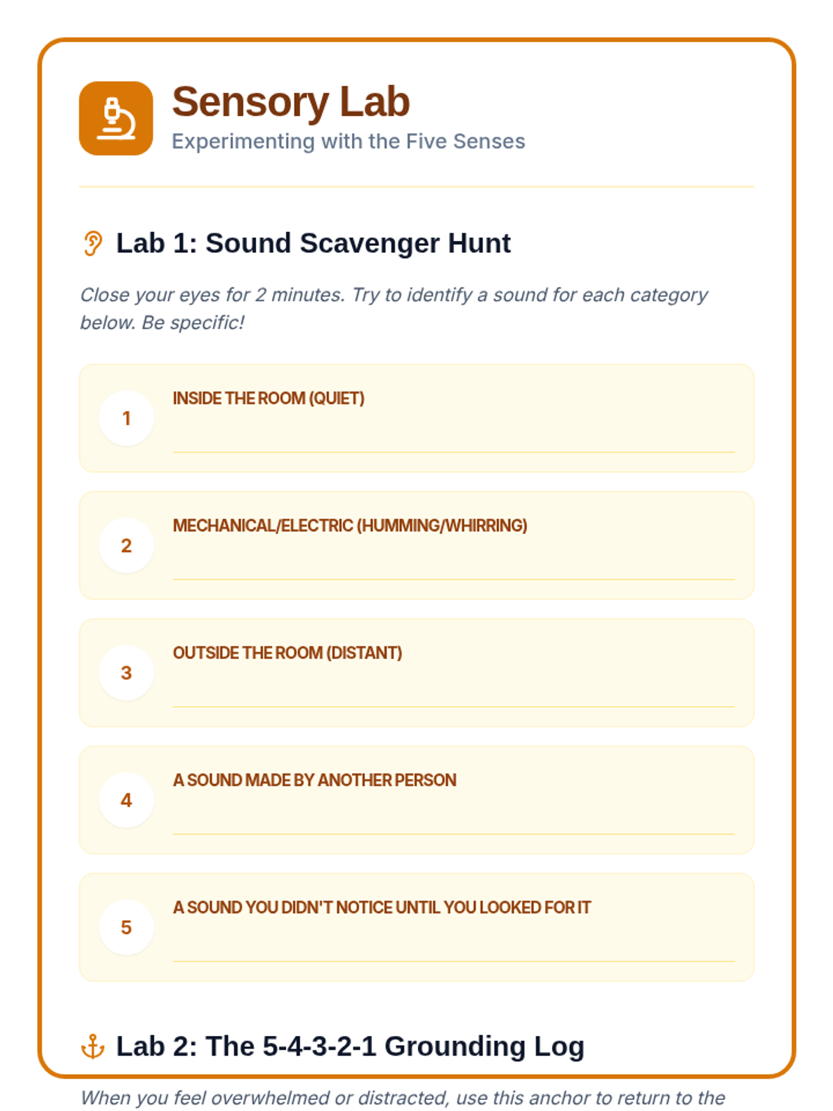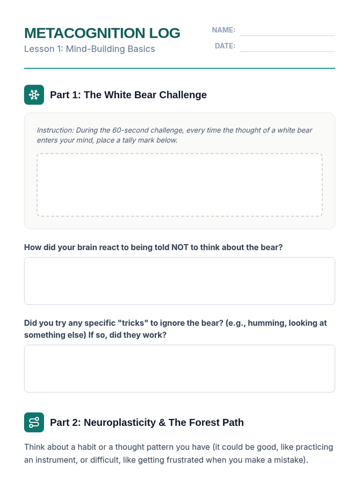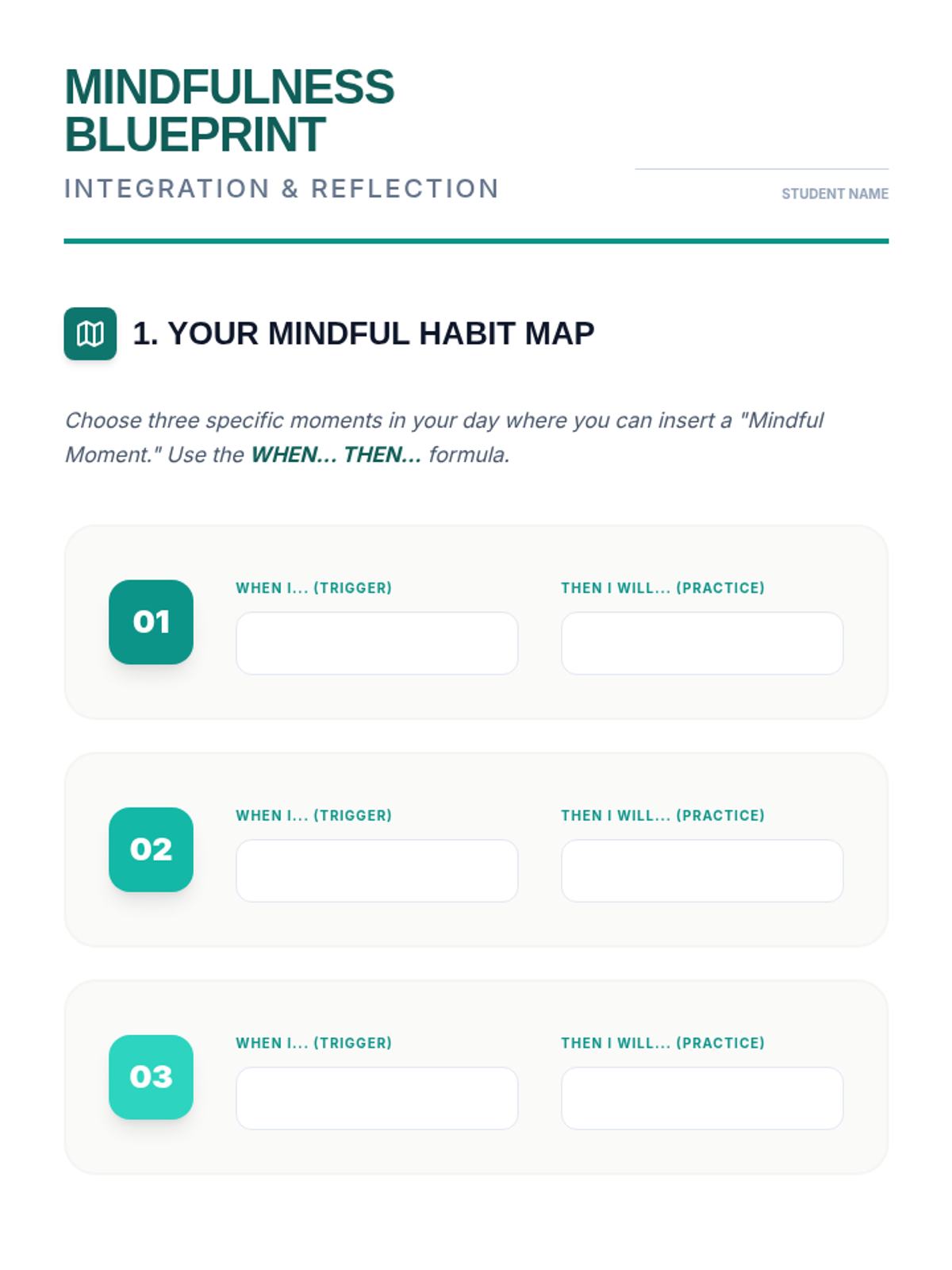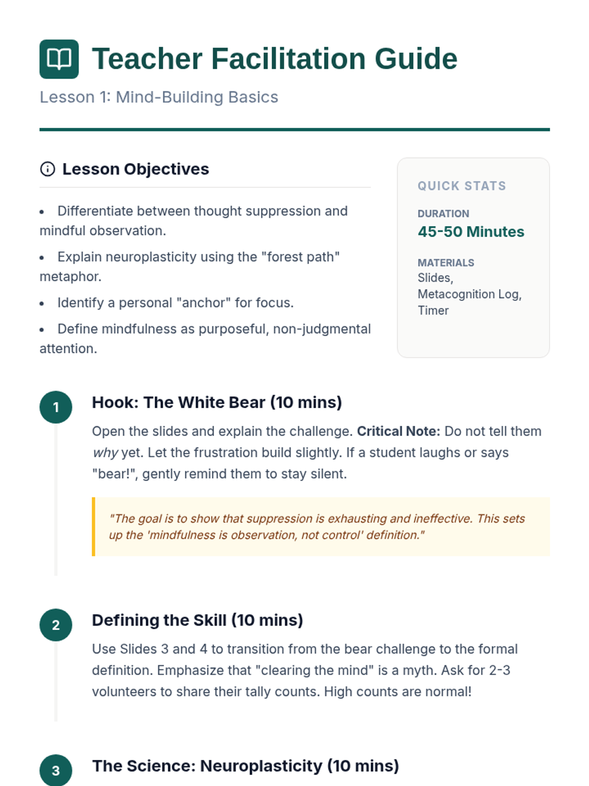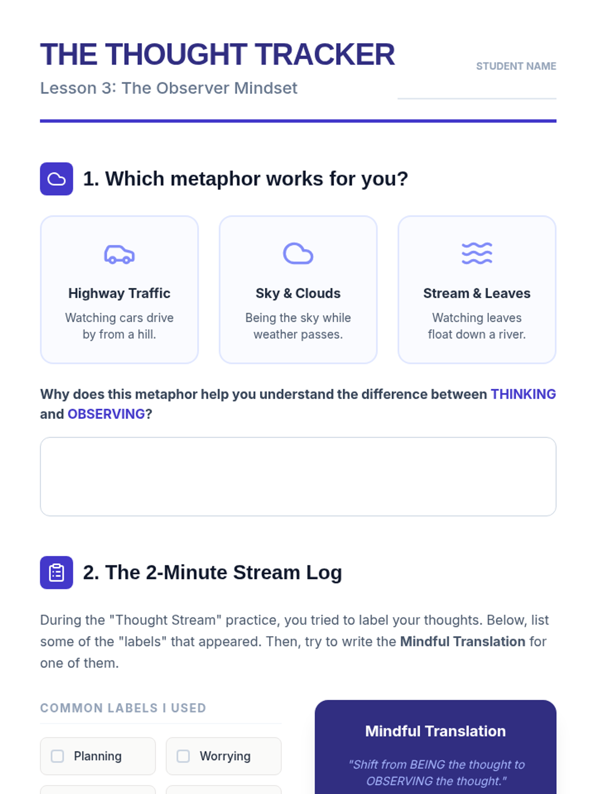 This sequence explores mindfulness as a cognitive skill for emotional regulation and improved attention. Students learn about neuroplasticity, sensory grounding, thought labeling, and the STOP method to build emotional intelligence.