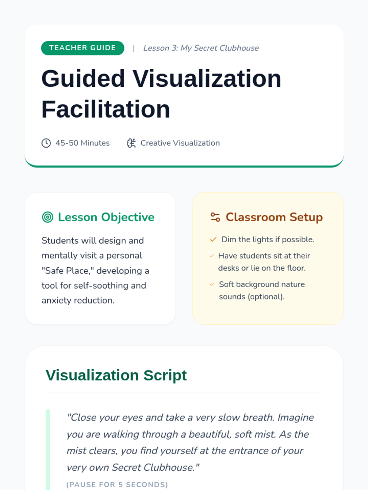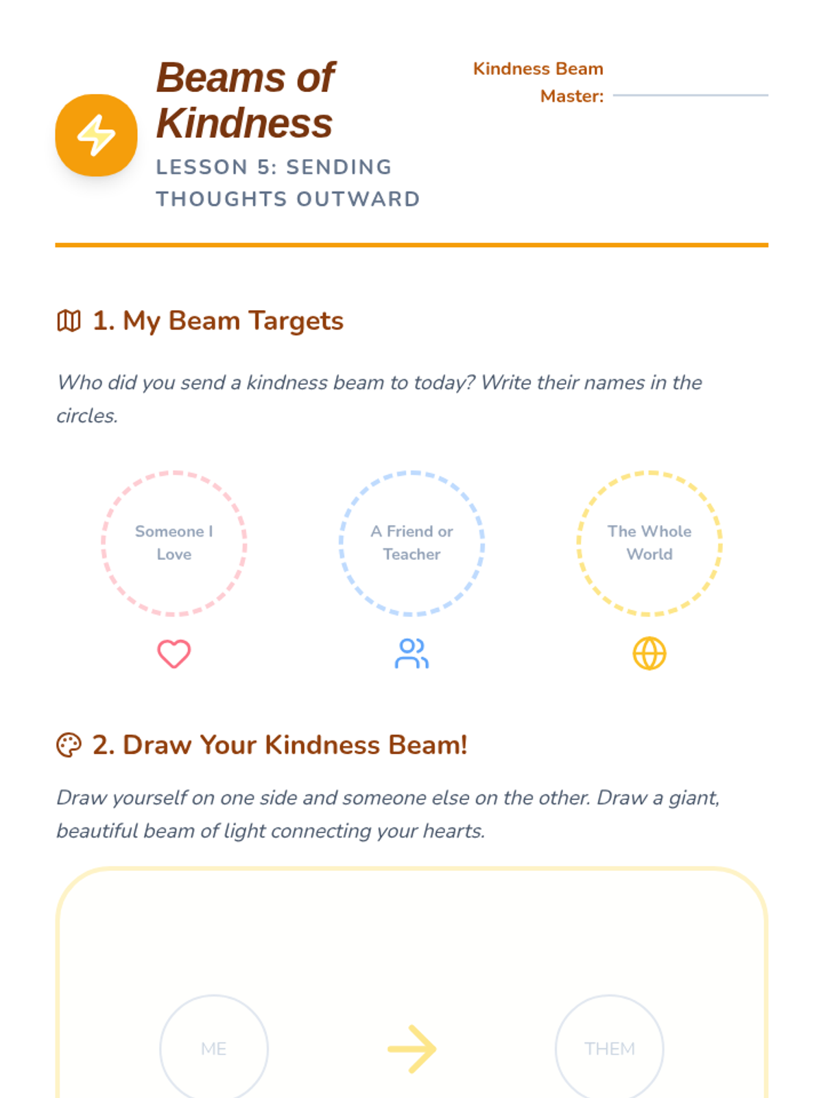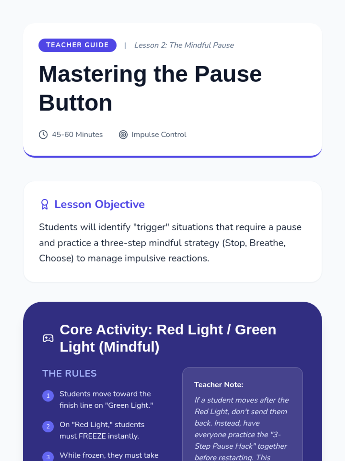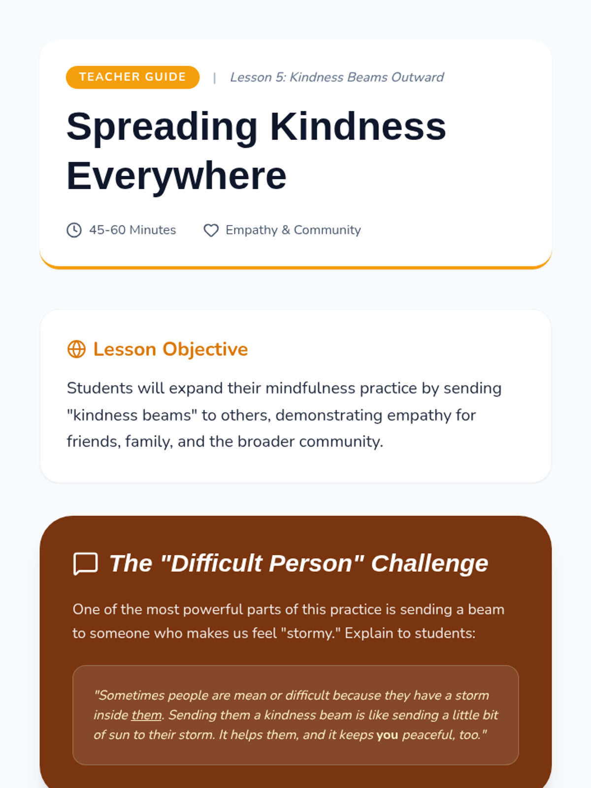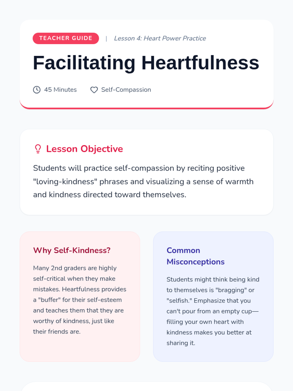 This sequence teaches 2nd-grade students how to use mindfulness for emotional regulation and kindness. Students explore their 'internal weather,' learn to use a 'pause button' for impulse control, visualize a safe place, and practice heartfulness by sending kind thoughts to themselves and others.