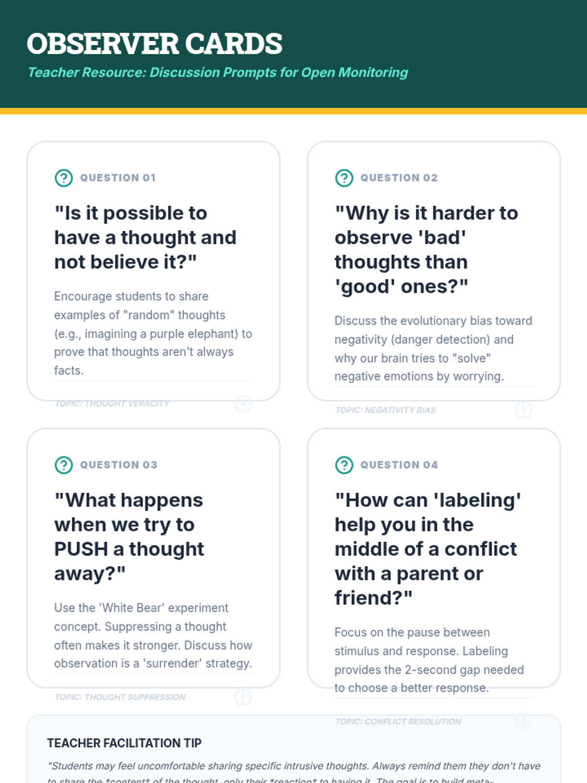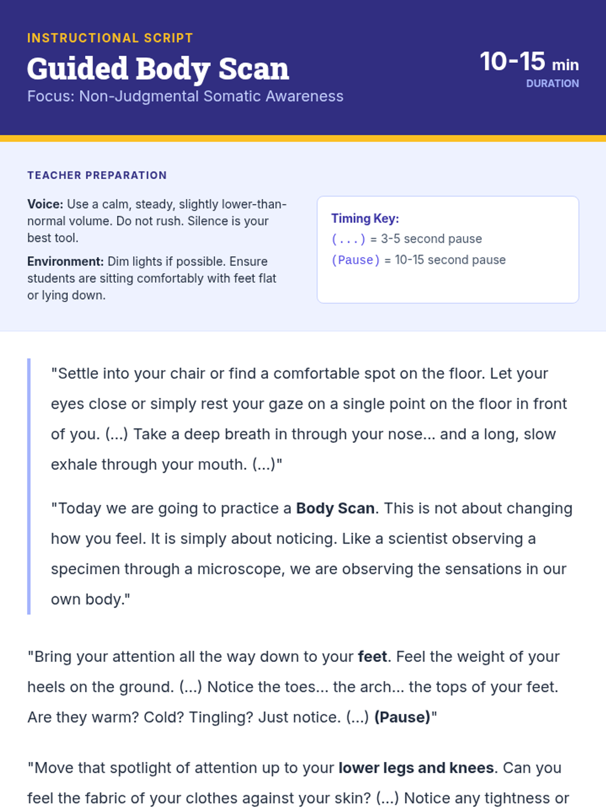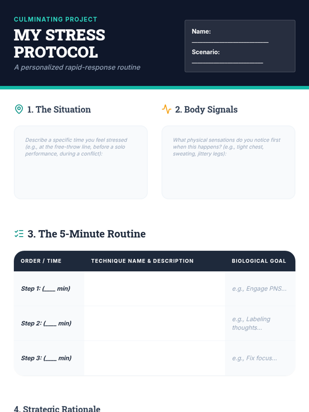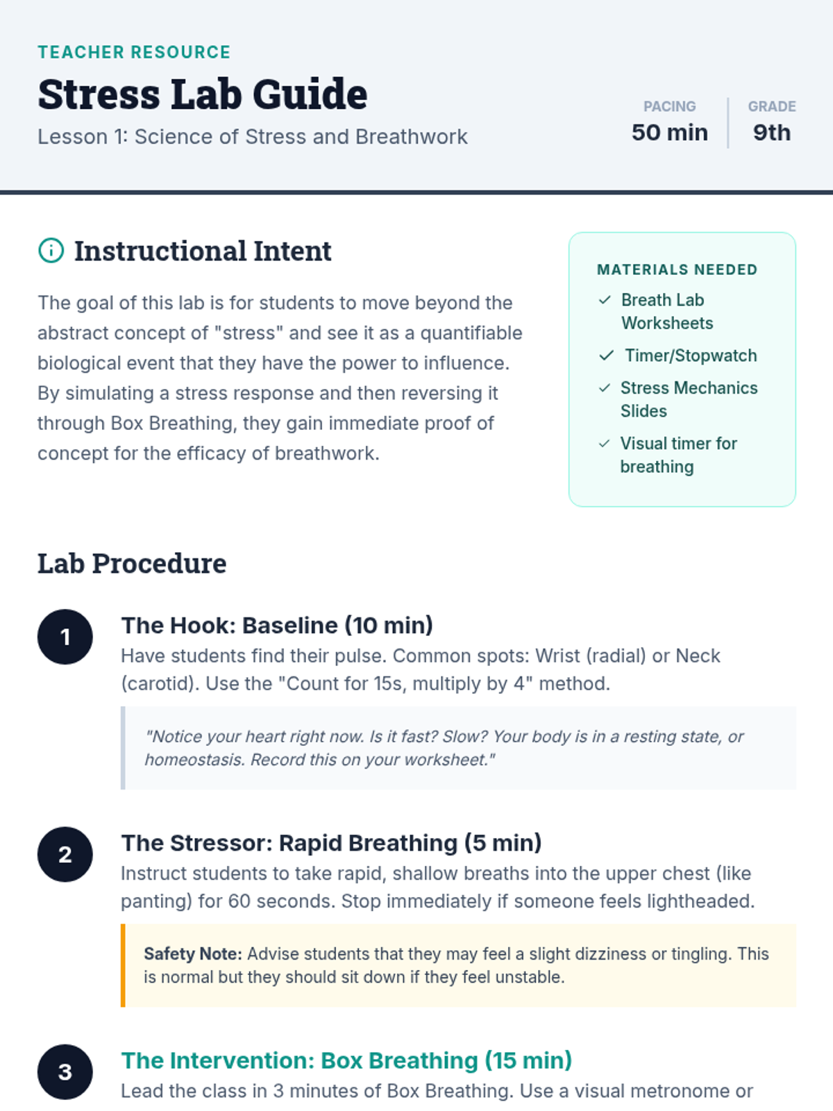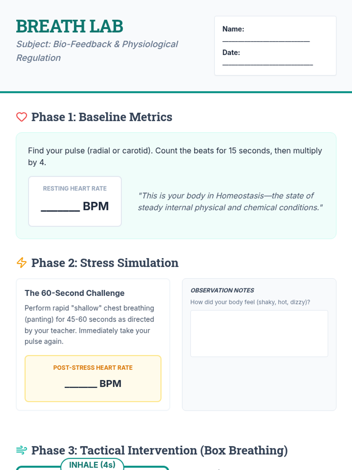 A comprehensive 9th-grade sequence exploring the neurobiology of stress and practical mindfulness techniques. Students learn to regulate their physiological responses through breathwork, body awareness, and cognitive reframing, culminating in a personalized stress-management protocol.