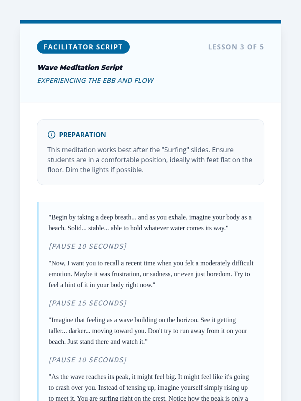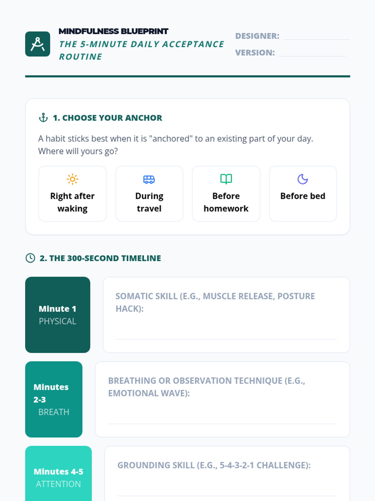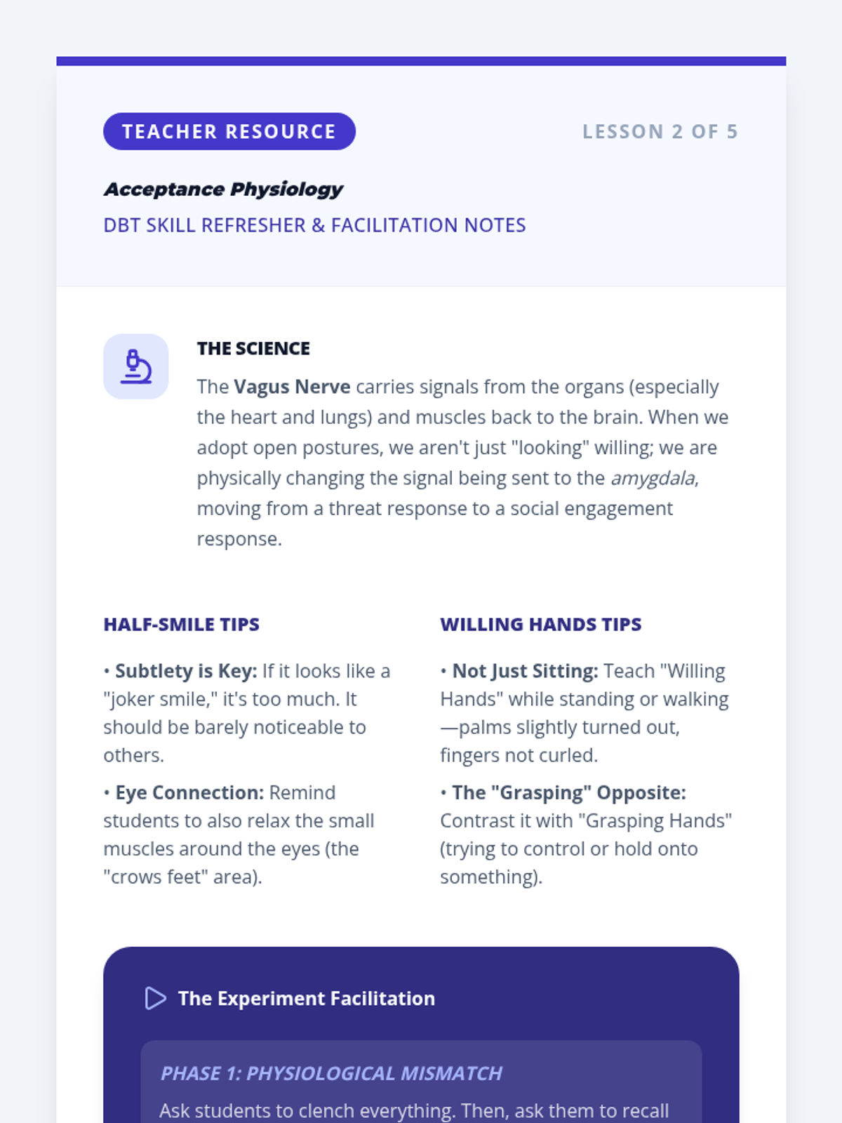 A 5-lesson sequence for 10th graders focusing on the somatic and experiential aspects of radical acceptance, moving from identifying physical resistance to building a personalized mindfulness routine.
