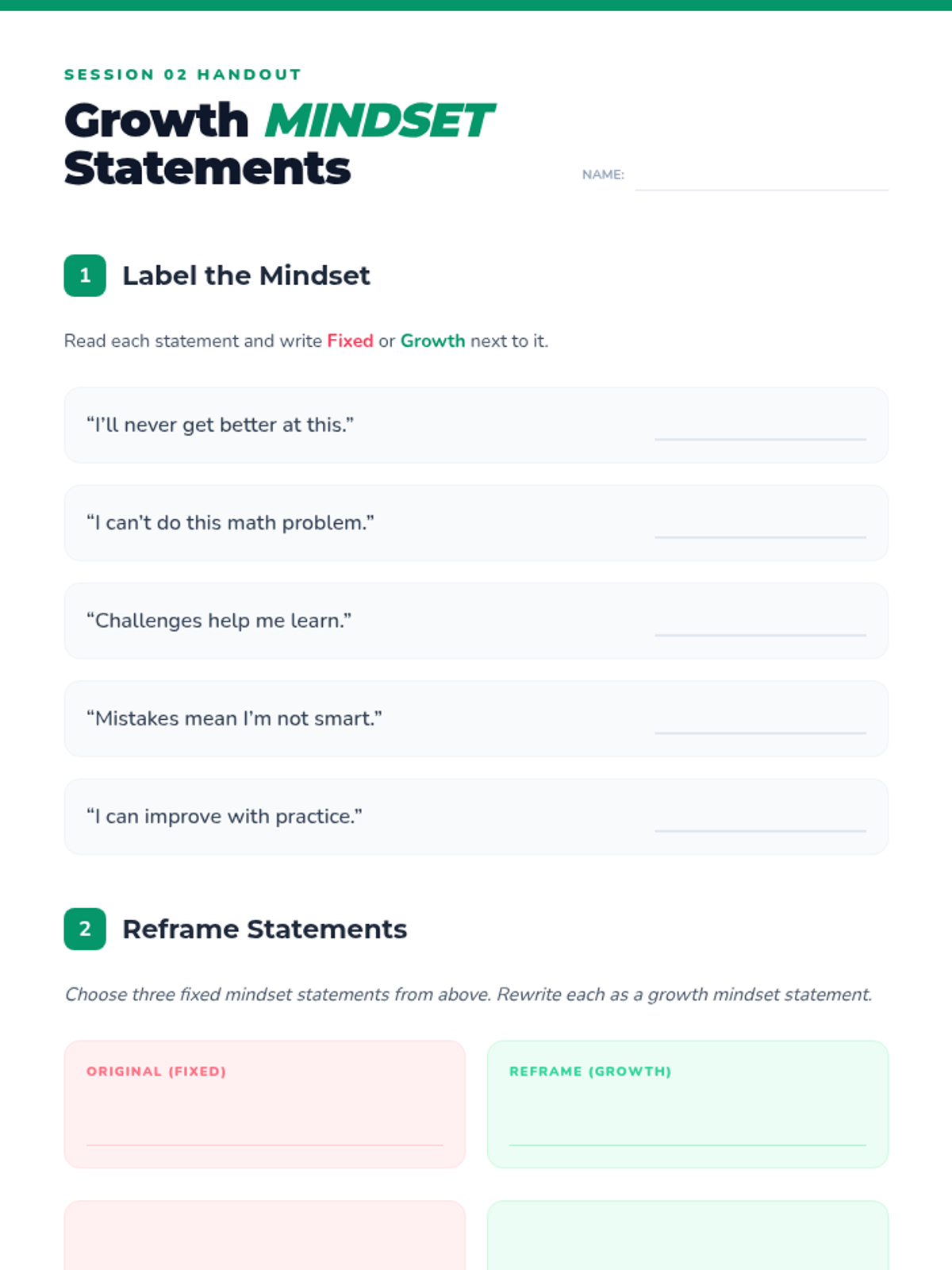 A 6-session small group series for 7th graders focused on managing anxiety and cultivating a growth mindset. Students learn practical strategies, reflect on real-life scenarios, and build resilience.