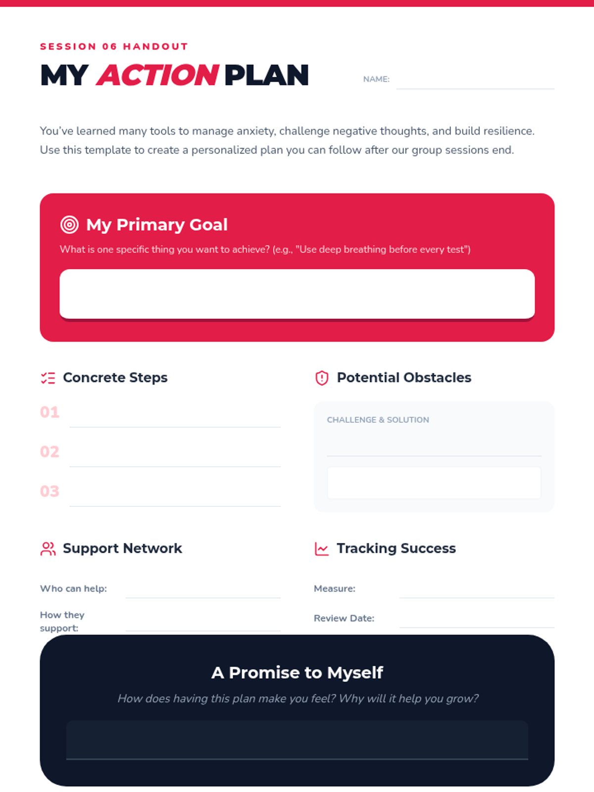 A 6-session counseling group designed to help students identify triggers, understand physical symptoms of anxiety, and build a personalized toolkit of coping strategies through a 'Calm Explorer' theme.