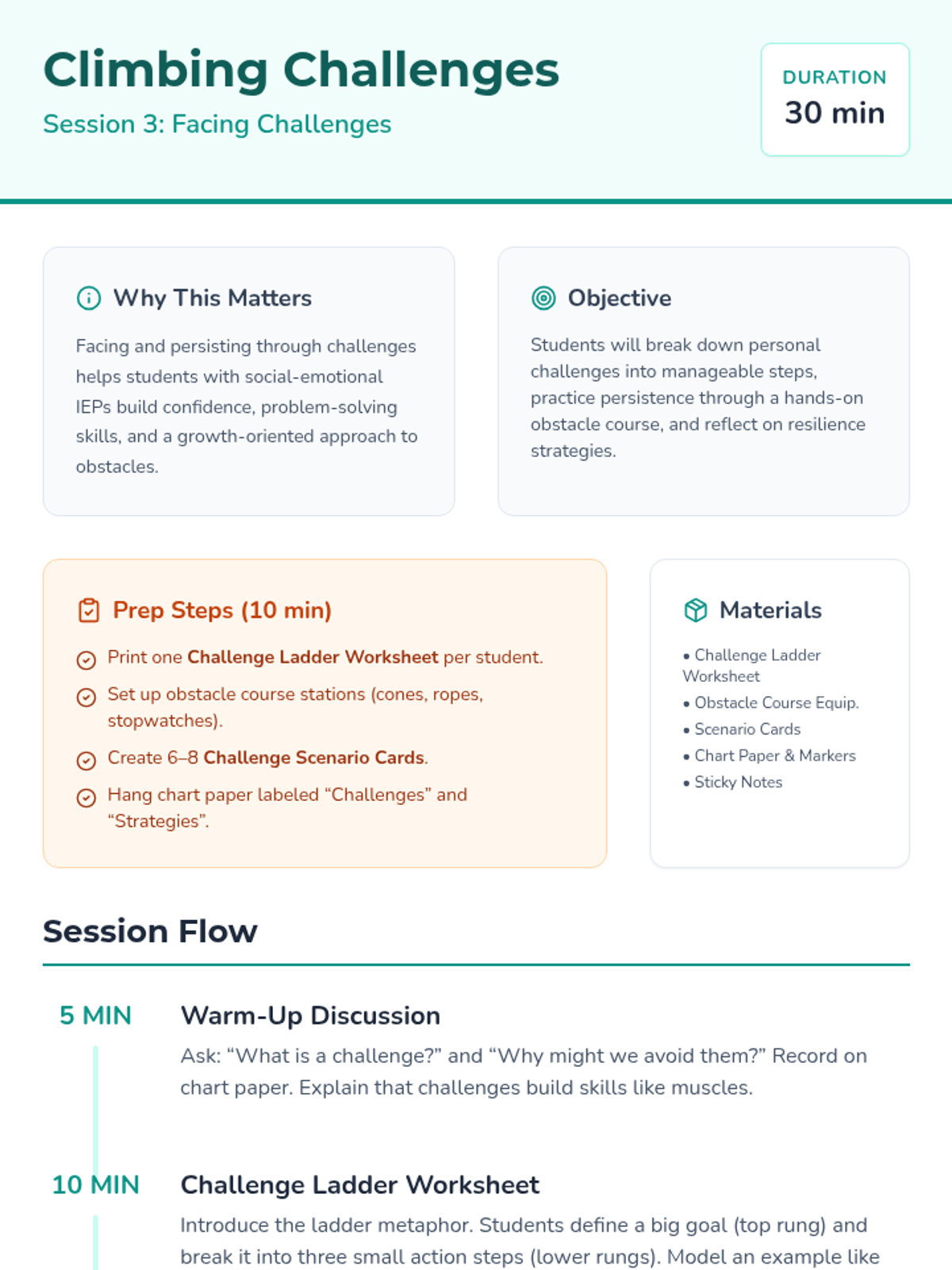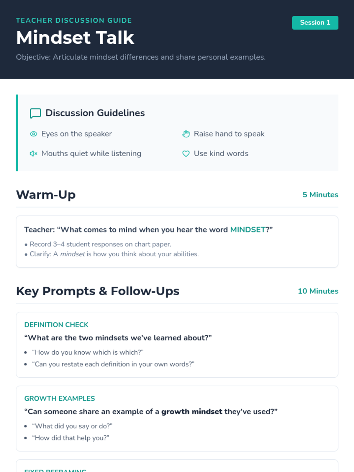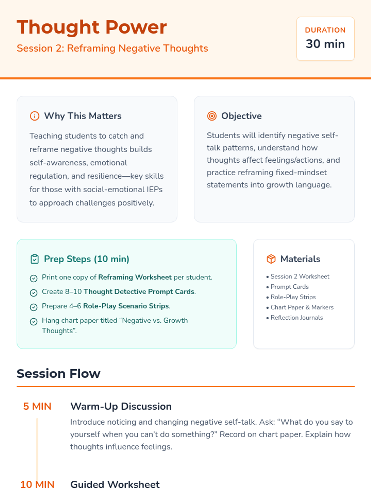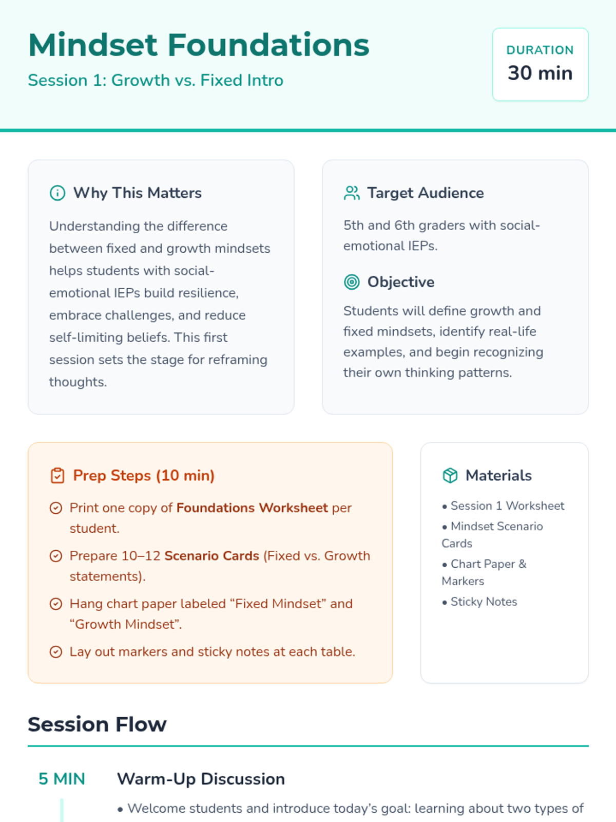 A 5-session small group series for 5th and 6th graders with social-emotional IEPs to explore growth vs. fixed mindsets, learn to reframe negative thoughts, and practice resilience.
