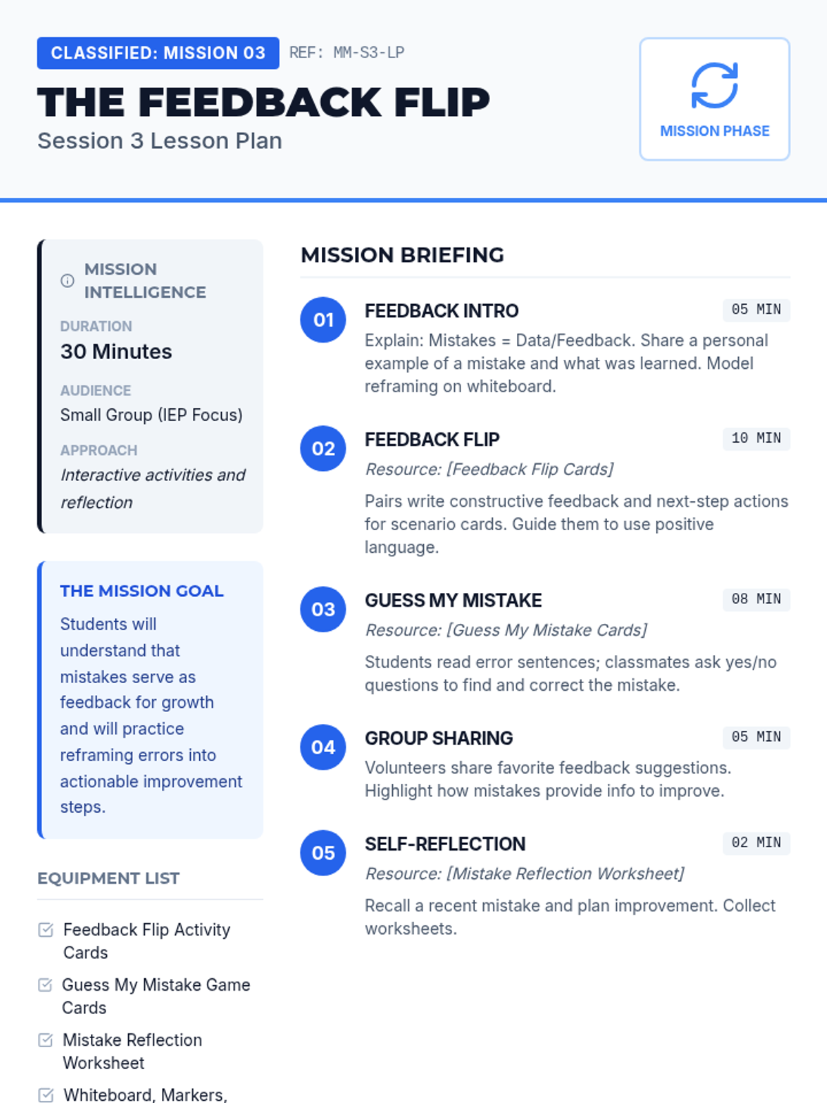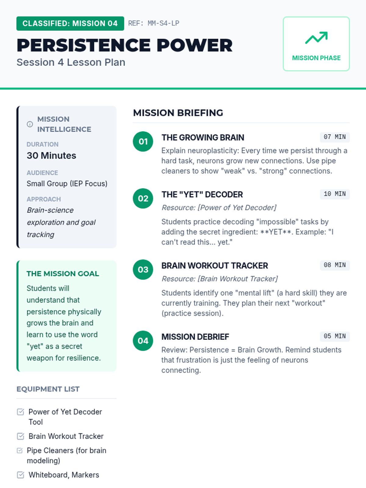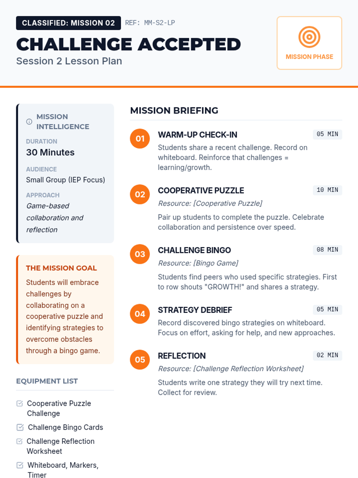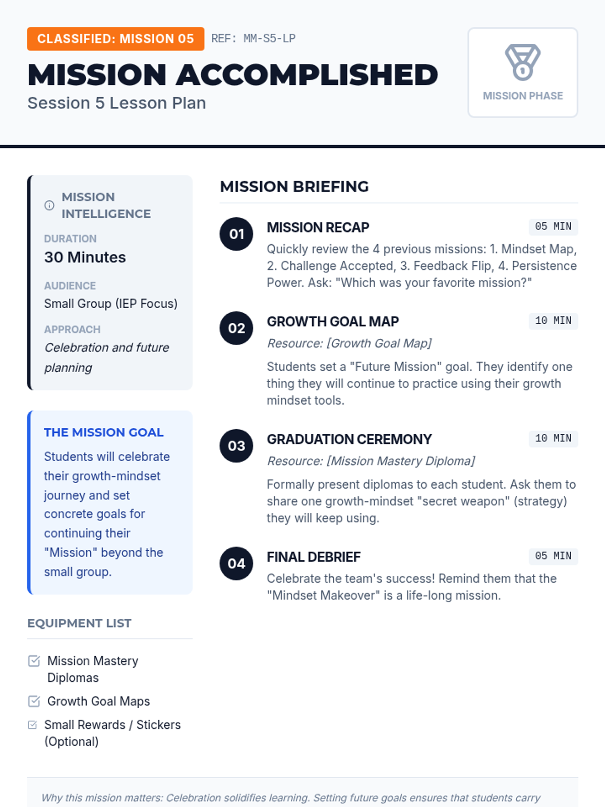 A 5-session small-group journey teaching students with IEPs how to shift from a fixed to growth mindset through interactive missions. Sessions focus on mindset types, challenges, mistakes, persistence, and goal setting.