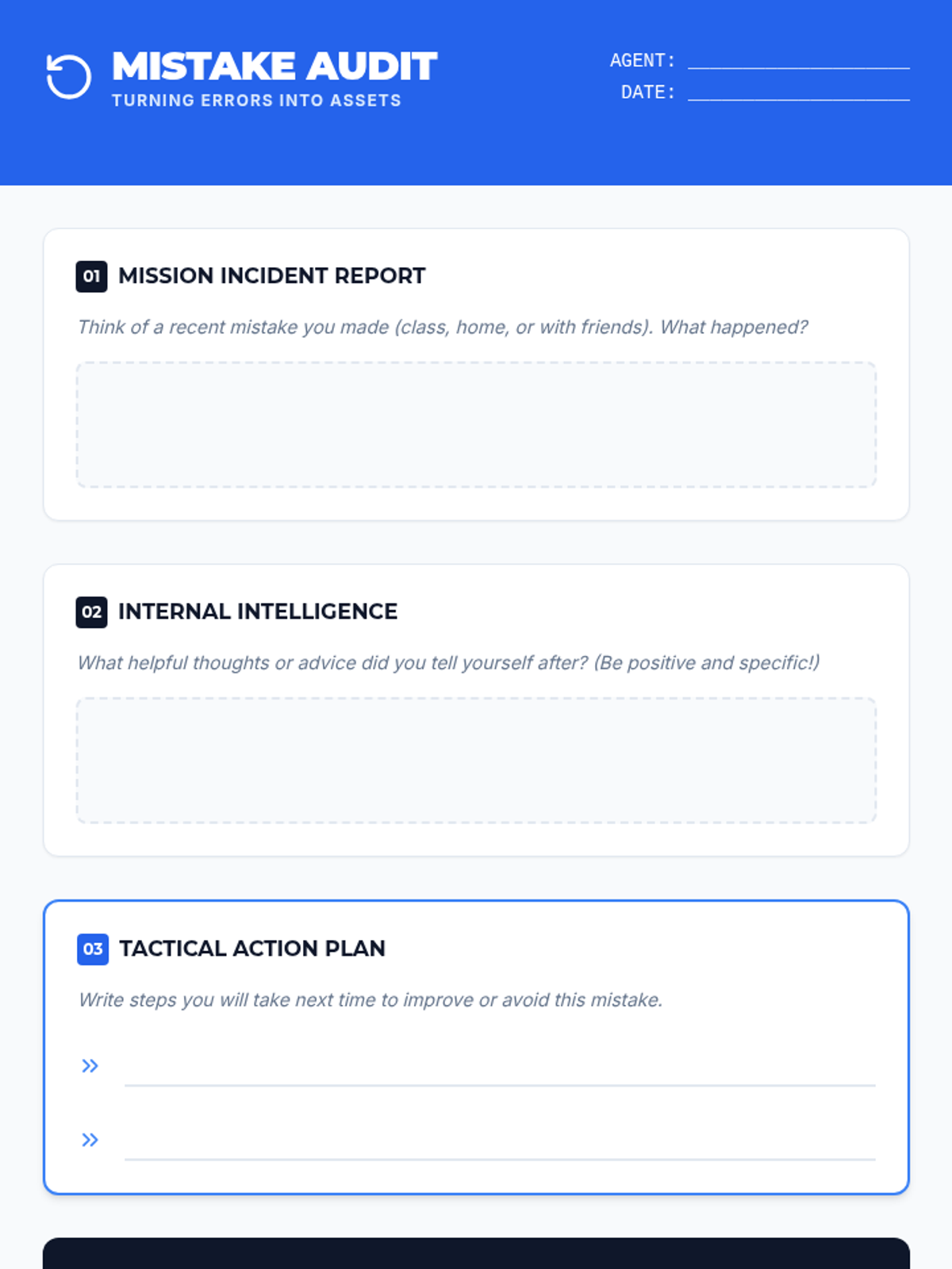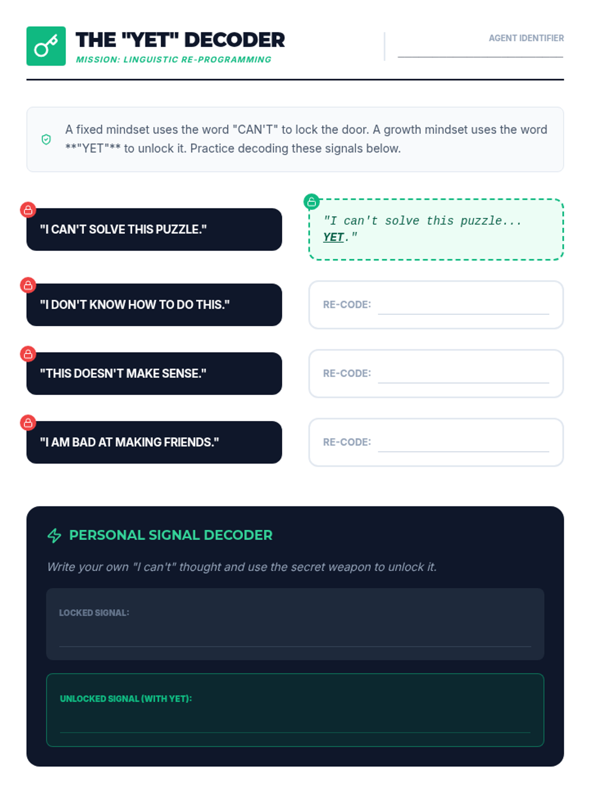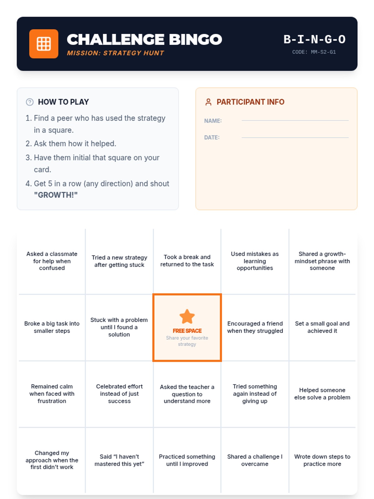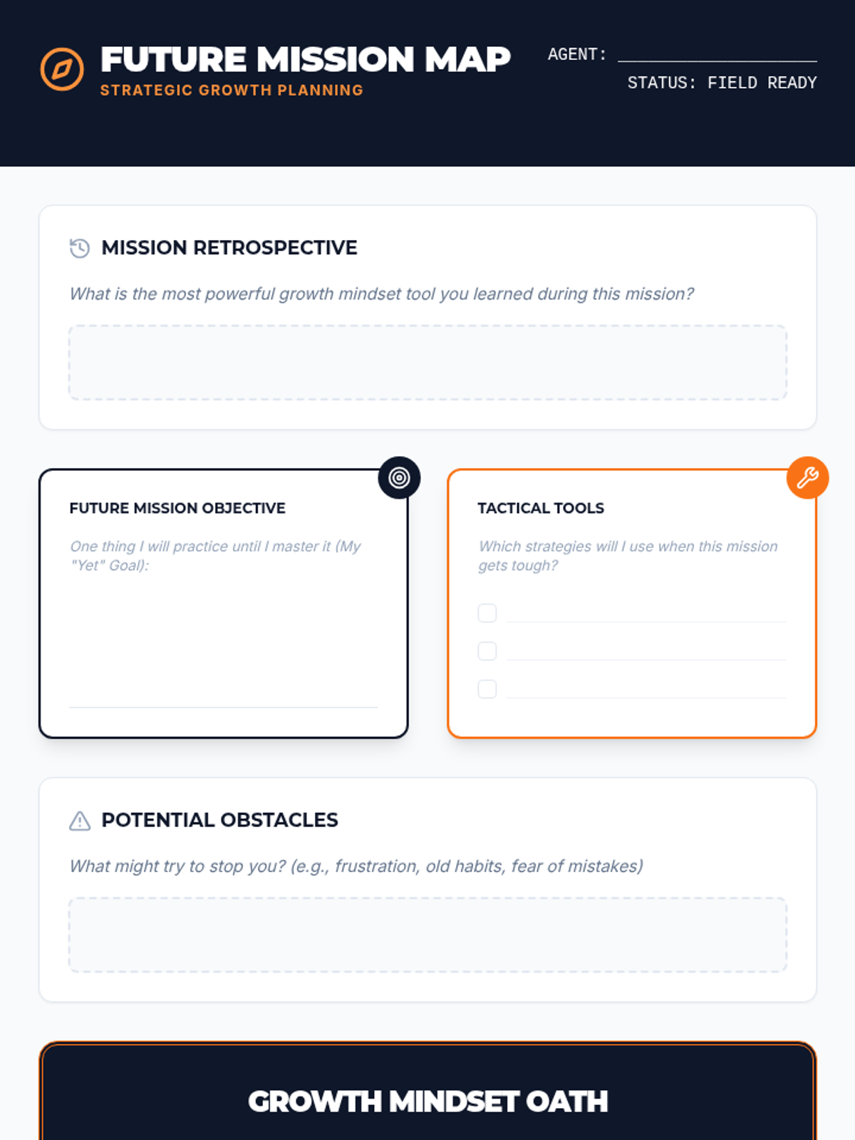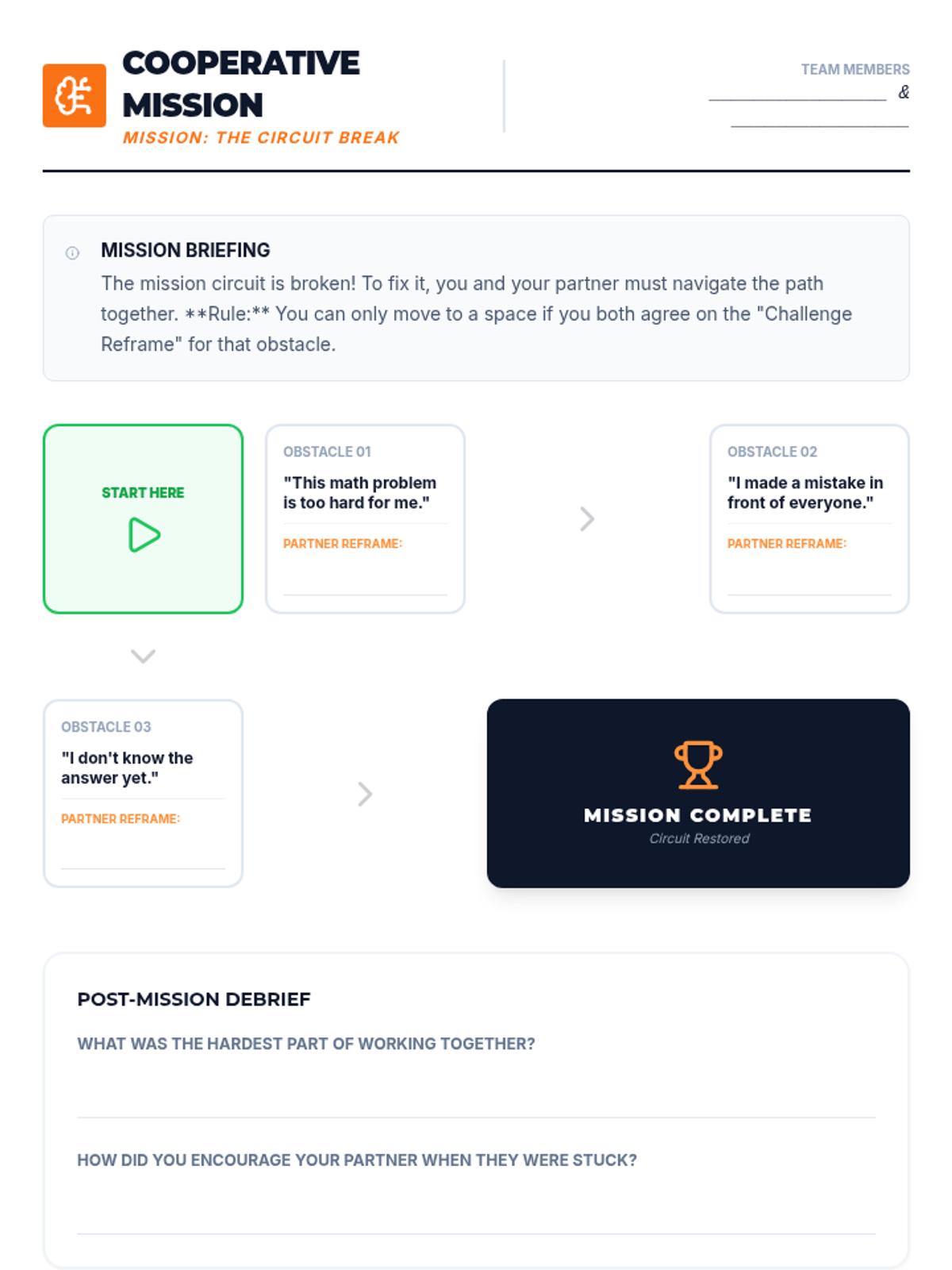 A 5-session small-group journey teaching students with IEPs how to shift from a fixed to growth mindset through interactive missions. Sessions focus on mindset types, challenges, mistakes, persistence, and goal setting.
