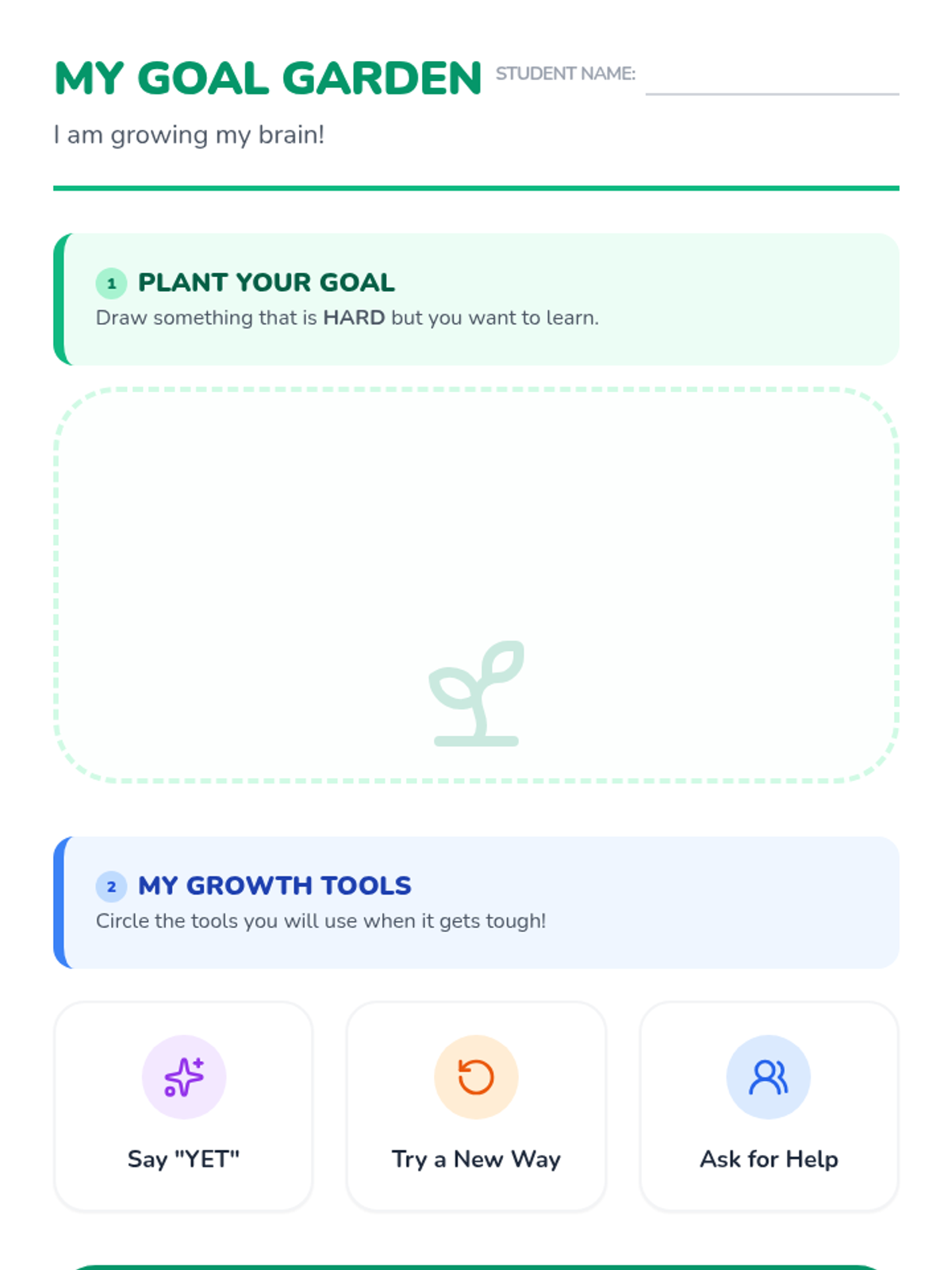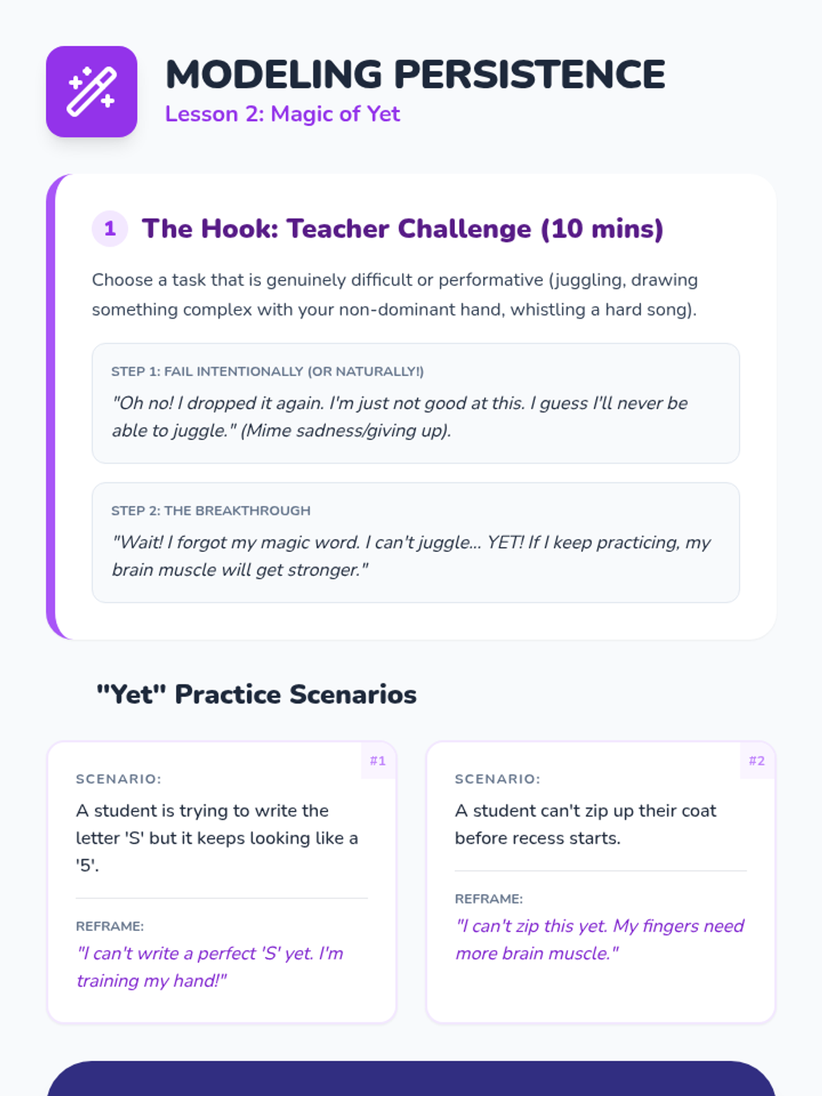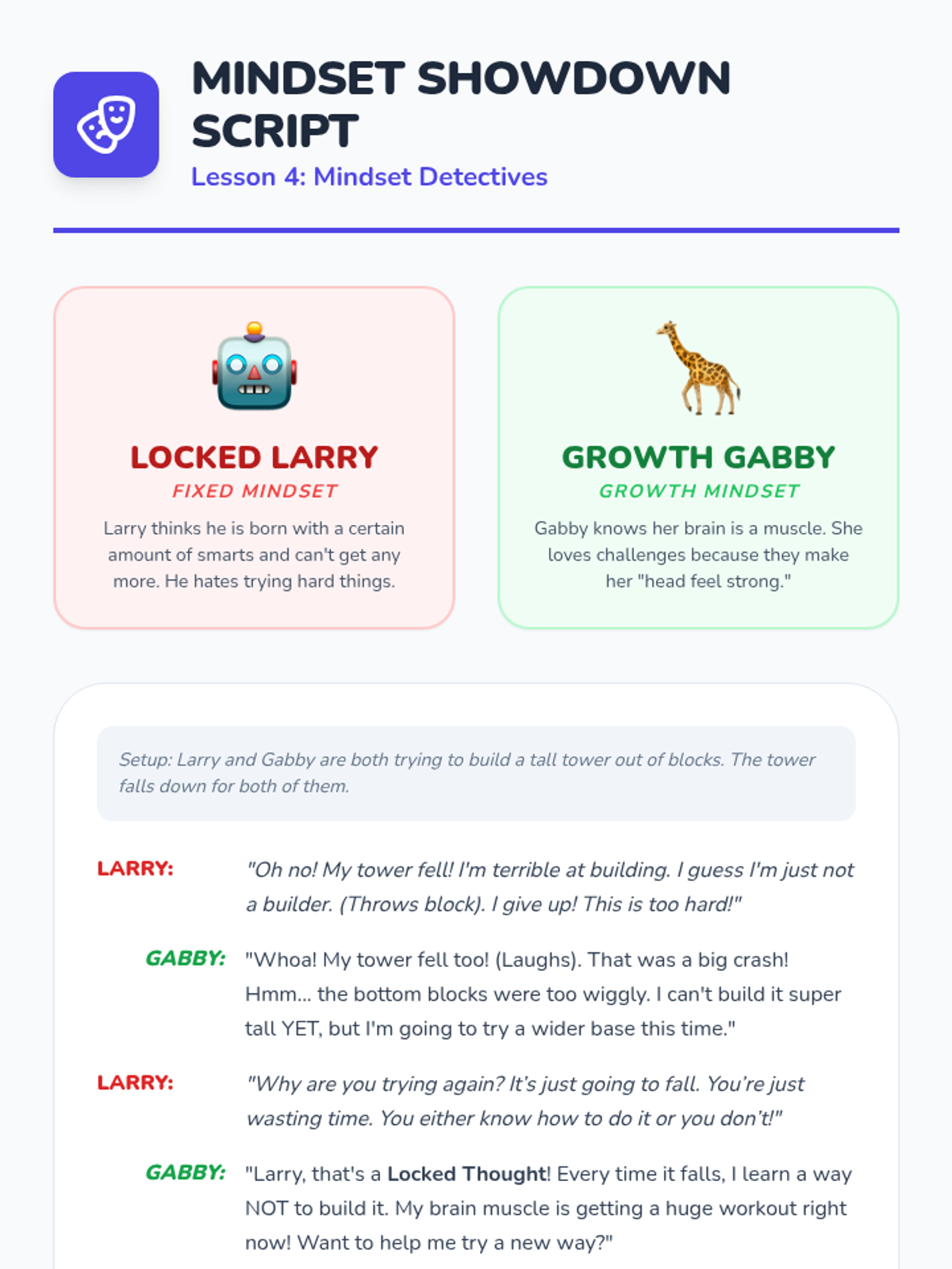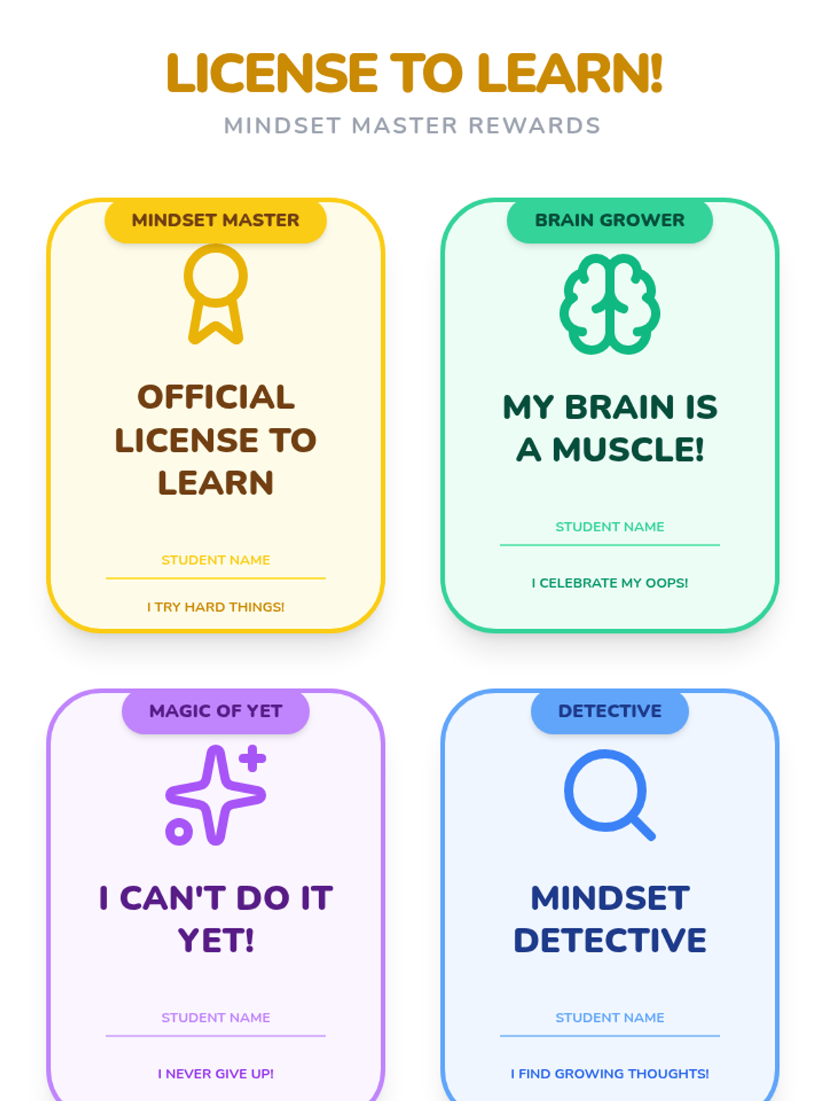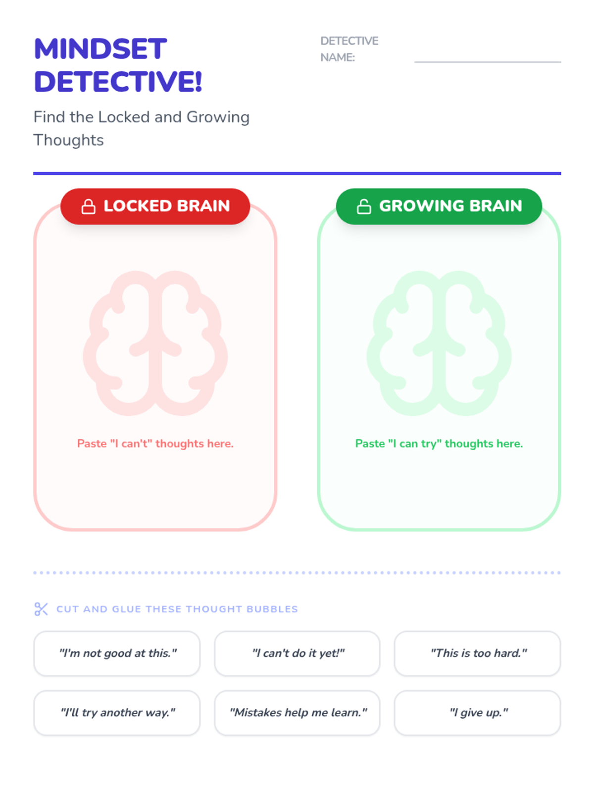 A 5-lesson unit for Kindergarten students focused on developing a growth mindset. Students learn about brain plasticity, the transformative power of the word 'yet', how to view mistakes as learning opportunities, and how to replace fixed mindset thoughts with growth-oriented ones.