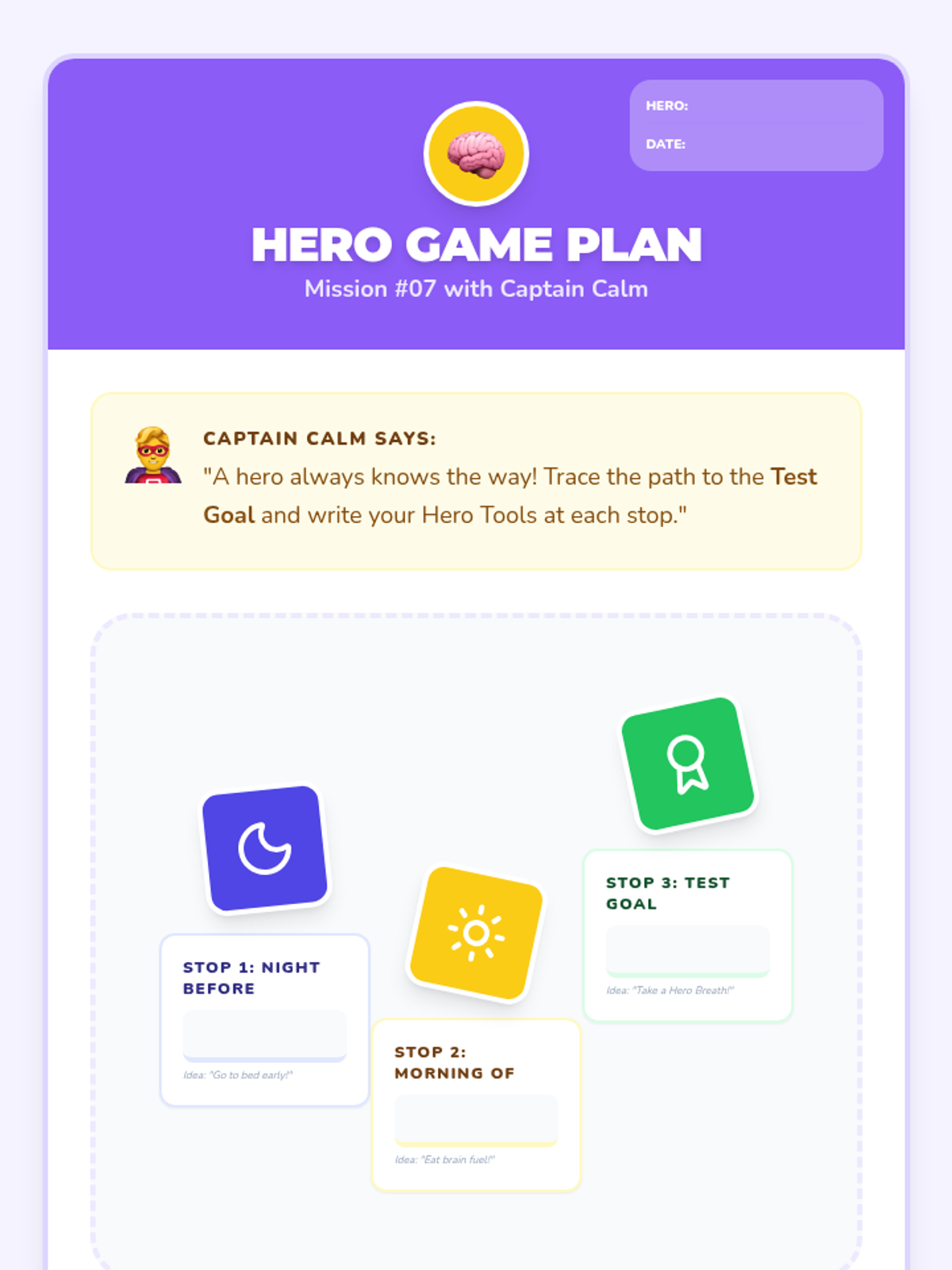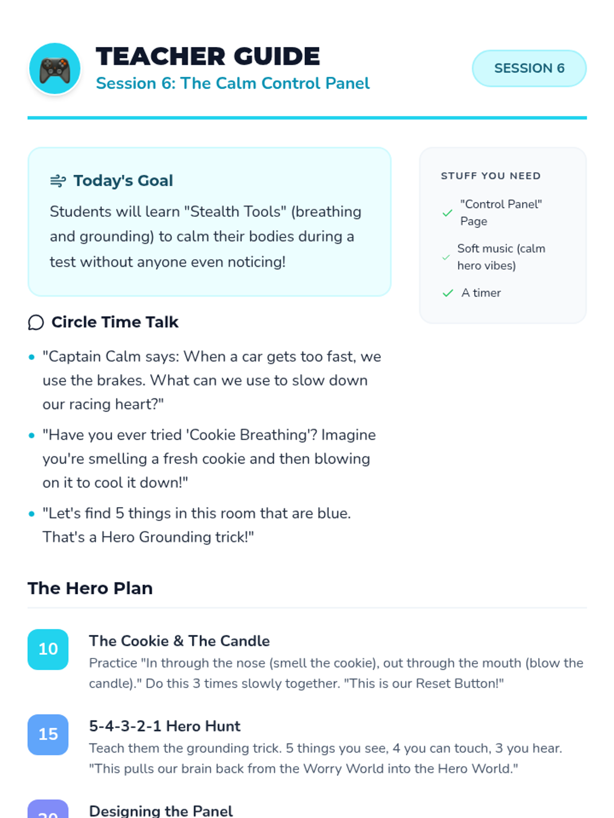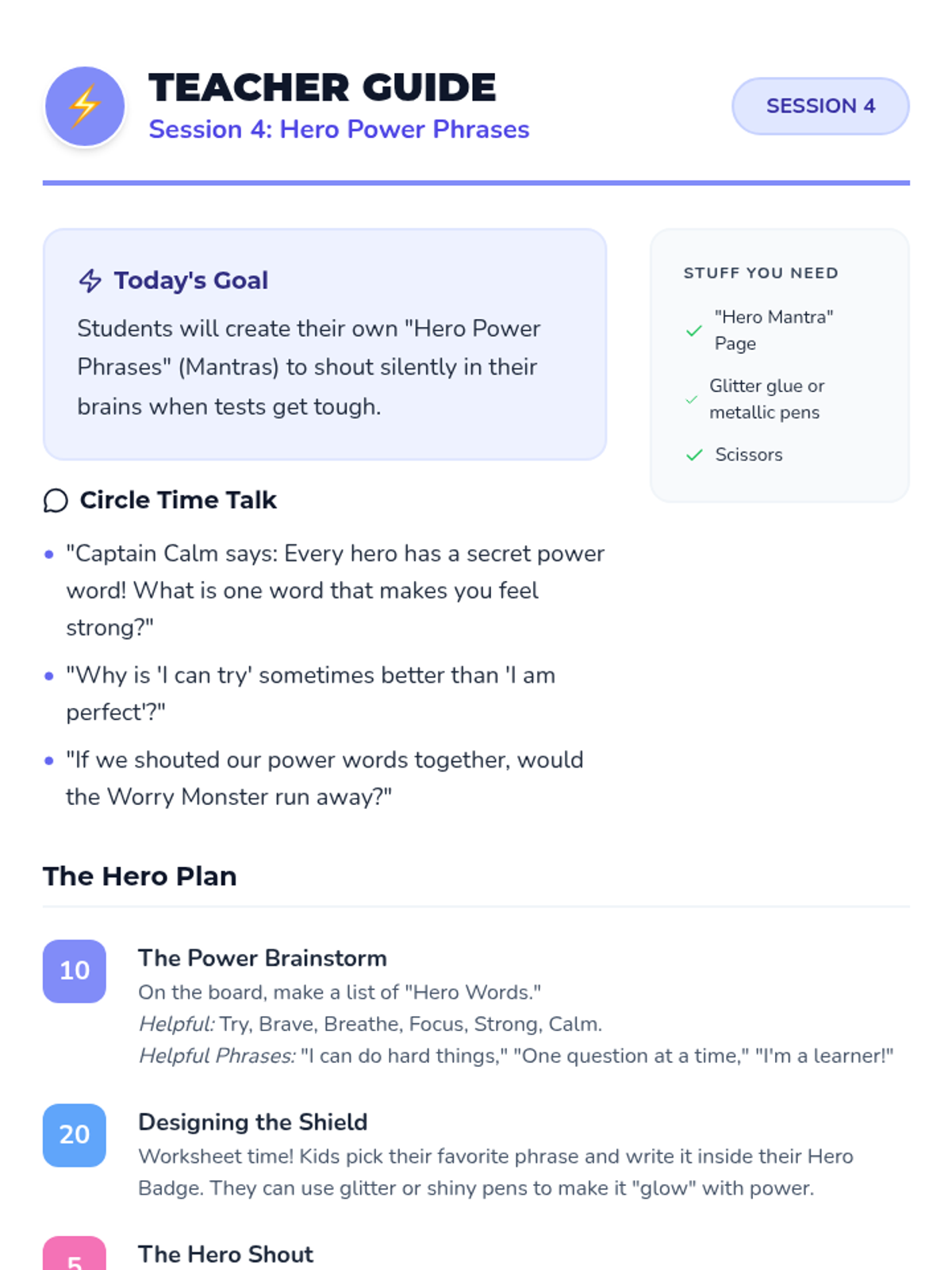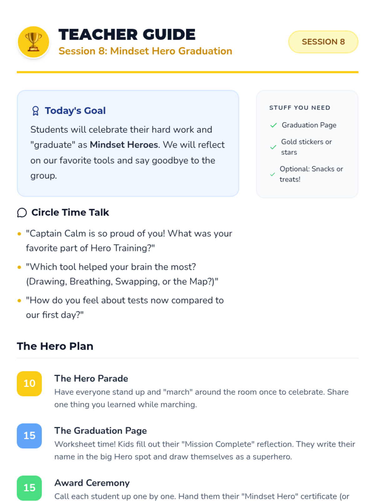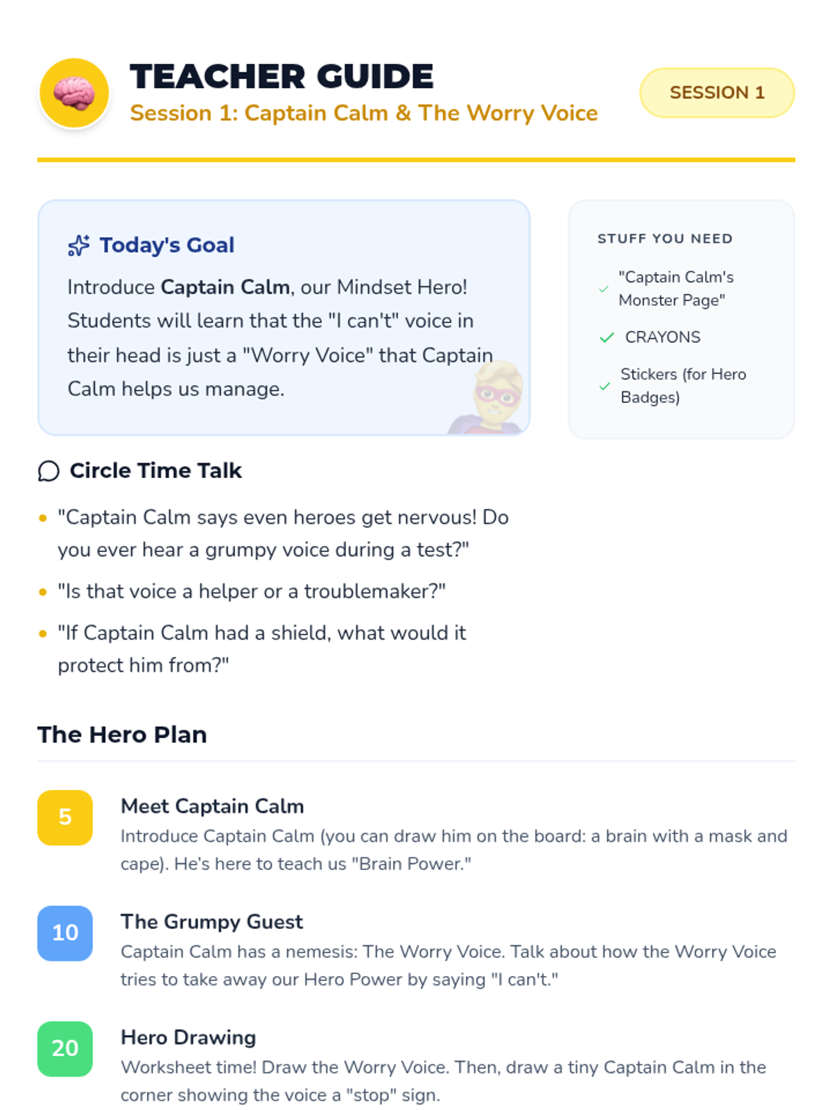 An 8-session counseling group for 2nd and 3rd graders to tackle test anxiety. Guided by Captain Calm, the Mindset Hero, students learn to spot their "Worry Voice," listen to their body, and use "Power Words" and "Chill-Out Tools" to feel brave and ready for tests.