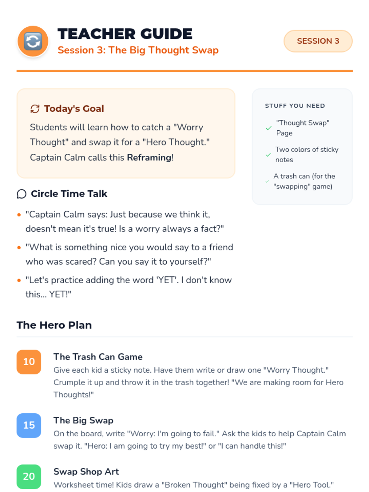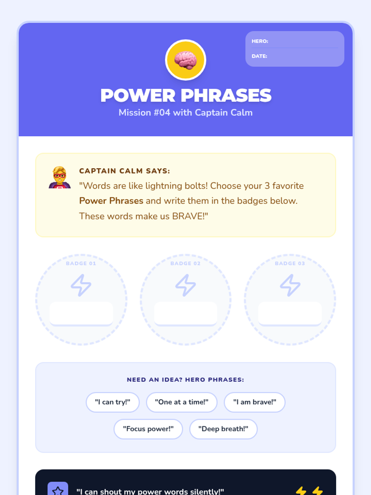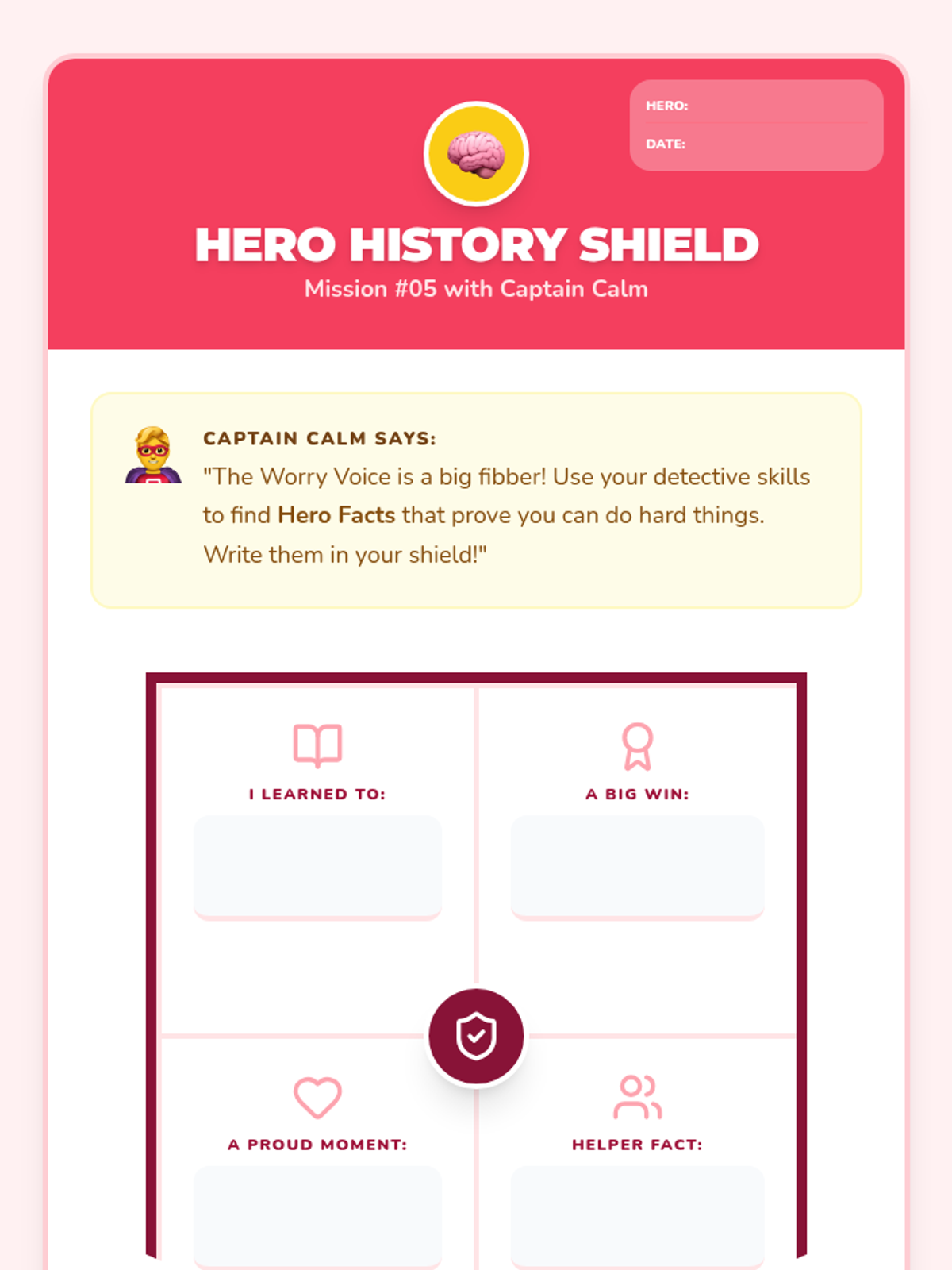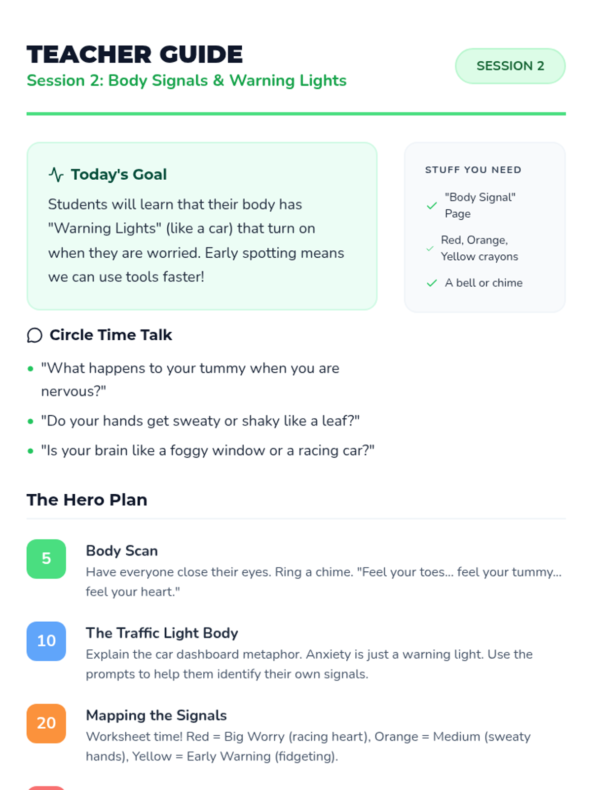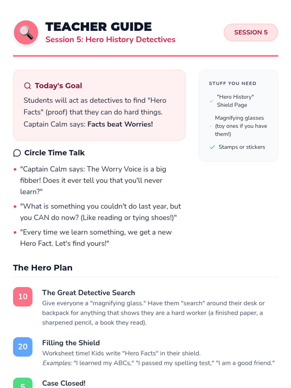 An 8-session counseling group for 2nd and 3rd graders to tackle test anxiety. Guided by Captain Calm, the Mindset Hero, students learn to spot their "Worry Voice," listen to their body, and use "Power Words" and "Chill-Out Tools" to feel brave and ready for tests.
