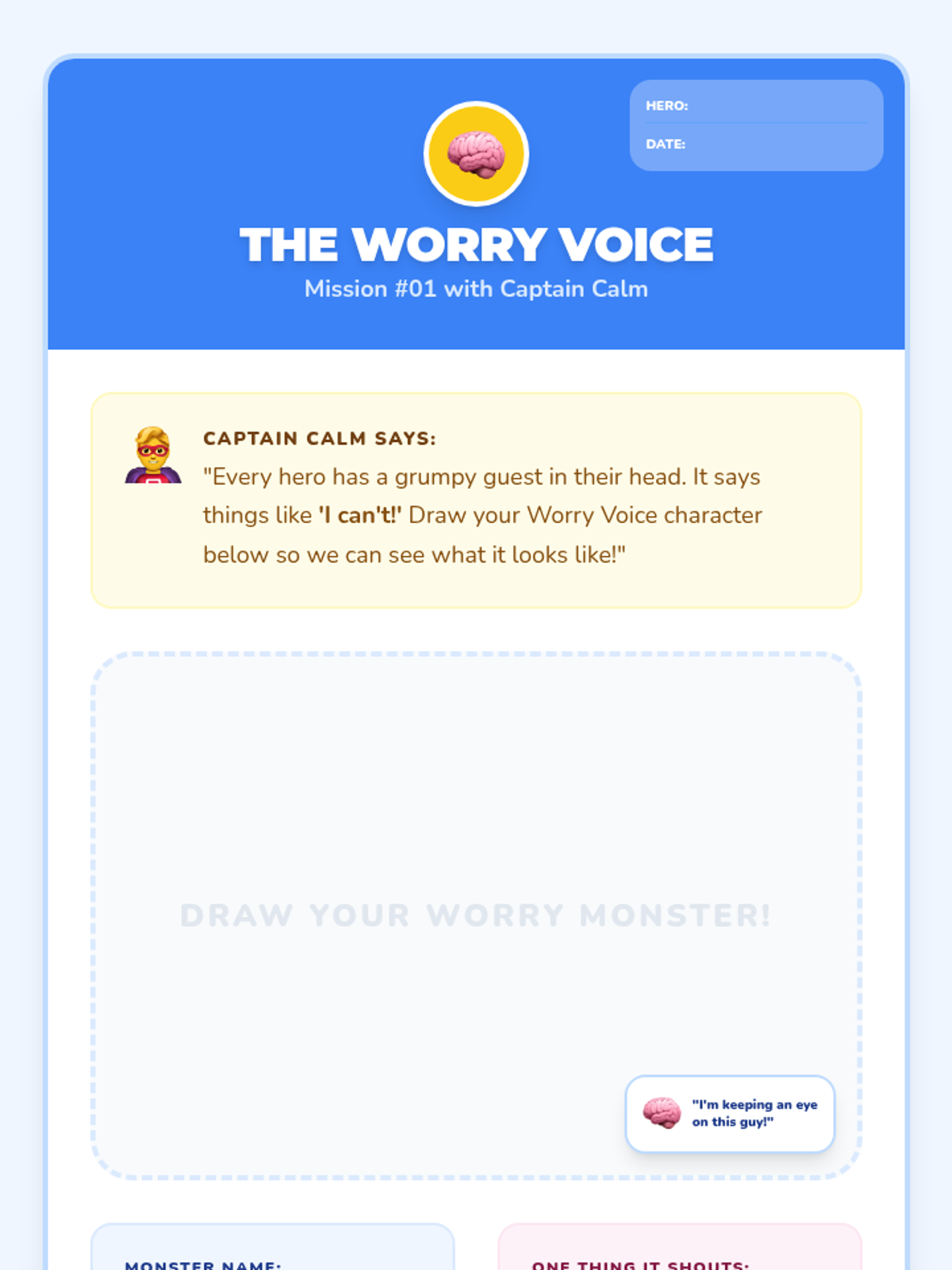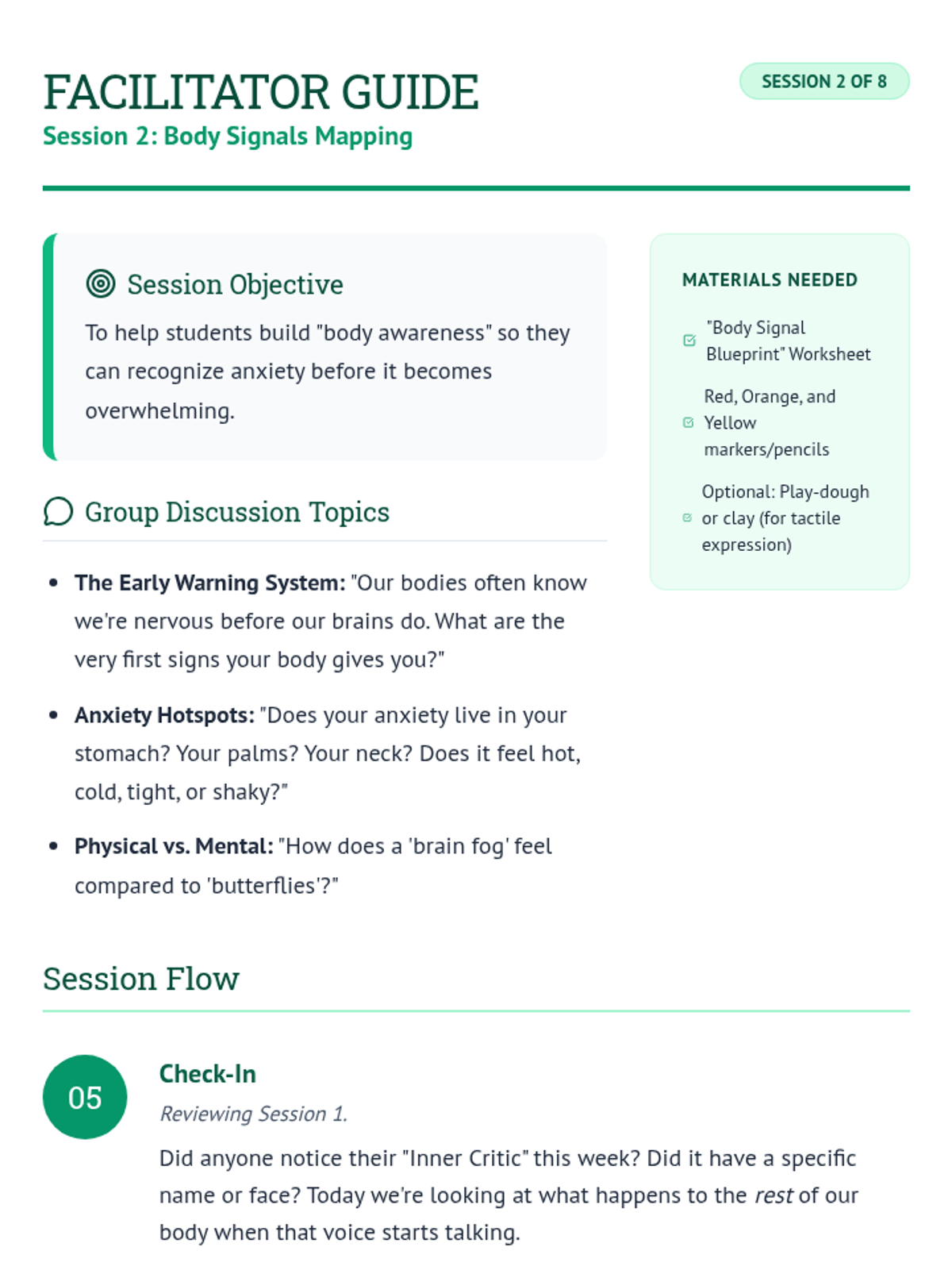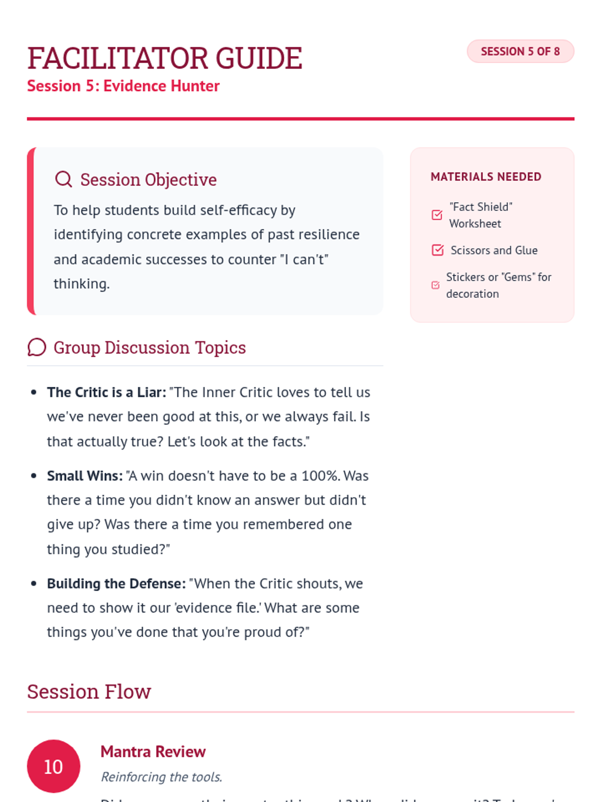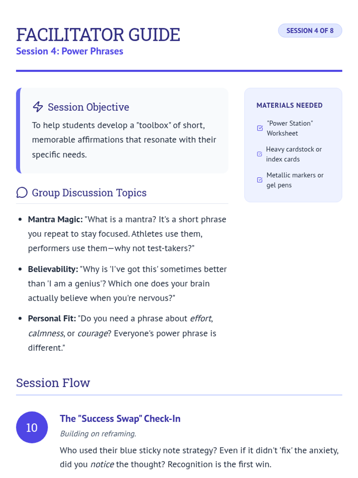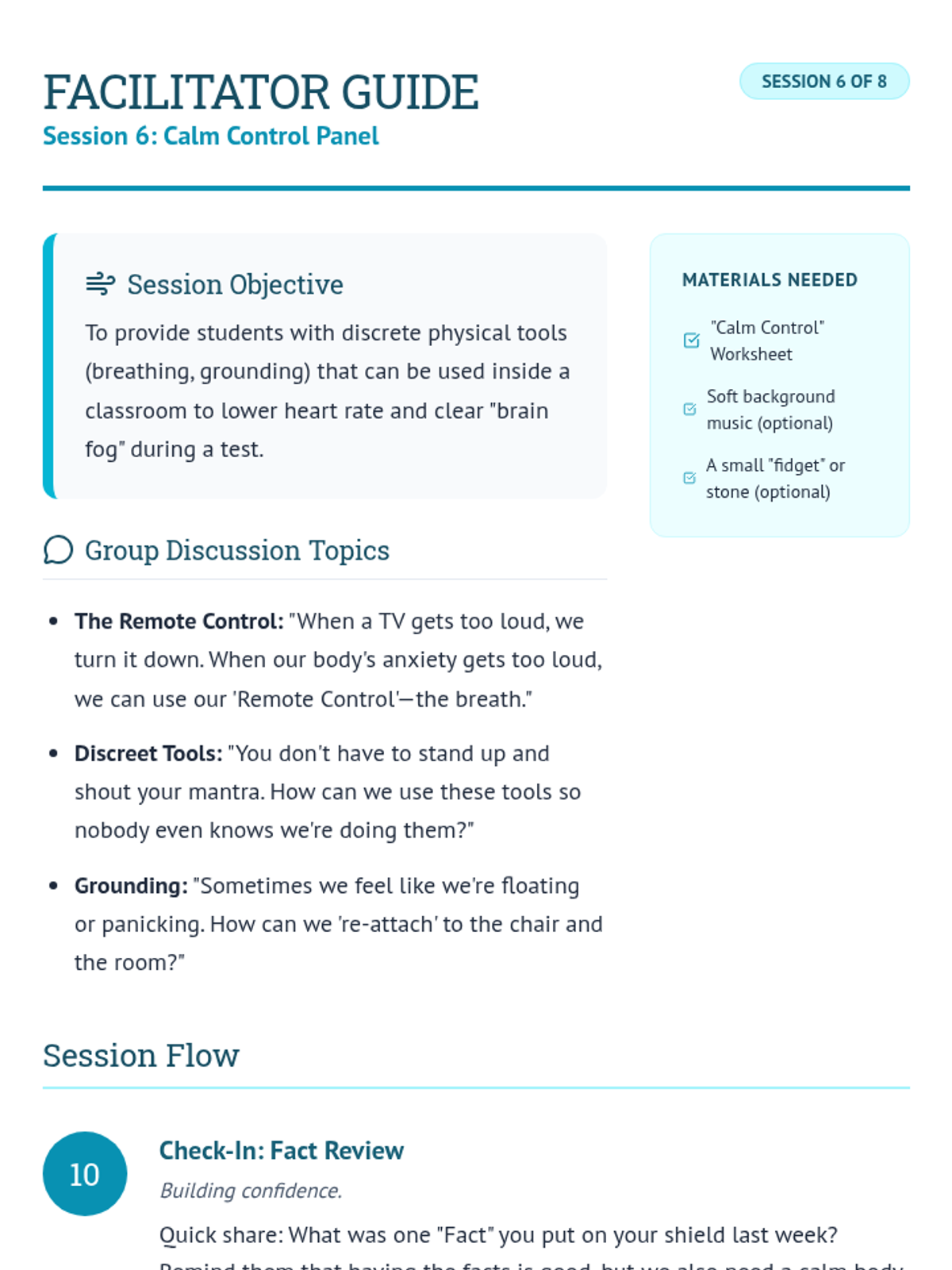 An 8-session counseling group for 2nd and 3rd graders to tackle test anxiety. Guided by Captain Calm, the Mindset Hero, students learn to spot their "Worry Voice," listen to their body, and use "Power Words" and "Chill-Out Tools" to feel brave and ready for tests.