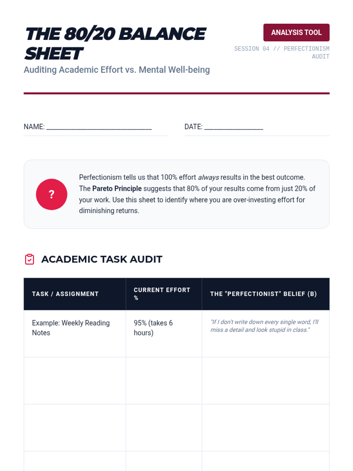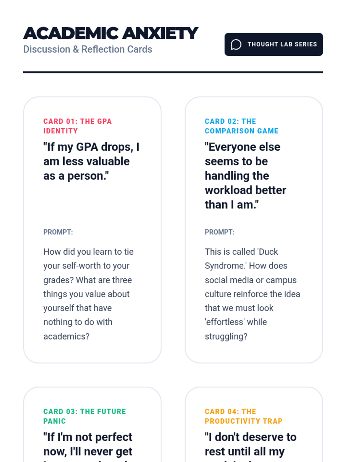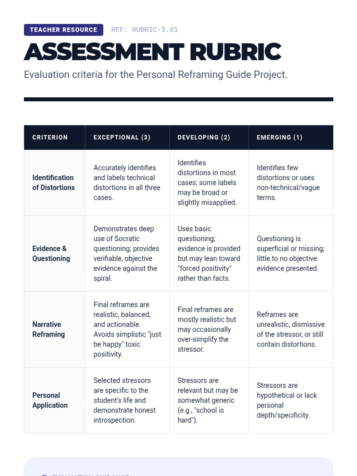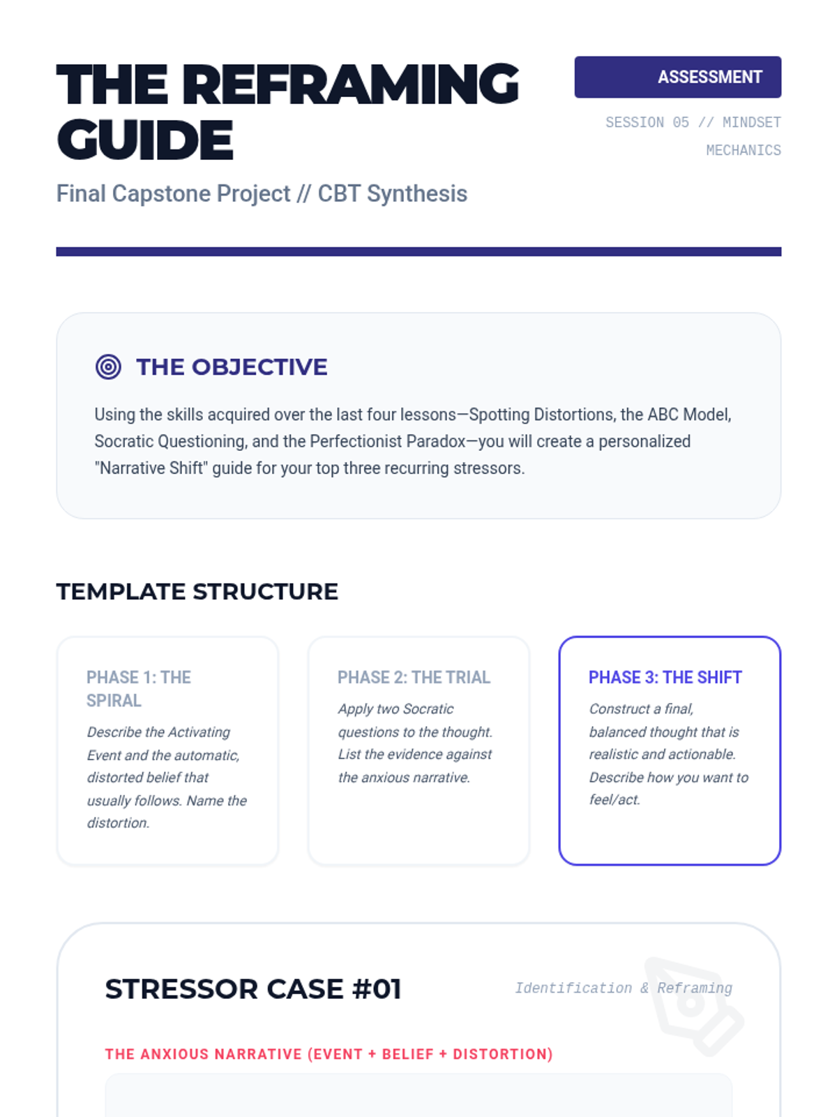 A comprehensive workshop-style sequence for undergraduate students to master cognitive reframing techniques. Students progress from identifying distortions to deconstructing beliefs and building resilient internal narratives.