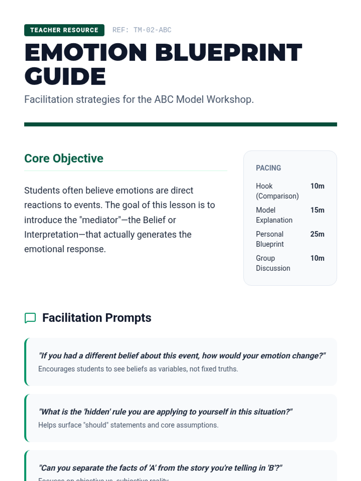 A 4-week counseling series for high school seniors focused on emotional literacy and expression. Using a 'Personal Blueprint' theme, the sequence treats emotions as data points and internal systems to help remove the stigma of sensitivity and focus on self-mastery.