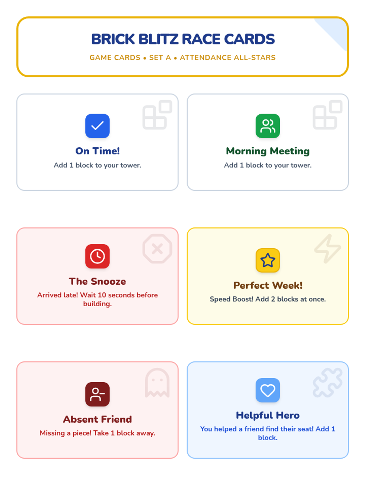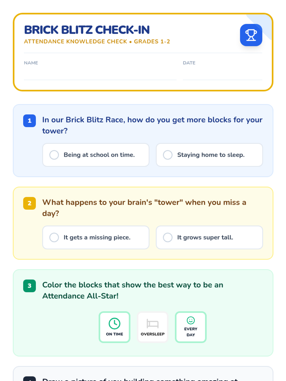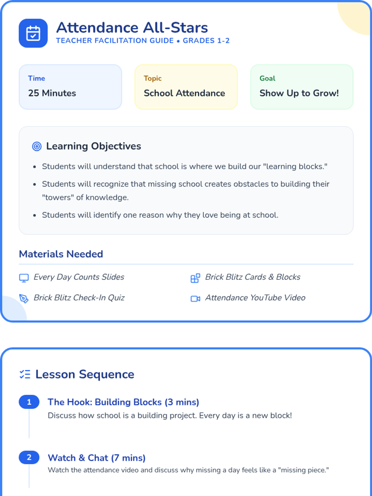 A pair of lessons designed to teach 1st-4th graders the importance of school attendance. The lessons use a 'Building Blocks' theme to show how every day helps build knowledge and friendships.