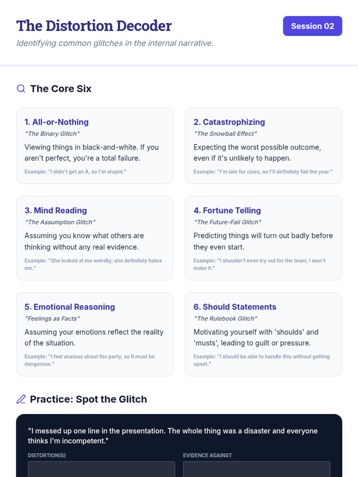 A comprehensive 6-session individual counseling curriculum for 11th-grade students focusing on cognitive distortions, reframing, problem-solving, and assertive self-advocacy to improve social-emotional well-being.
