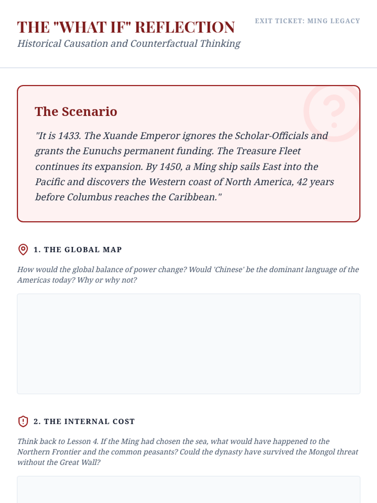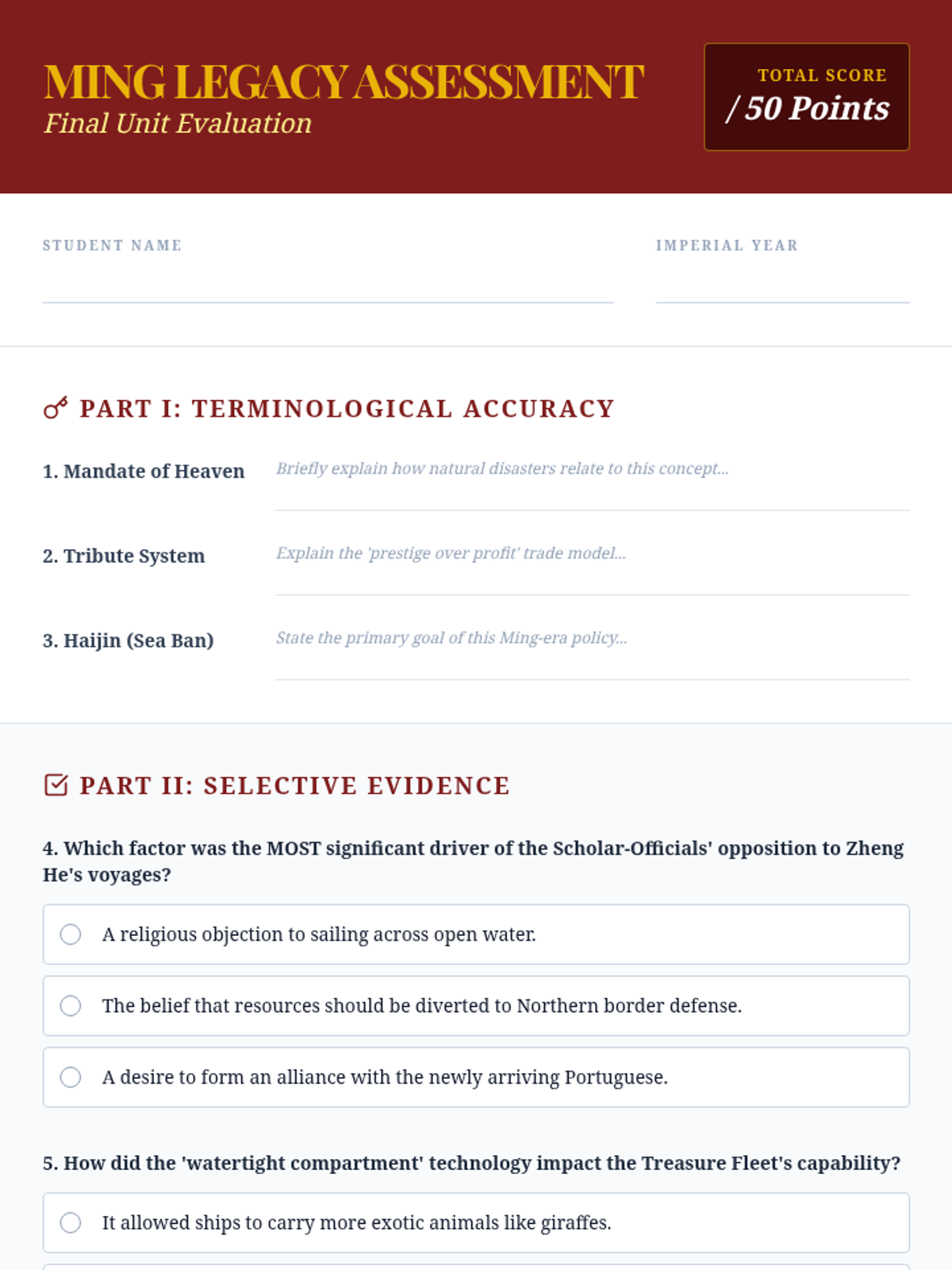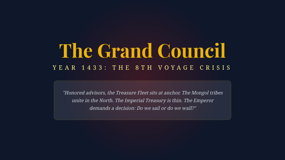 This sequence explores the early Ming Dynasty's shift from unprecedented maritime exploration to strict isolationism. Students analyze the reign of Hongwu, the massive Treasure Fleets of Zheng He, and the internal court conflicts between Eunuchs and Scholar-Officials that ultimately changed the course of global history.