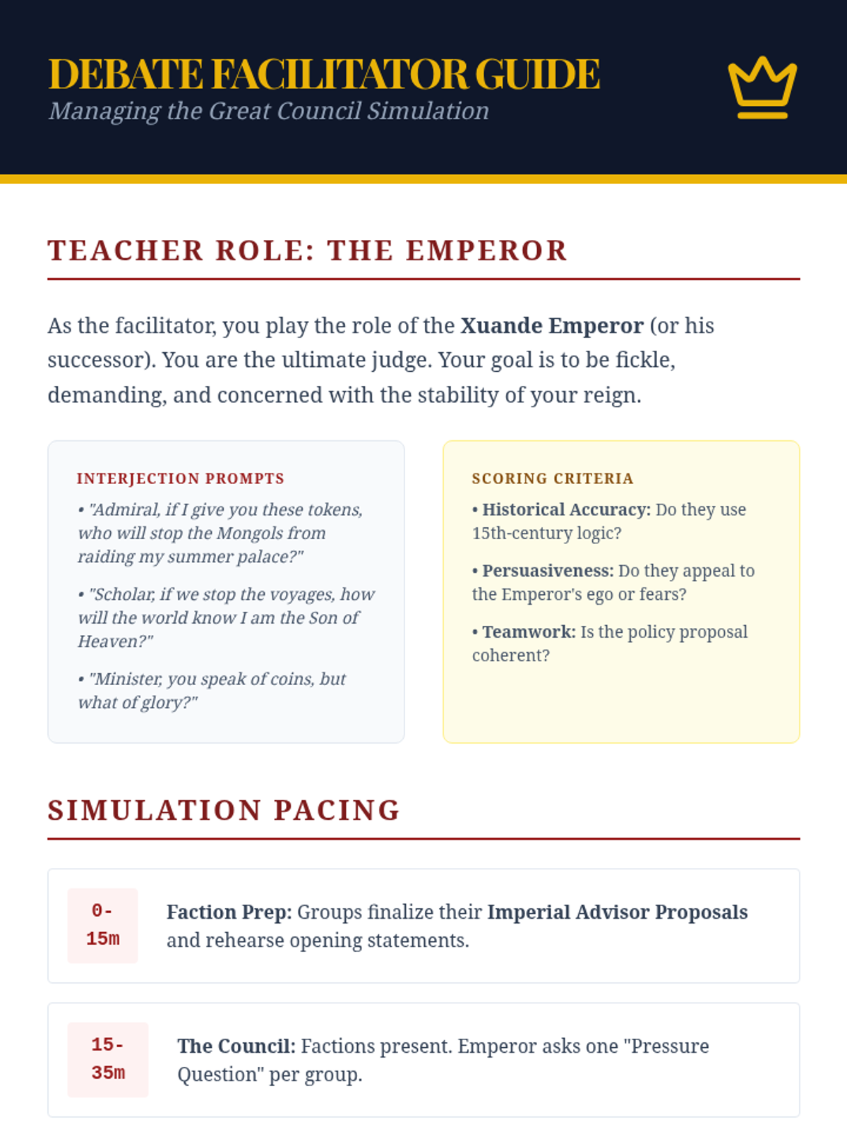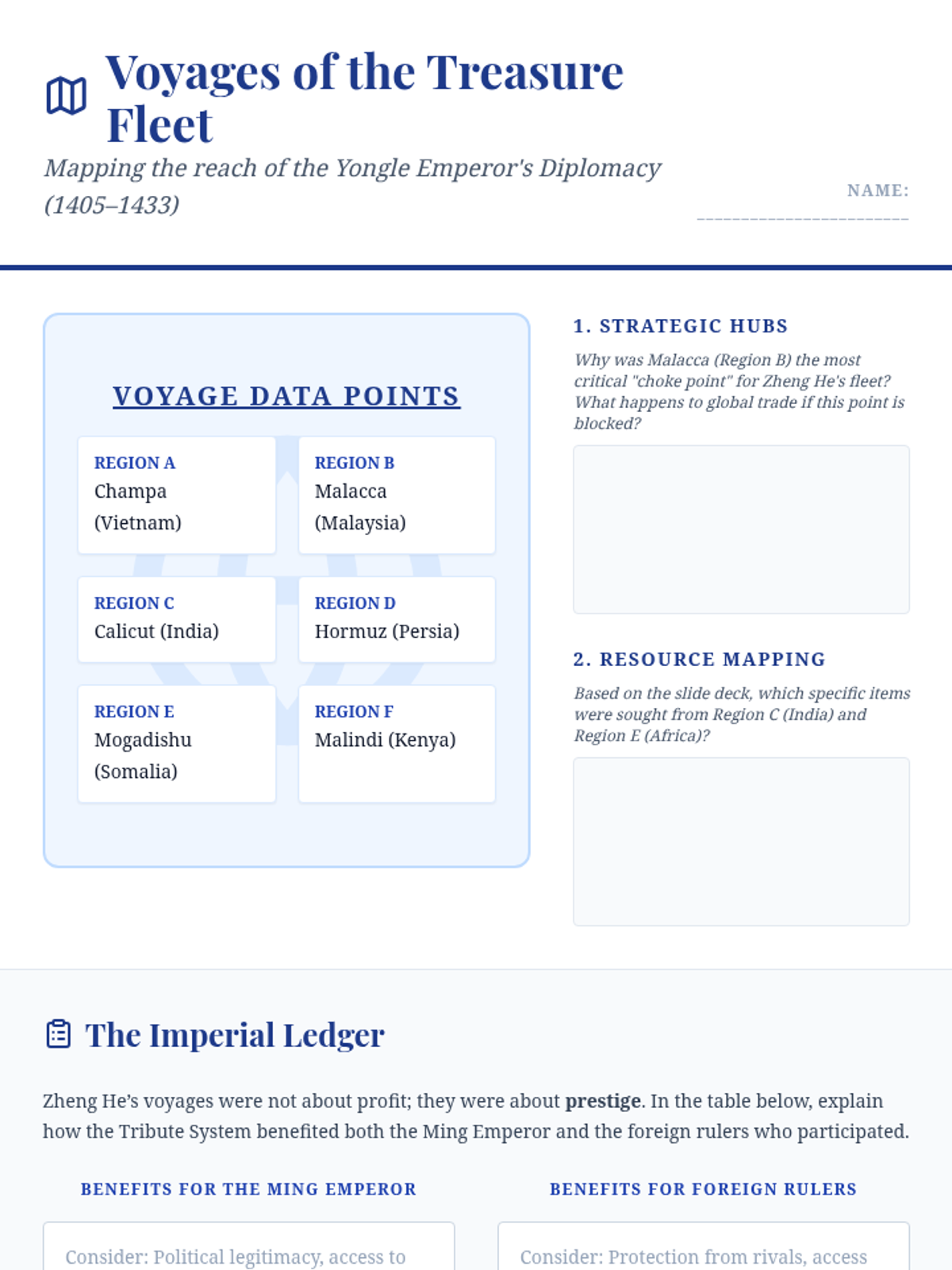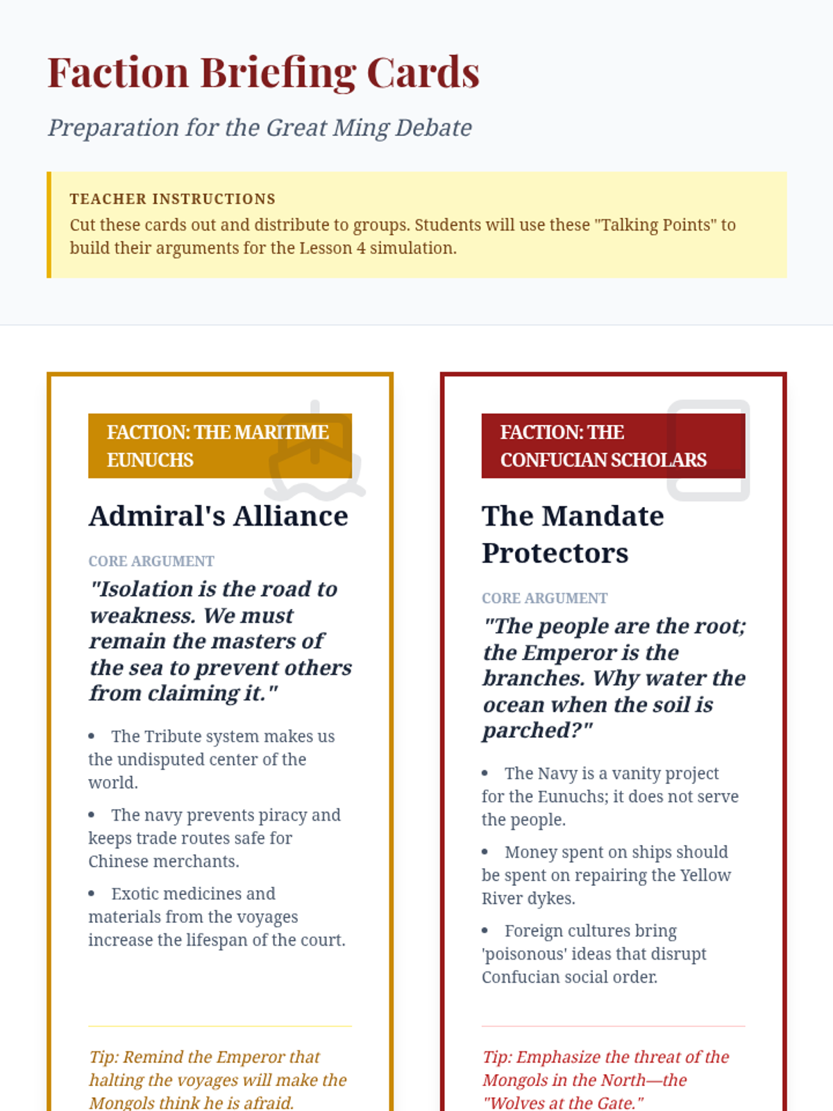 This sequence explores the early Ming Dynasty's shift from unprecedented maritime exploration to strict isolationism. Students analyze the reign of Hongwu, the massive Treasure Fleets of Zheng He, and the internal court conflicts between Eunuchs and Scholar-Officials that ultimately changed the course of global history.