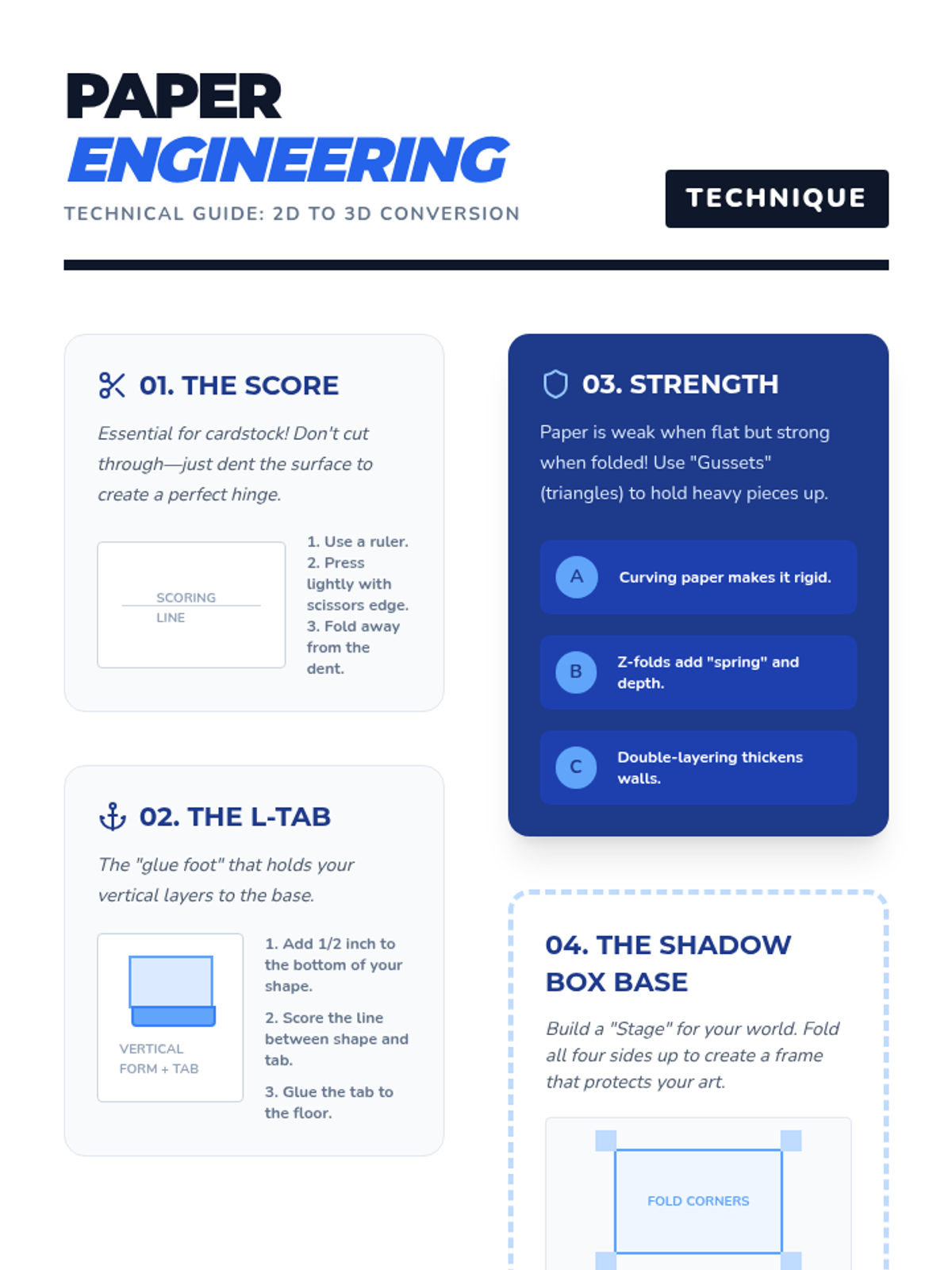 An 8th-grade art unit focused on advanced paper construction, where students choose between creating a 3D animal or a mask. The unit emphasizes career exploration in design and architecture through paper folding techniques.