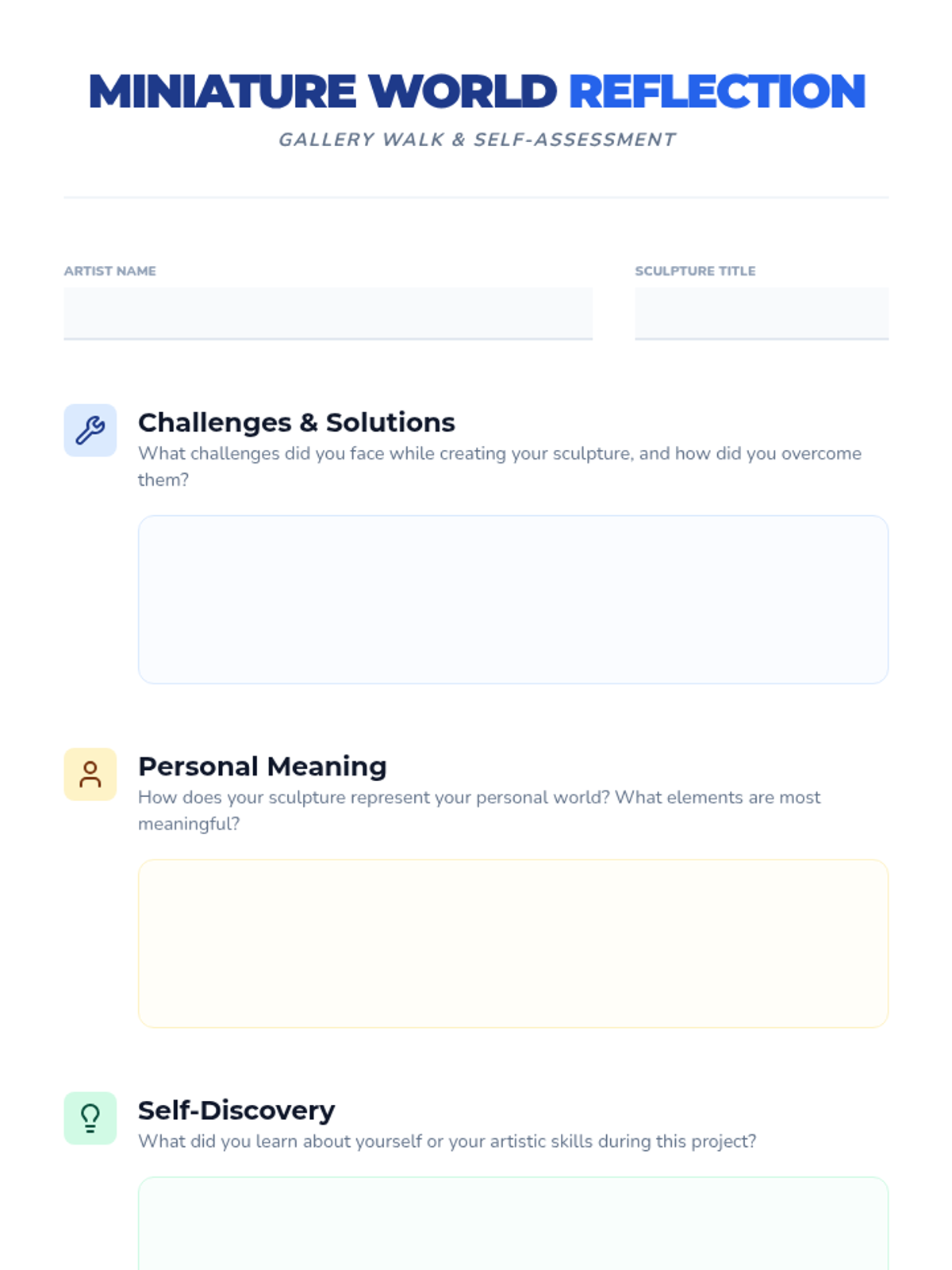 A comprehensive 5-day art sequence where students explore 3D paper sculpting. Students learn to translate their personal perspectives into physical miniature environments using cardstock, watercolors, and engineering techniques.