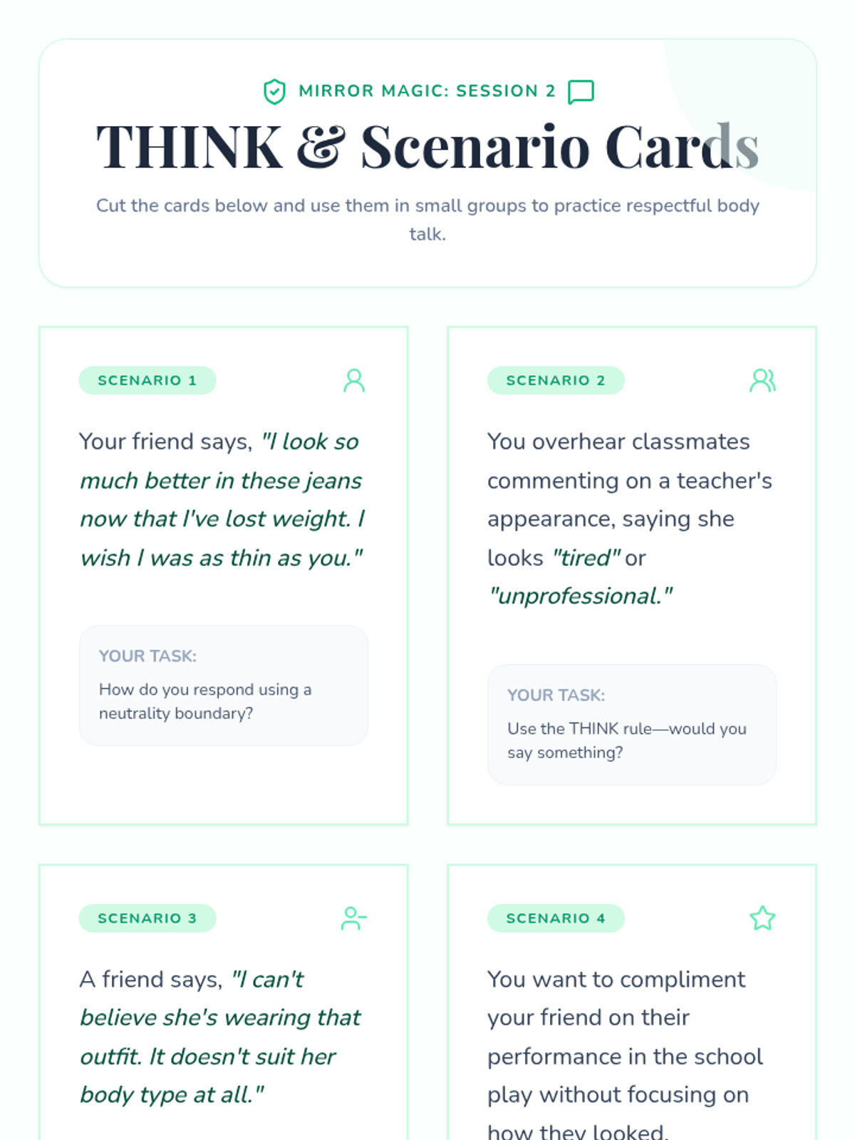 A 2-session social skills group for 6th-grade girls focused on body neutrality, media literacy, and respectful interpersonal communication regarding physical appearance.
