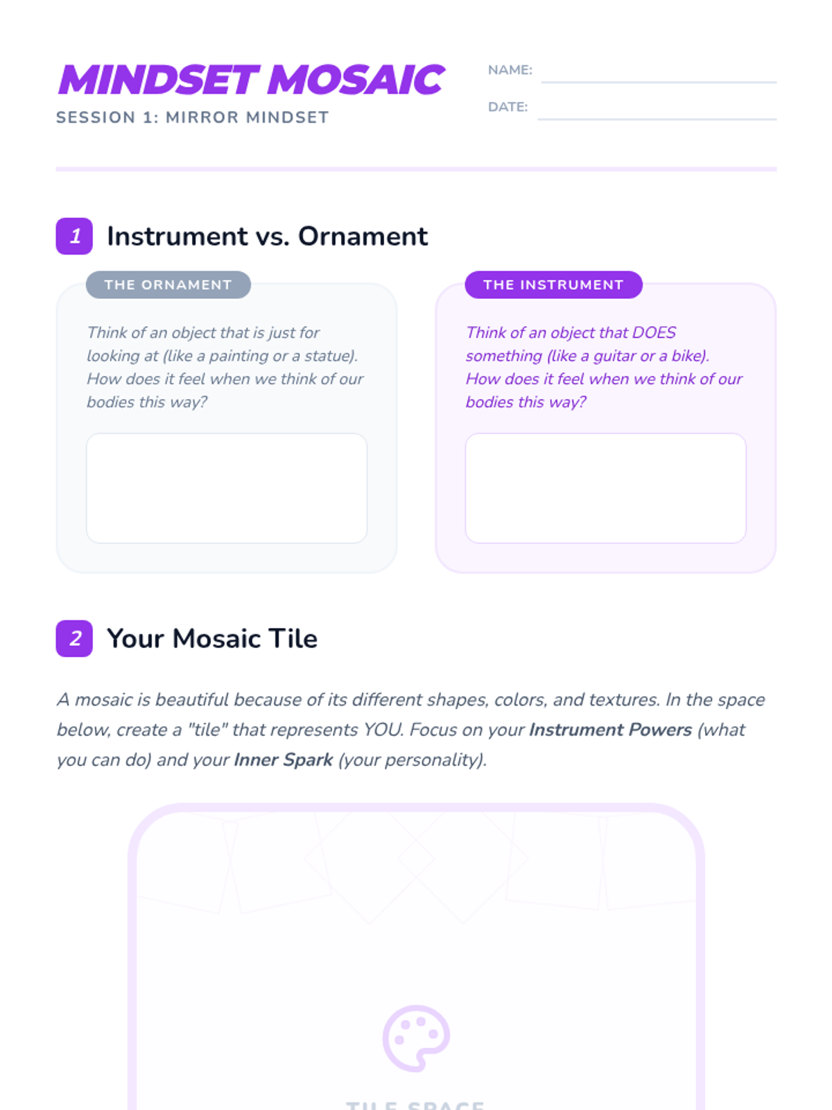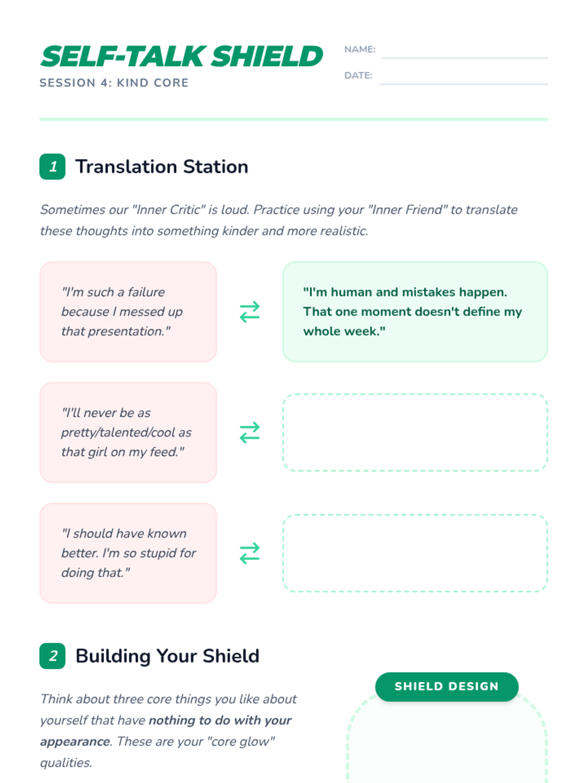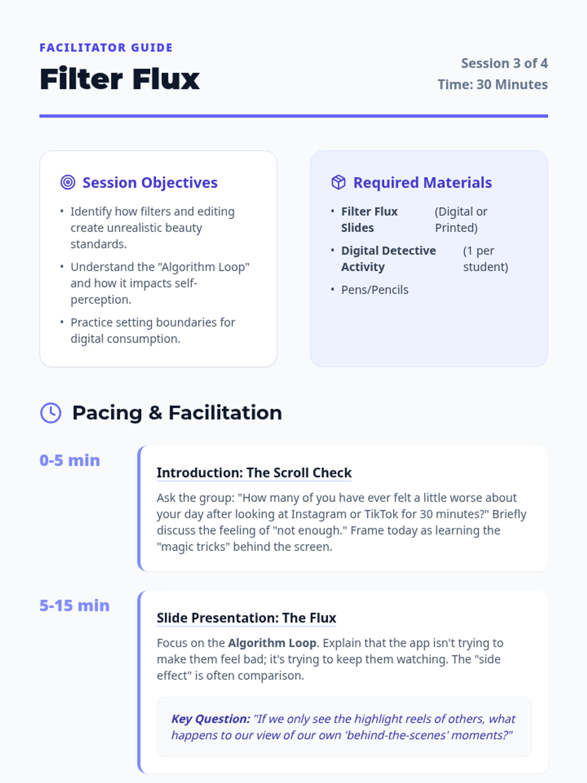 A 4-session social skills group for 6th-grade girls focused on body neutrality, media literacy, digital authenticity, and internal self-compassion. This sequence helps students transition from seeing themselves as "objects to be viewed" to "subjects who experience the world."