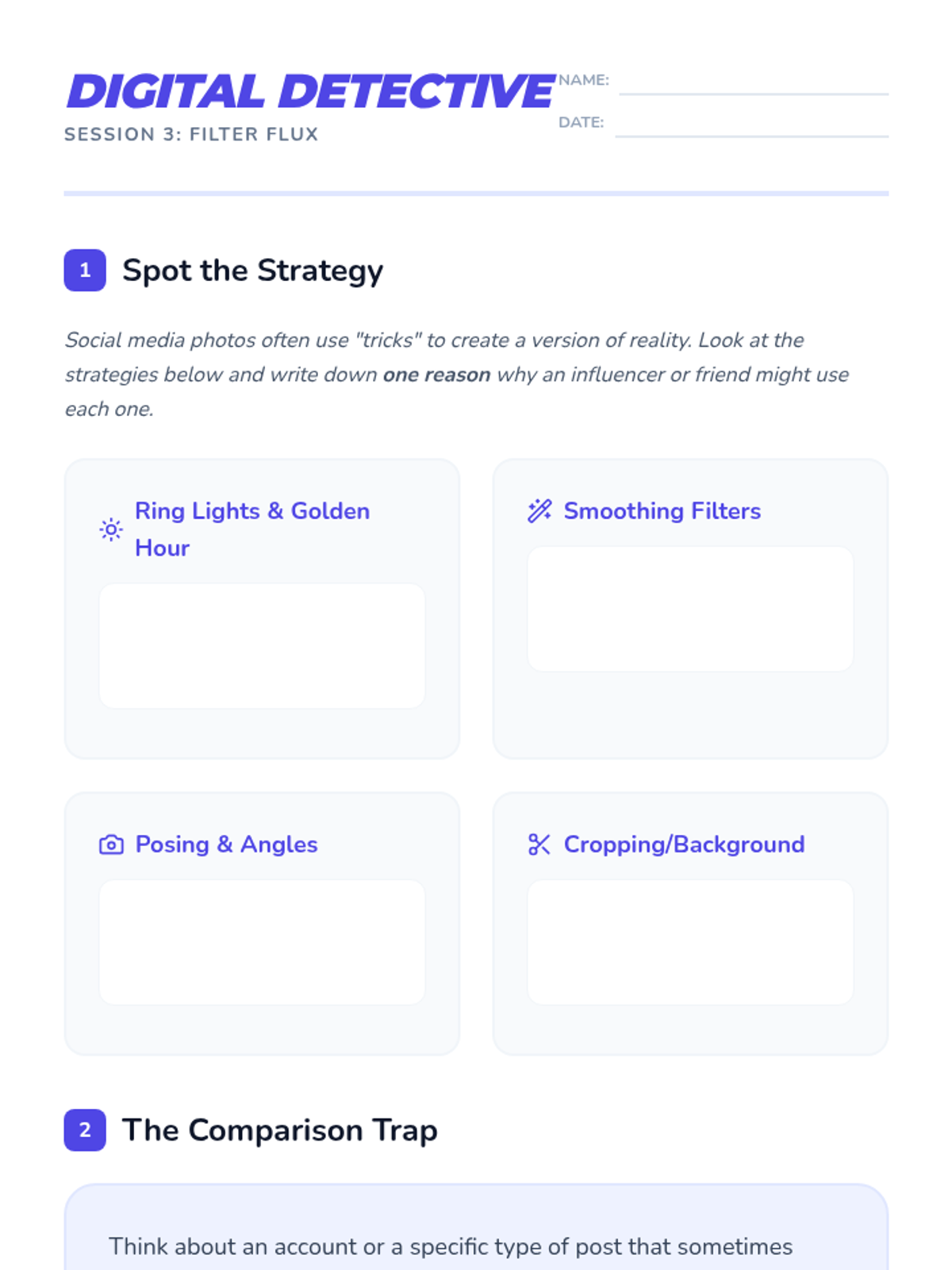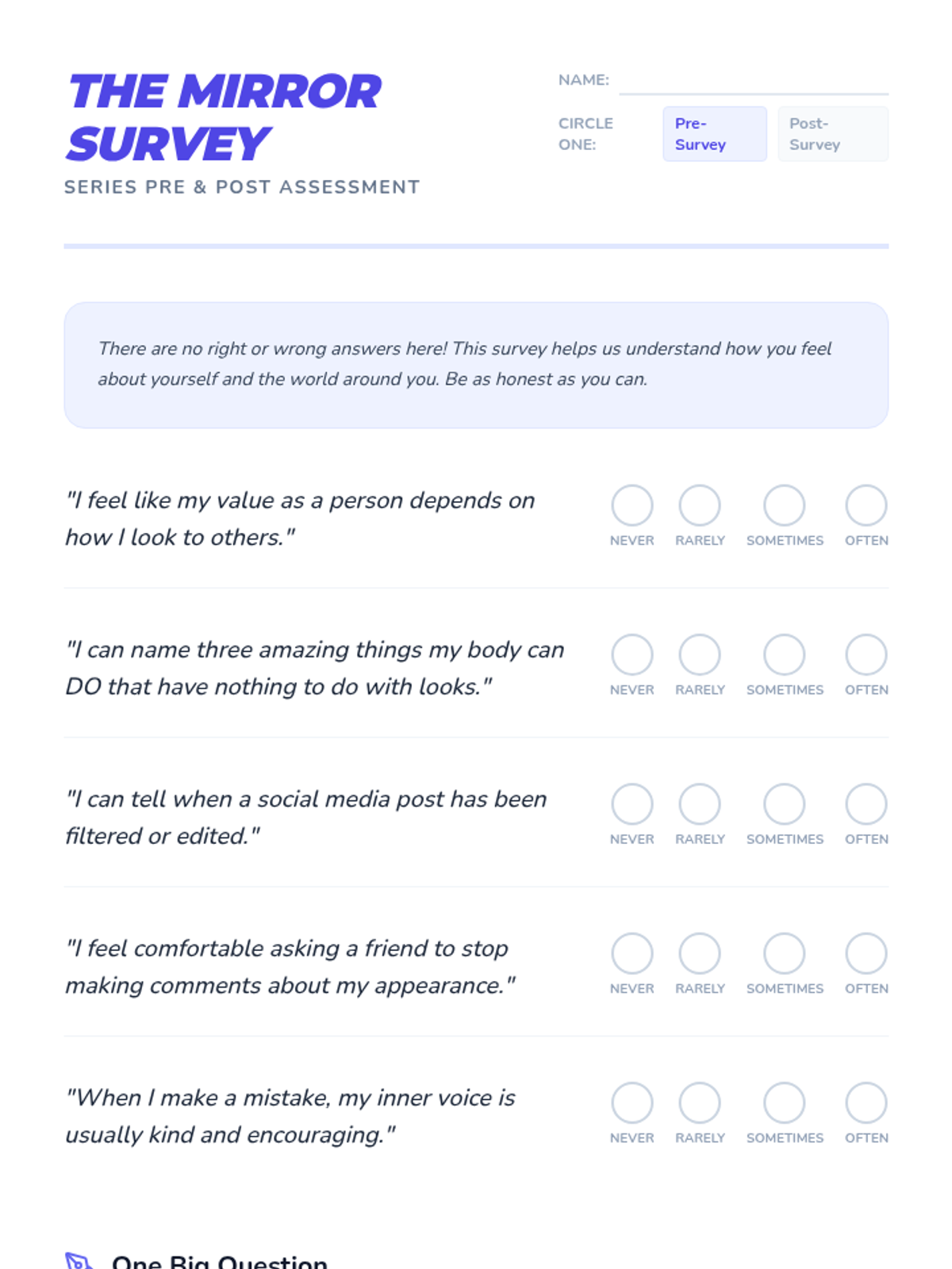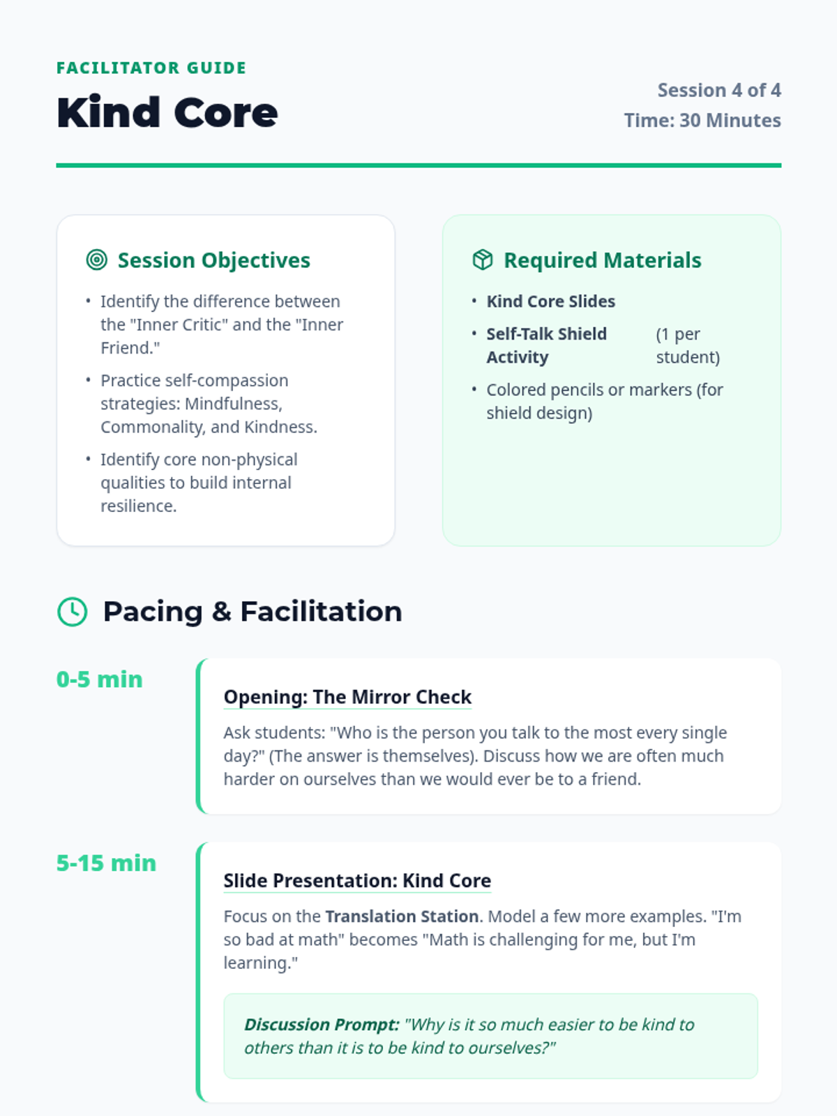 A 4-session social skills group for 6th-grade girls focused on body neutrality, media literacy, digital authenticity, and internal self-compassion. This sequence helps students transition from seeing themselves as "objects to be viewed" to "subjects who experience the world."