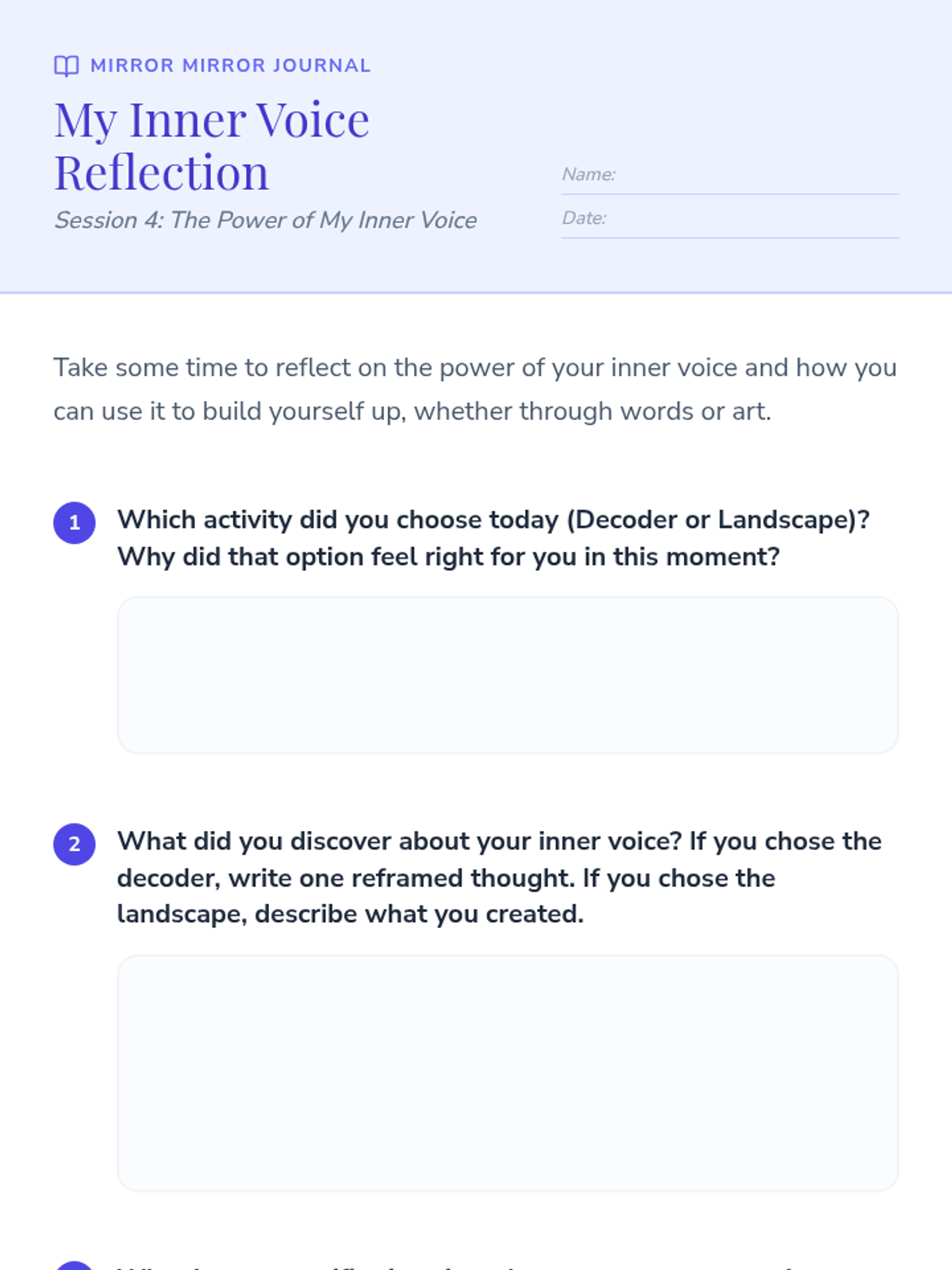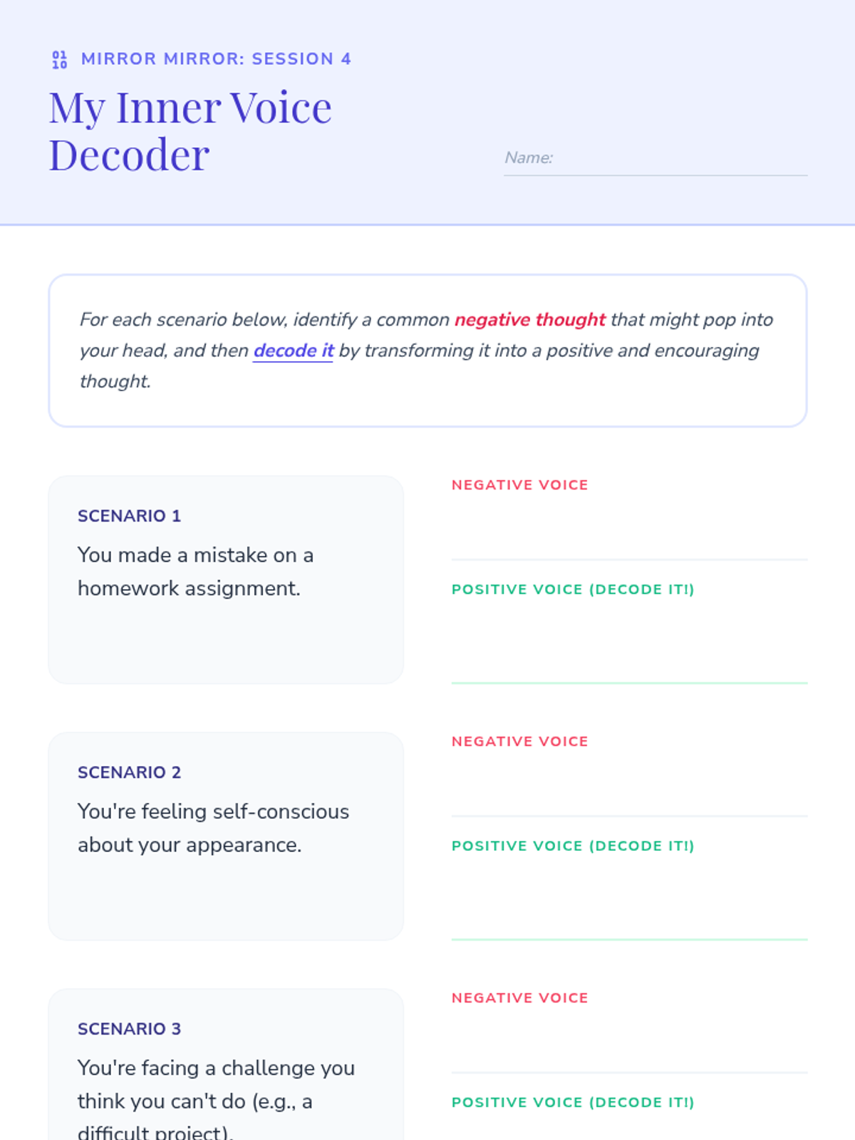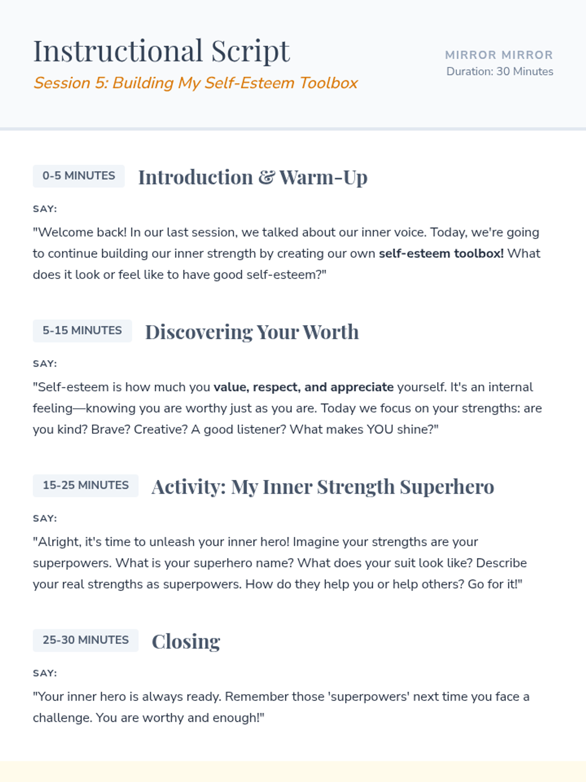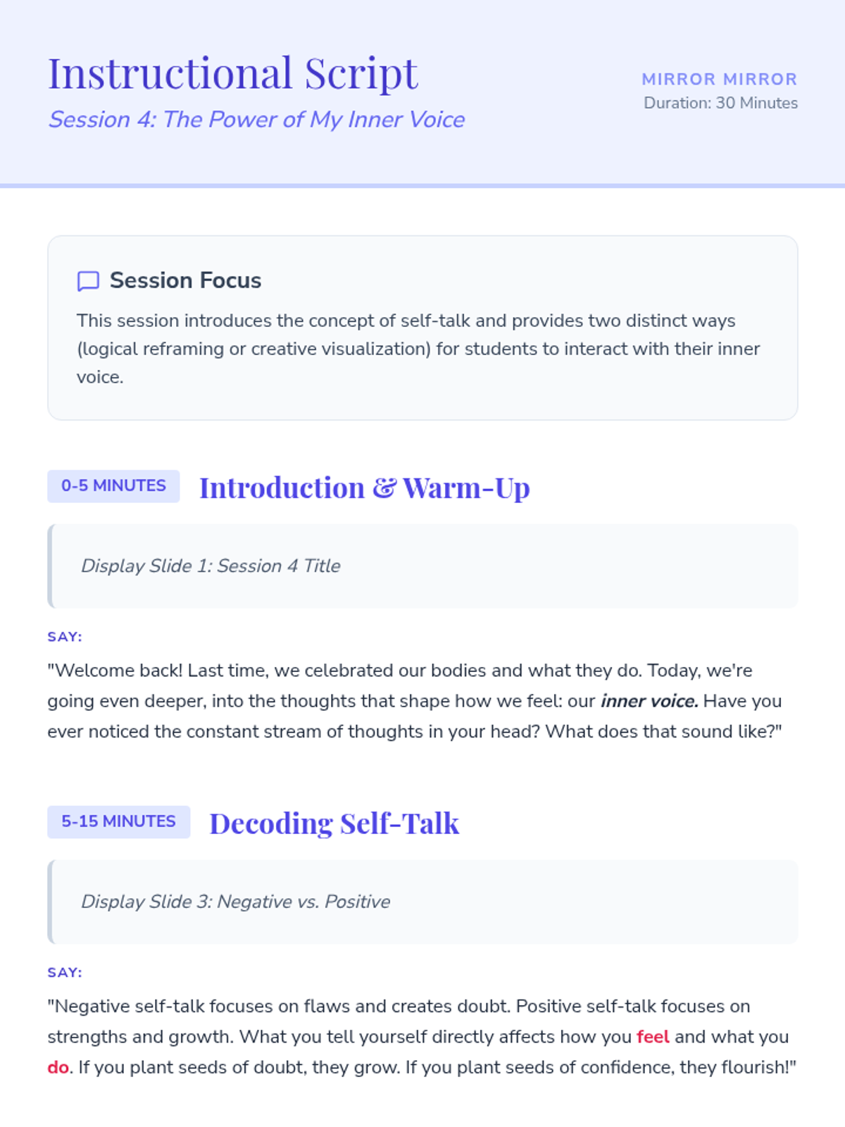 A 15-session empowerment program for 7th-grade girls focused on building a healthy body image, fostering self-esteem, and mastering positive self-talk through thematic discussions and creative activities.