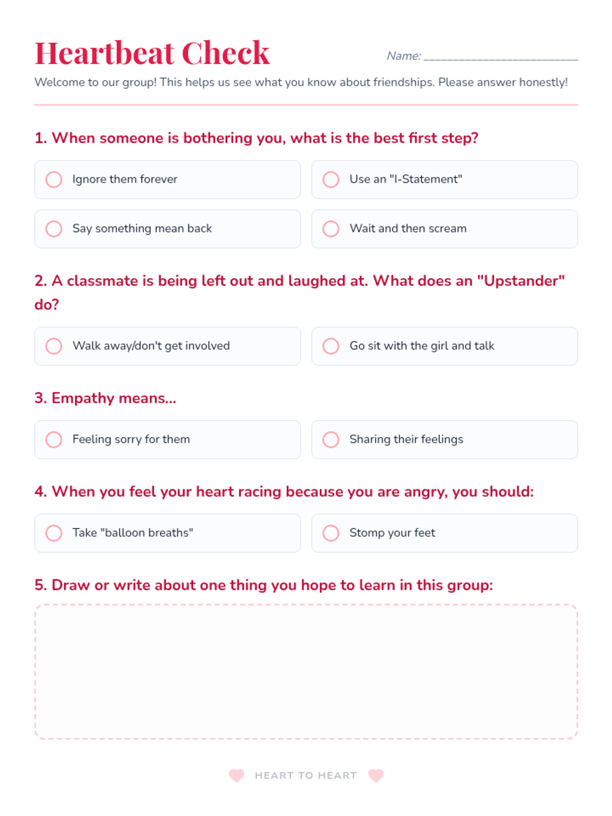 A 5-week social-emotional learning program for 4th-grade girls focused on building empathy, managing anger, and developing conflict resolution skills through interactive discussions and creative activities.