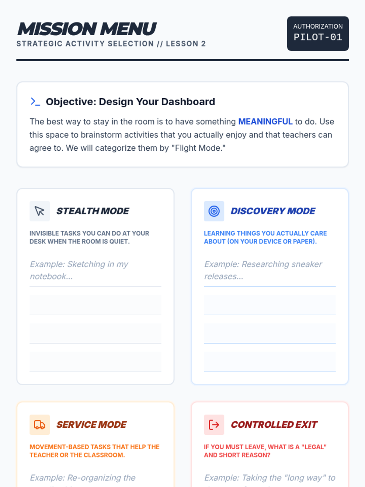 A four-lesson sequence designed for a 10th-grade student with ADHD to manage boredom, prevent elopement, and develop self-regulation strategies when work is completed early. The sequence uses a 'Mission Control' theme to empower the student as the pilot of her own classroom experience.