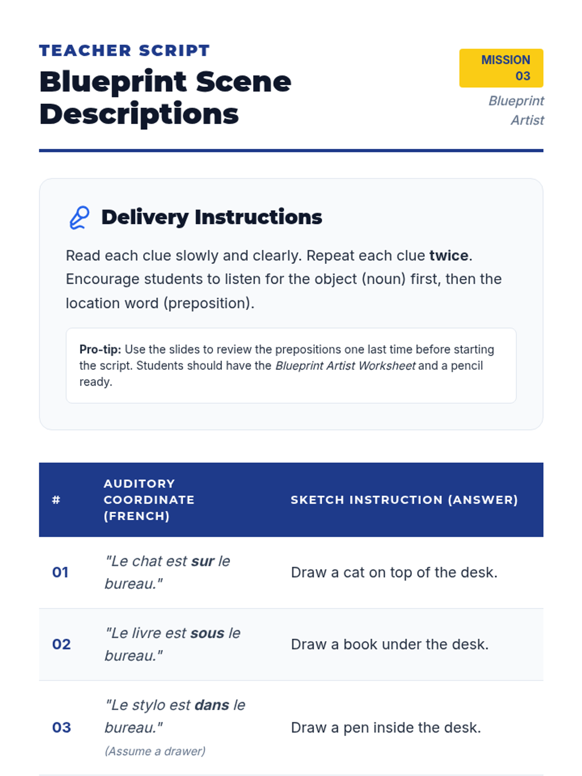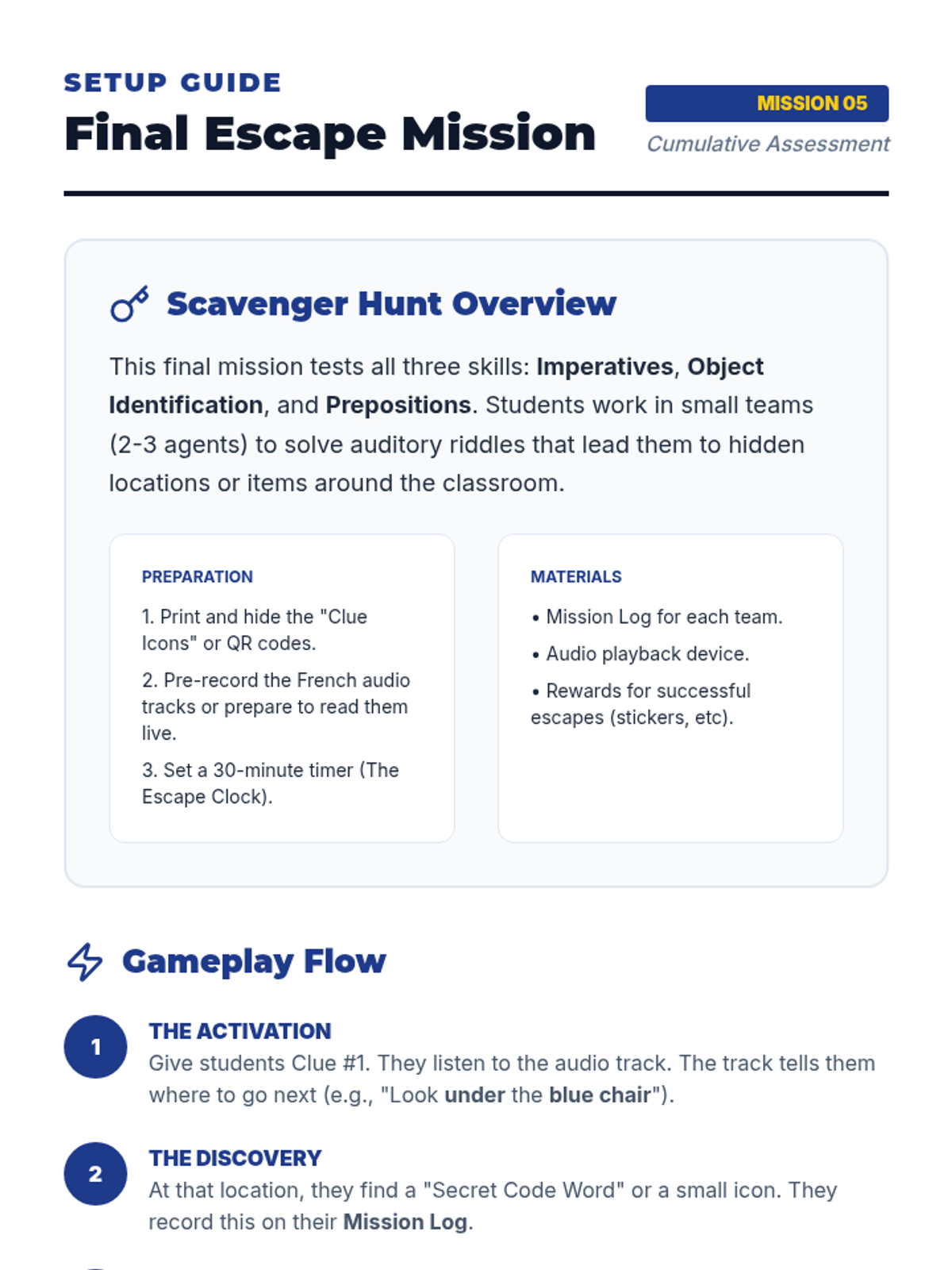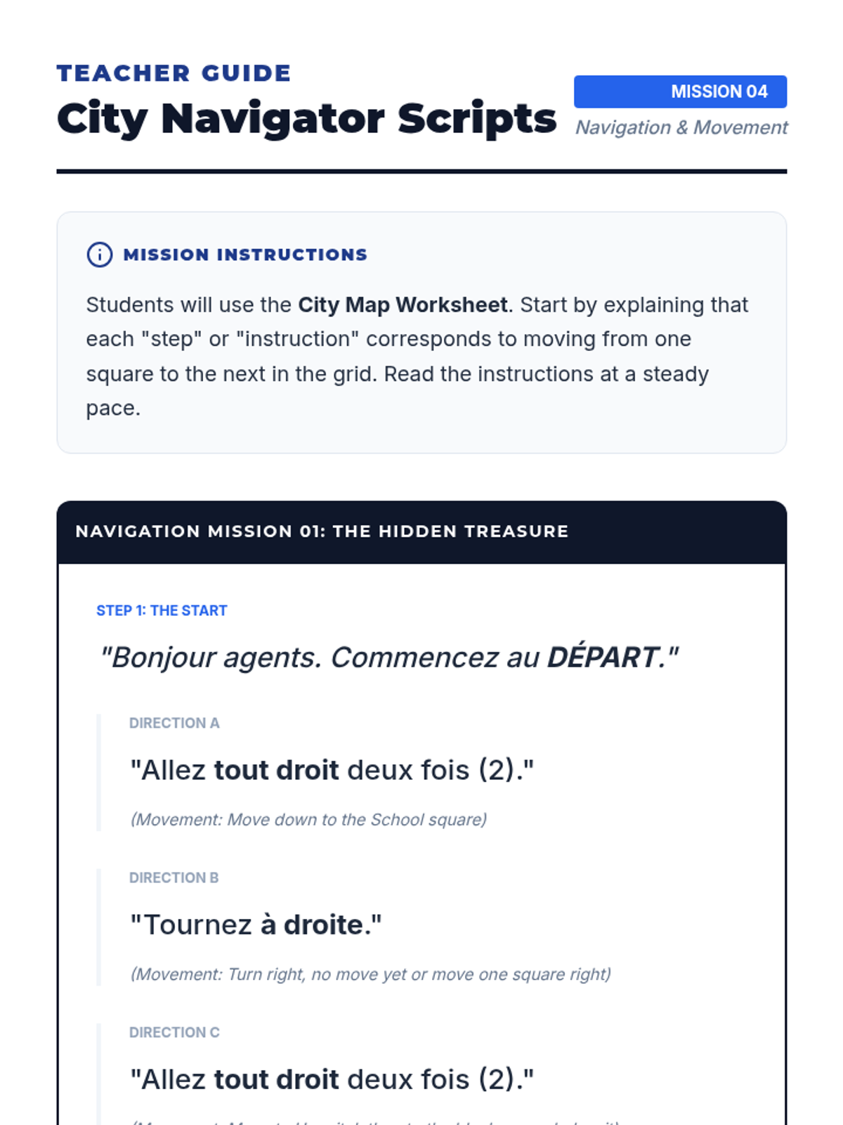 A 5-lesson sequence for 6th Grade French beginners focusing on listening comprehension through TPR, commands, spatial descriptions, and directional movement. Students act as 'Language Agents' on various missions to decode and execute instructions in French.