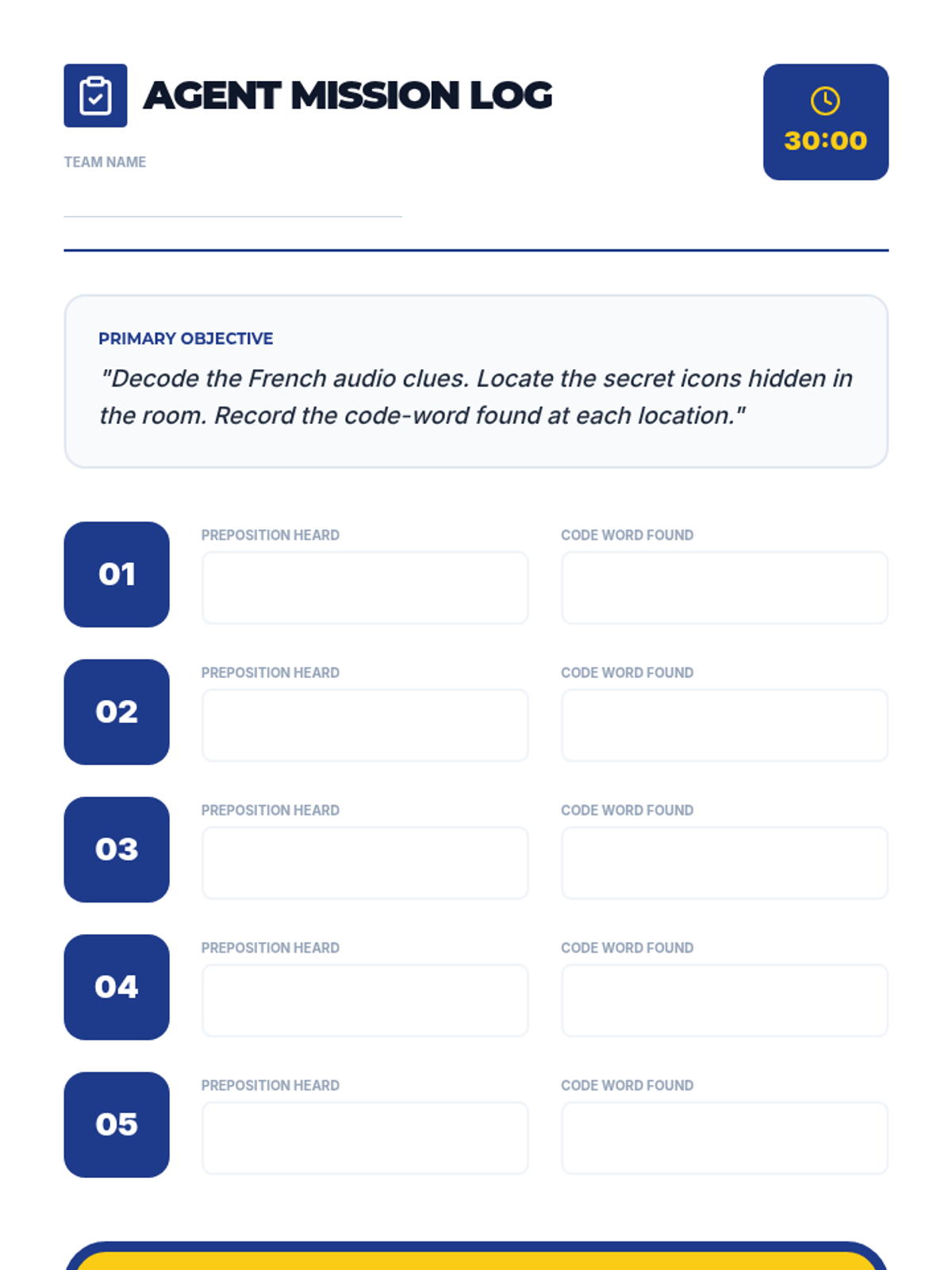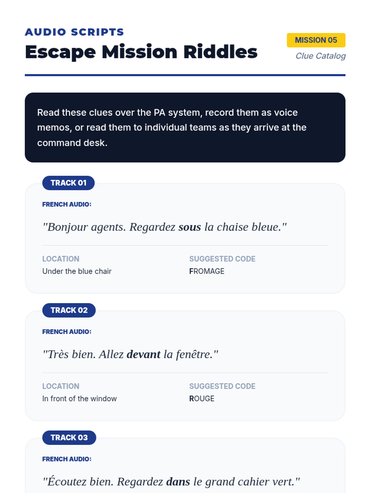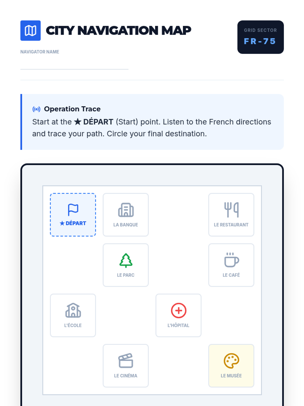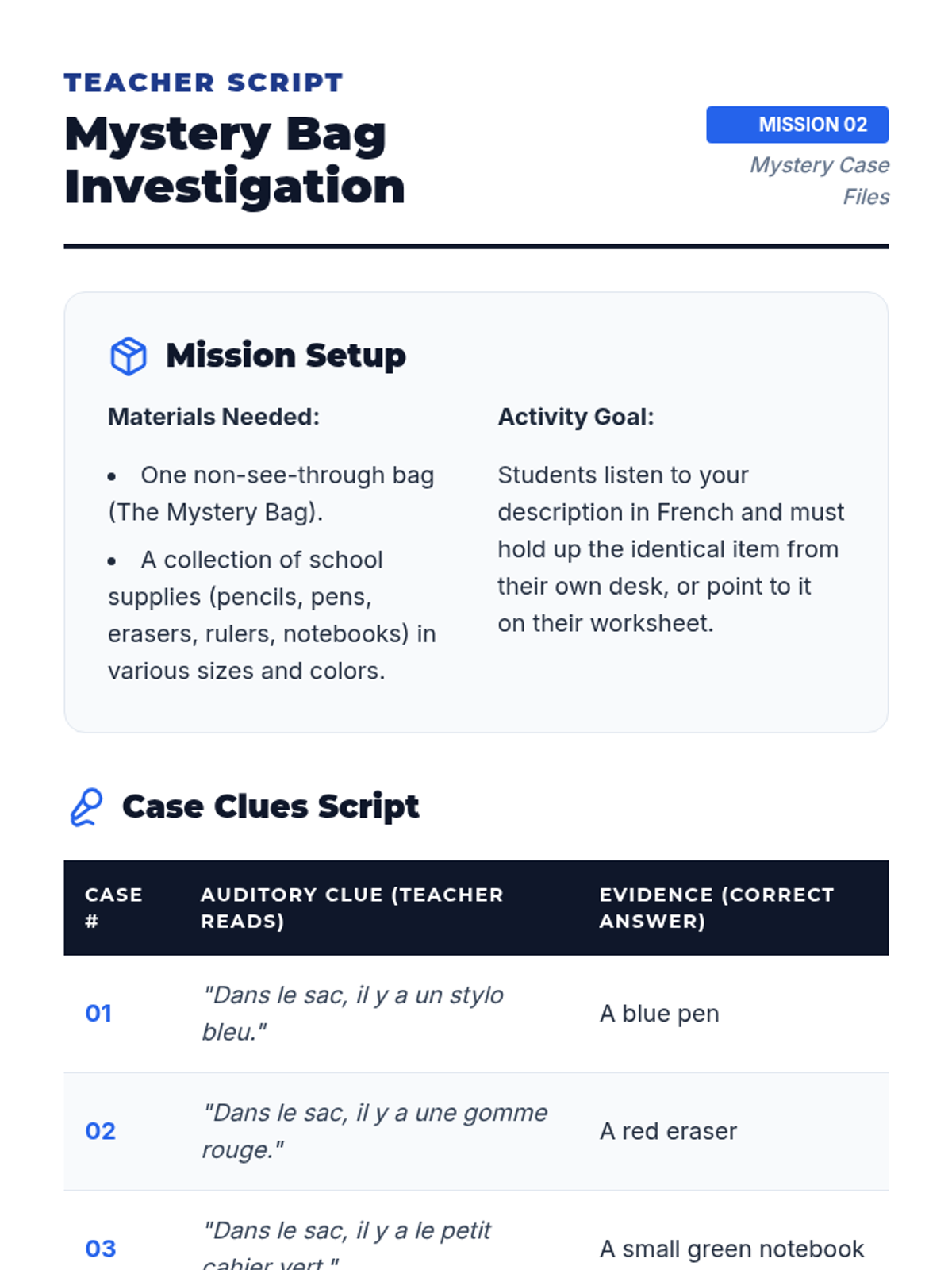 A 5-lesson sequence for 6th Grade French beginners focusing on listening comprehension through TPR, commands, spatial descriptions, and directional movement. Students act as 'Language Agents' on various missions to decode and execute instructions in French.