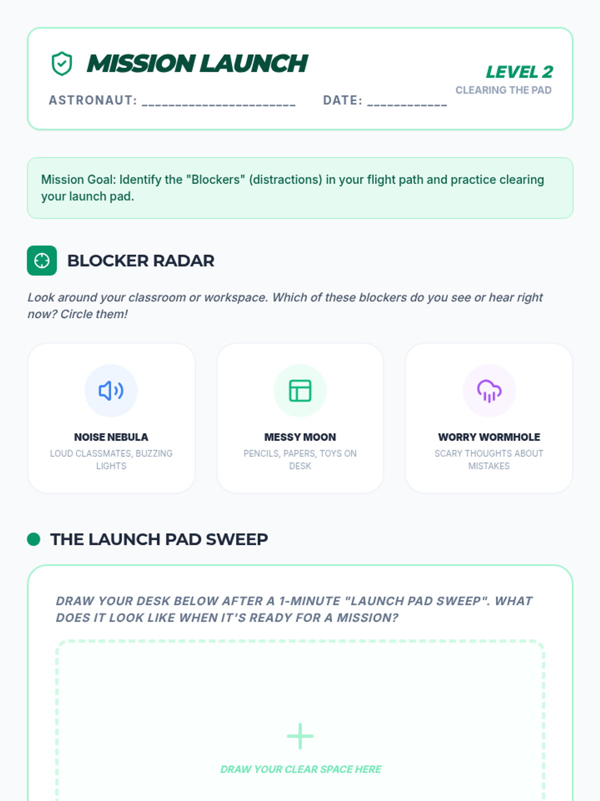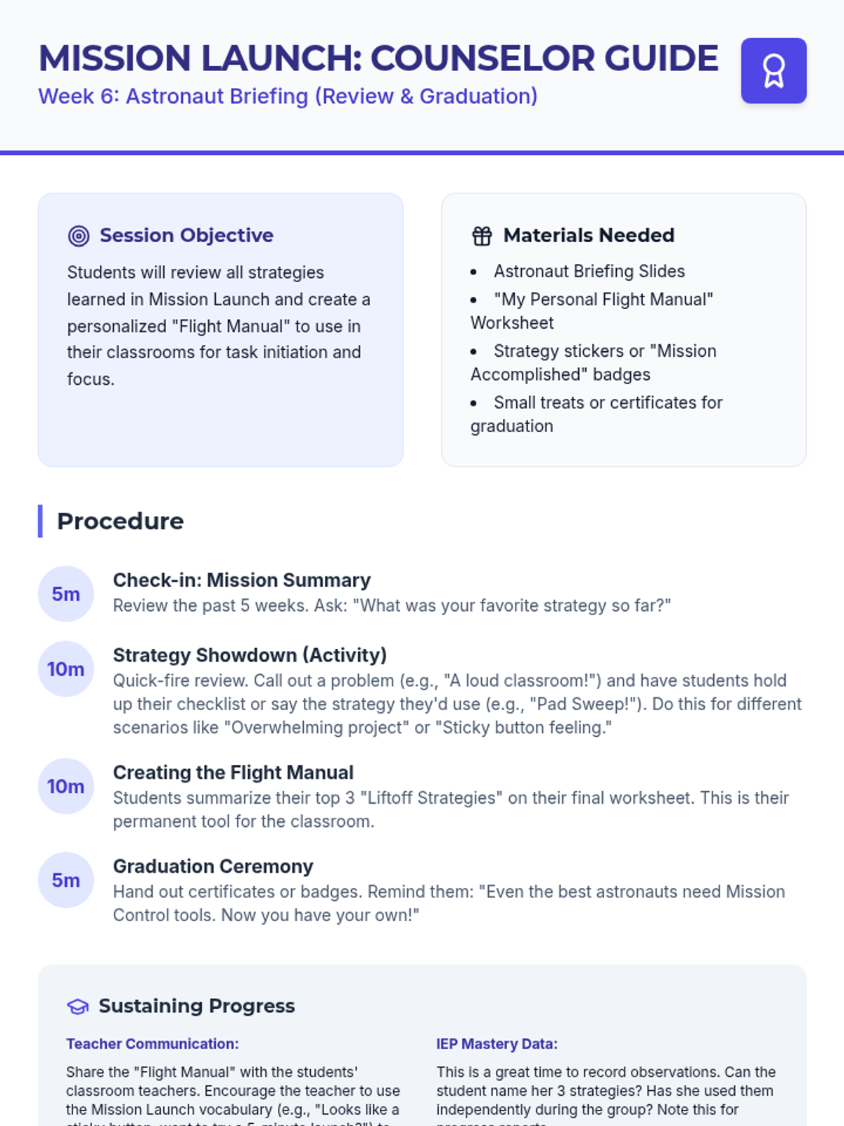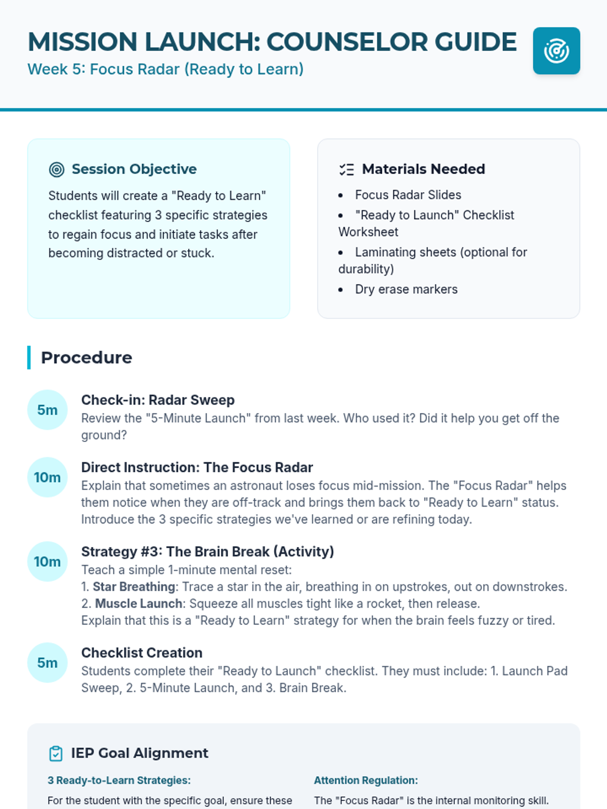 A 6-week counseling program designed for 4th-grade students with executive dysfunction, focusing on task initiation, focus, and "ready-to-learn" strategies using a Mission Control/Space theme.