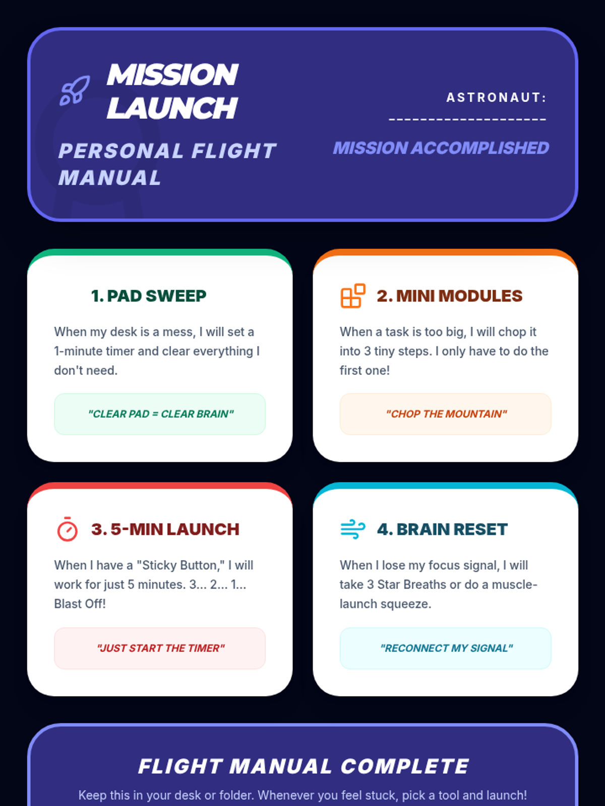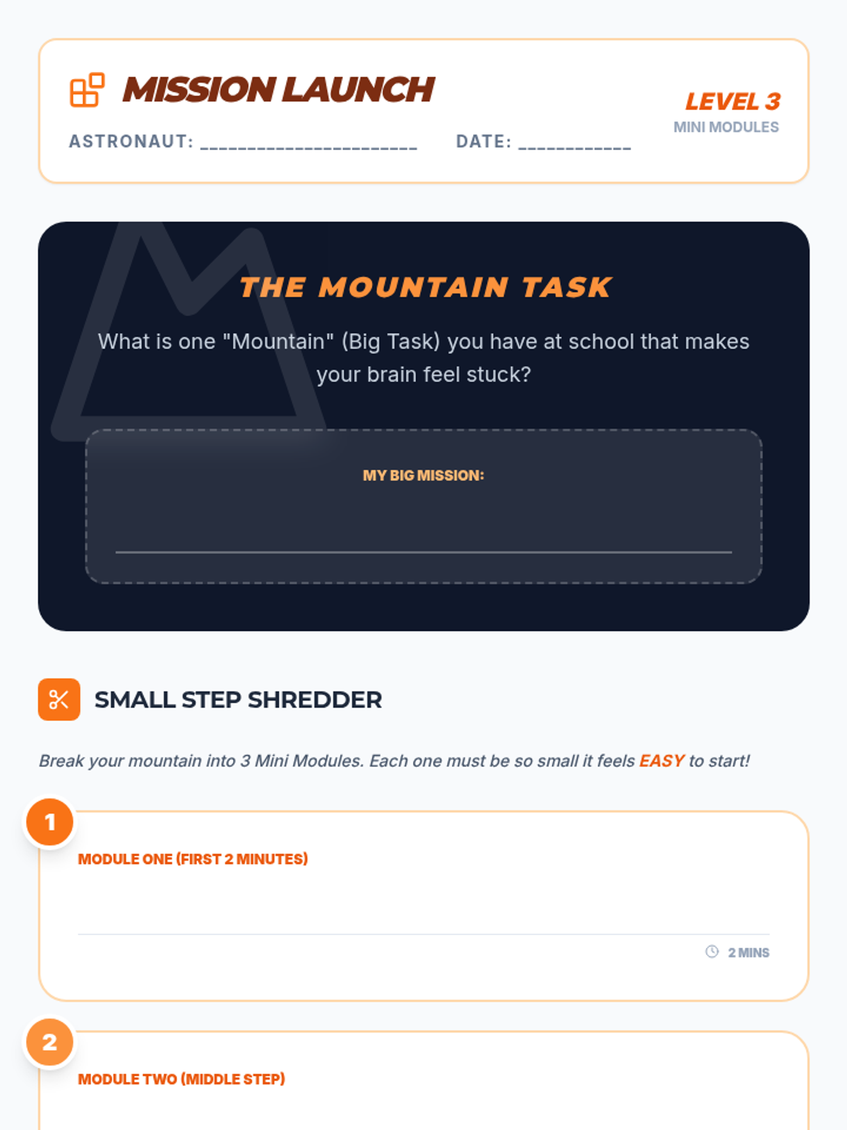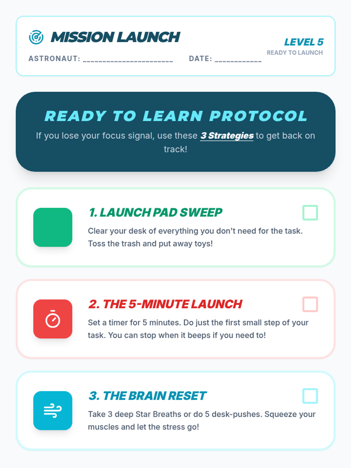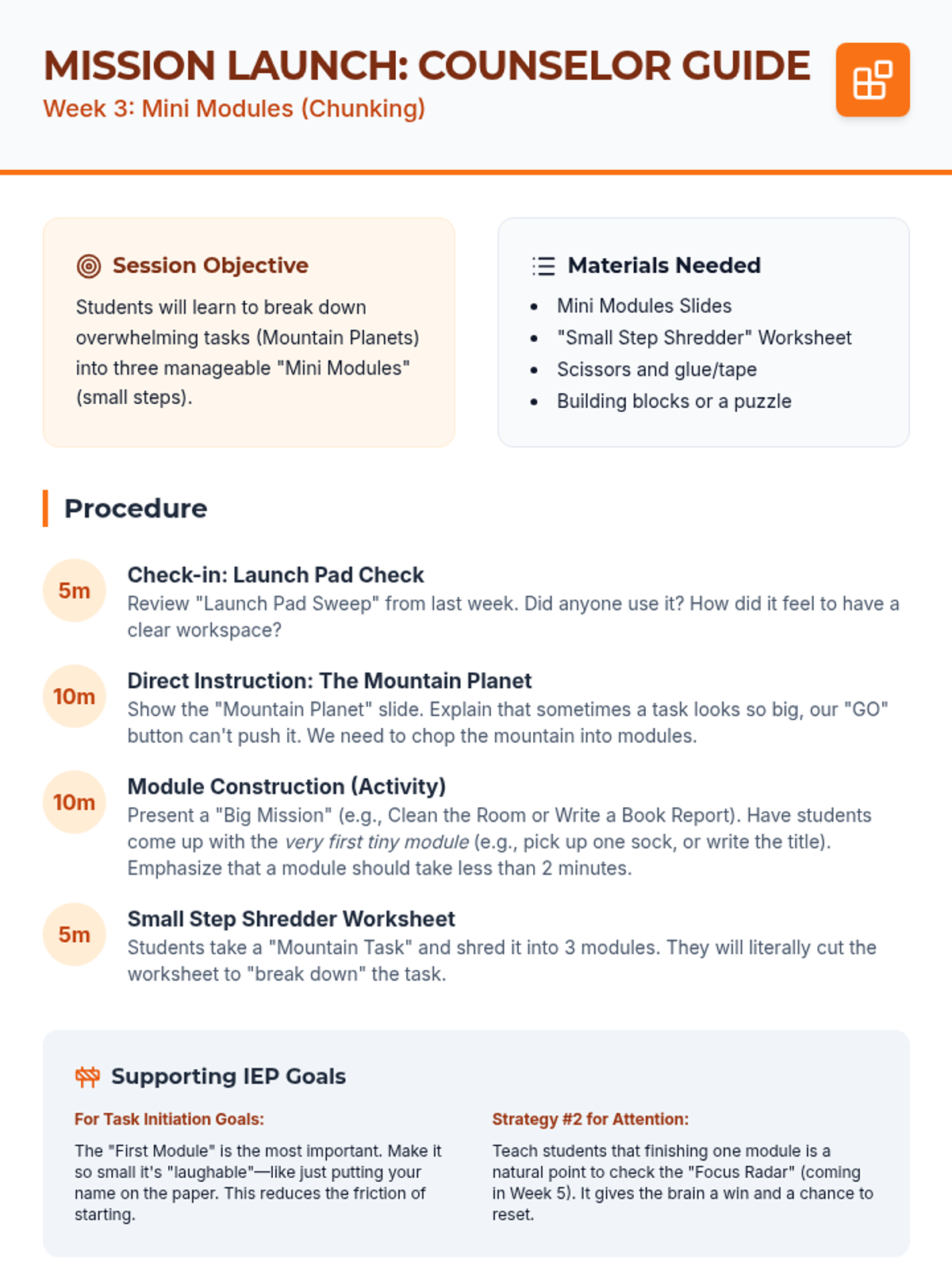 A 6-week counseling program designed for 4th-grade students with executive dysfunction, focusing on task initiation, focus, and "ready-to-learn" strategies using a Mission Control/Space theme.