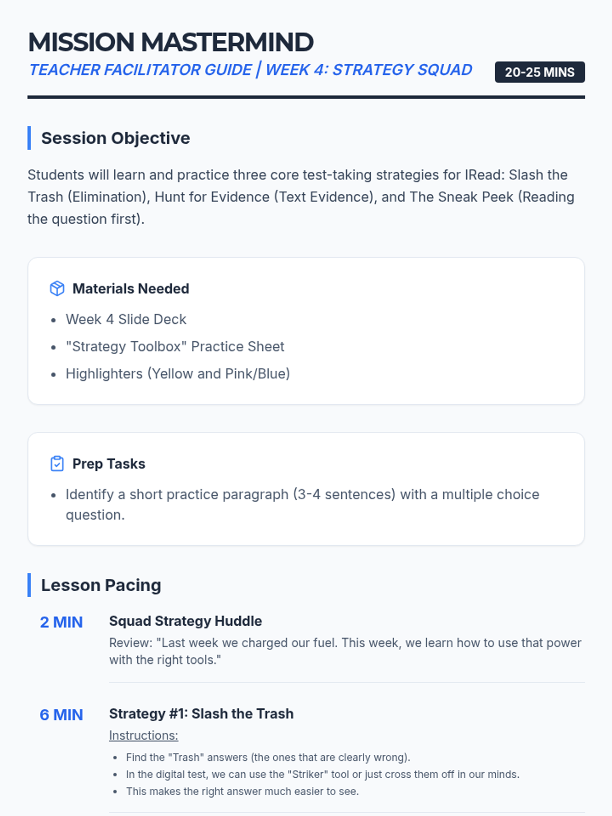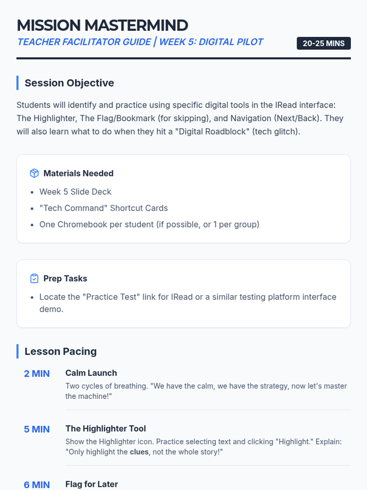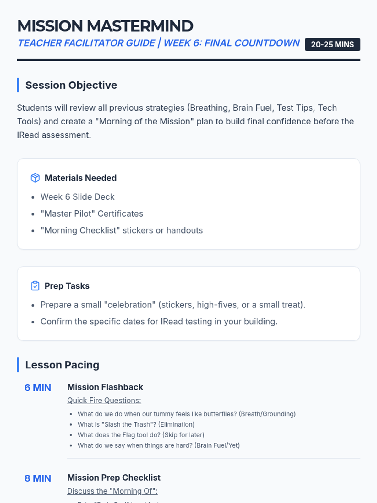 A 6-week small group counseling and test-prep sequence designed for 2nd and 3rd graders preparing for the IRead assessment. It combines emotional regulation, positive mindset, general test-taking strategies, and specific digital literacy skills for the Chromebook testing interface.