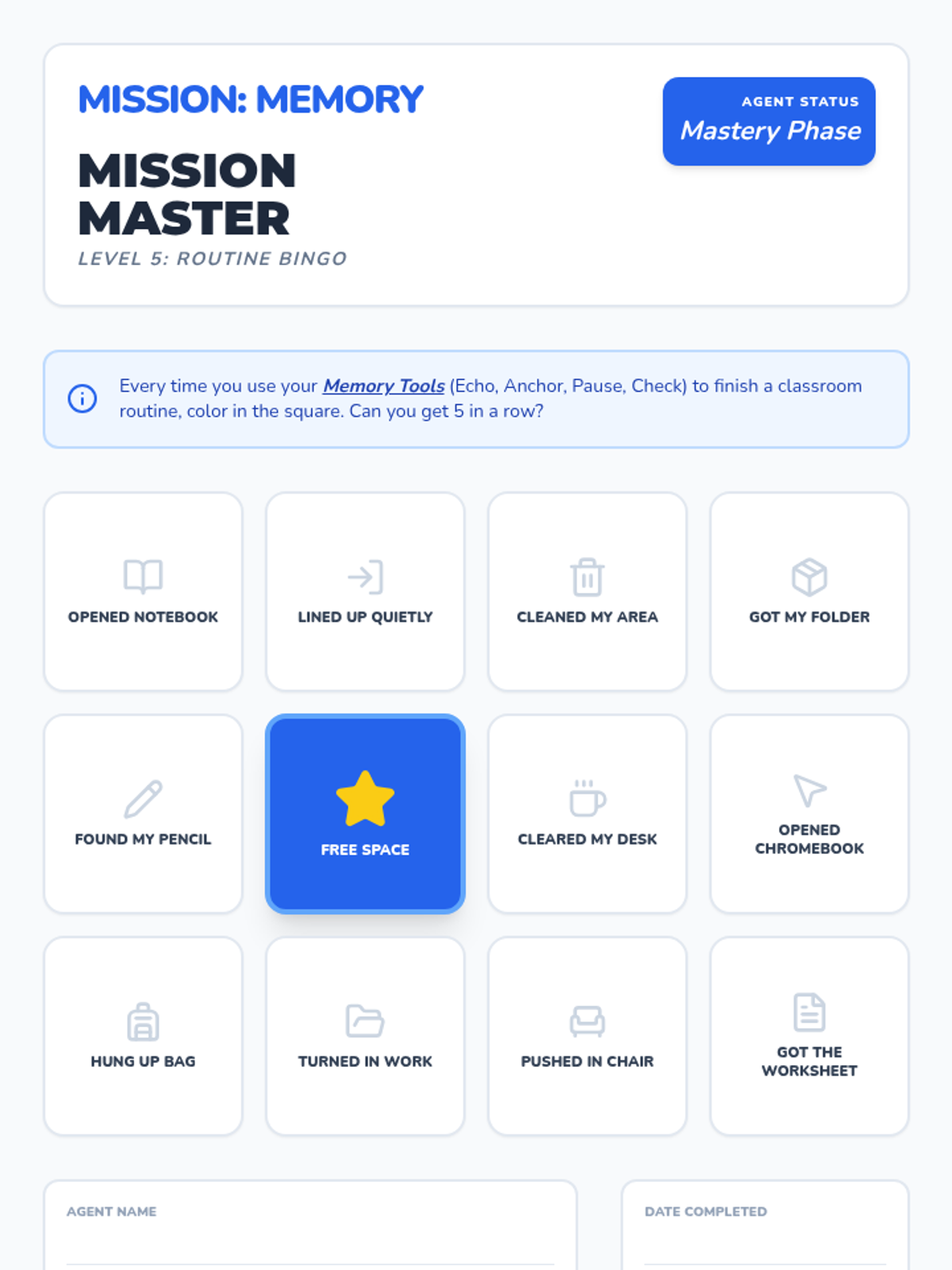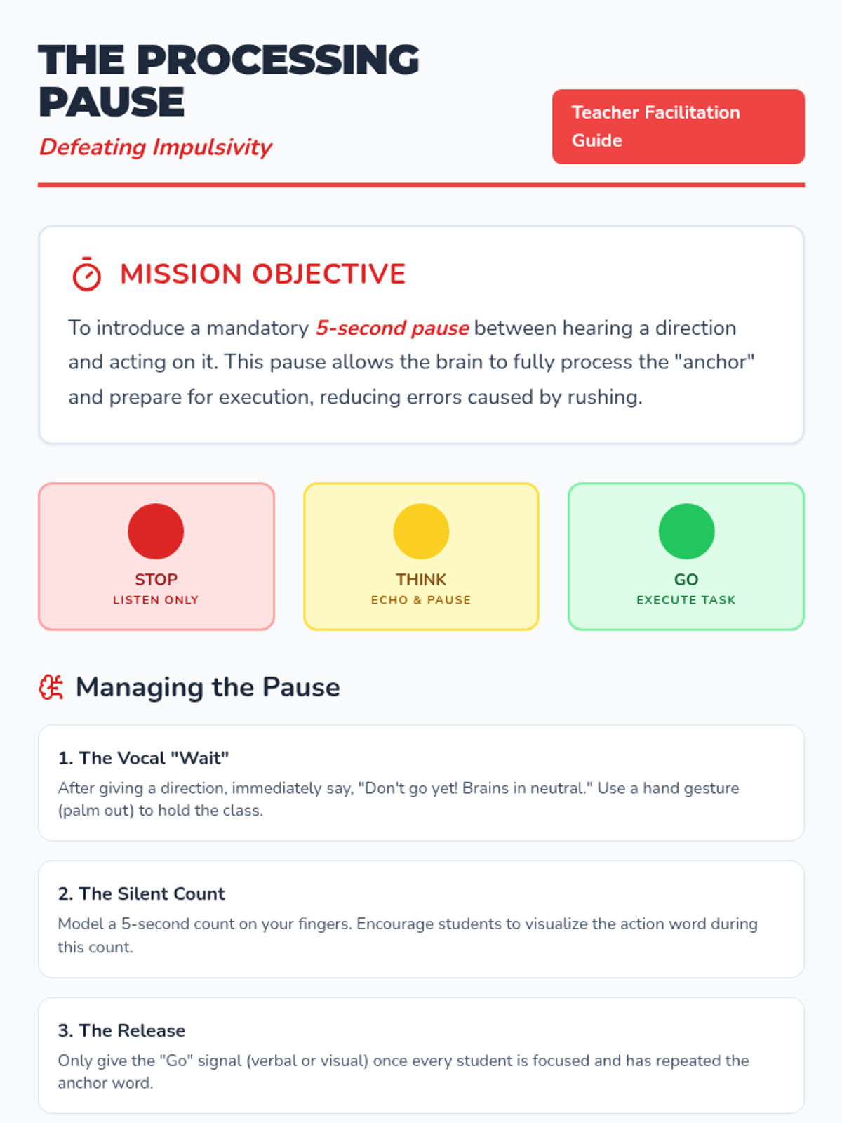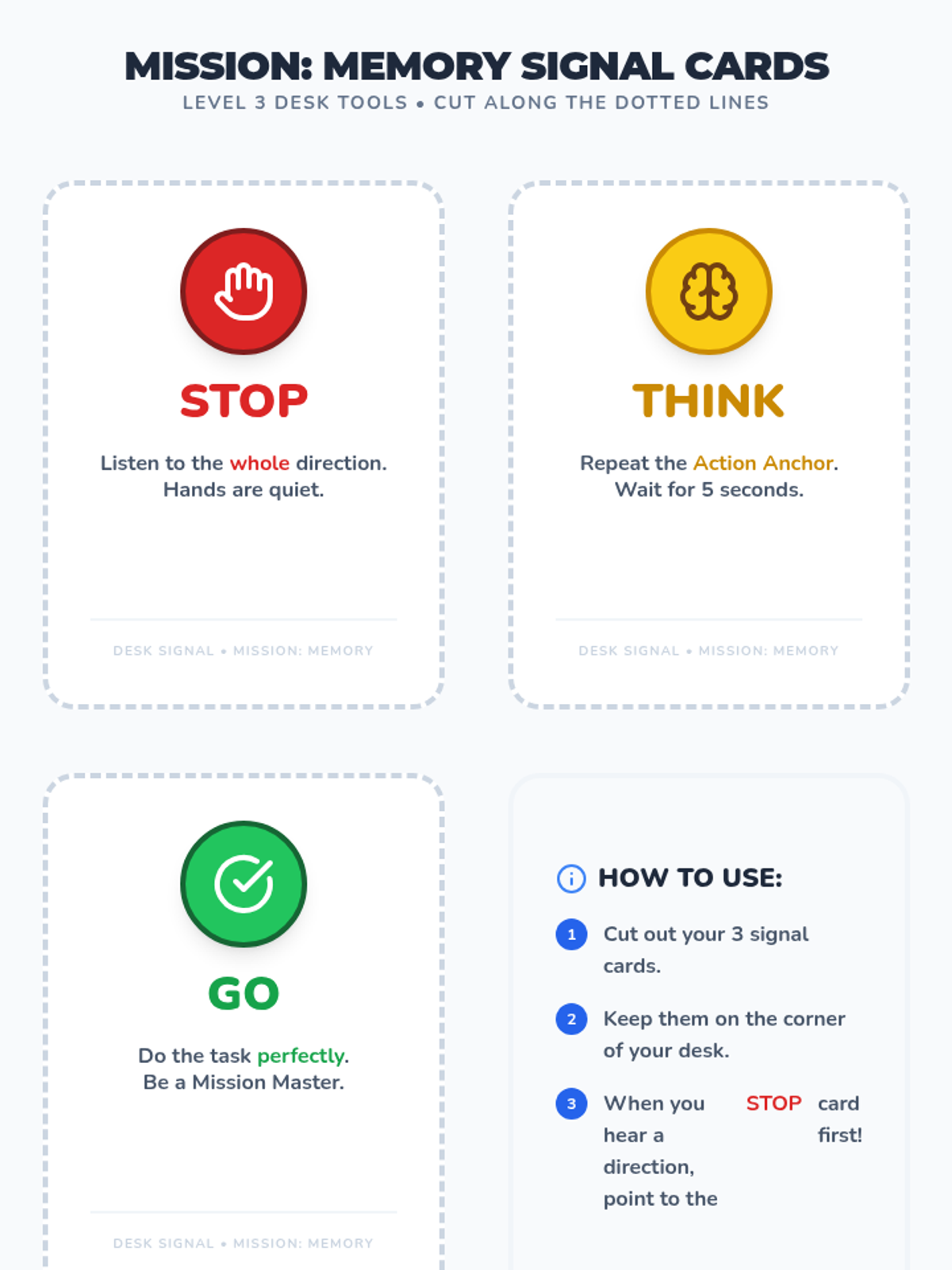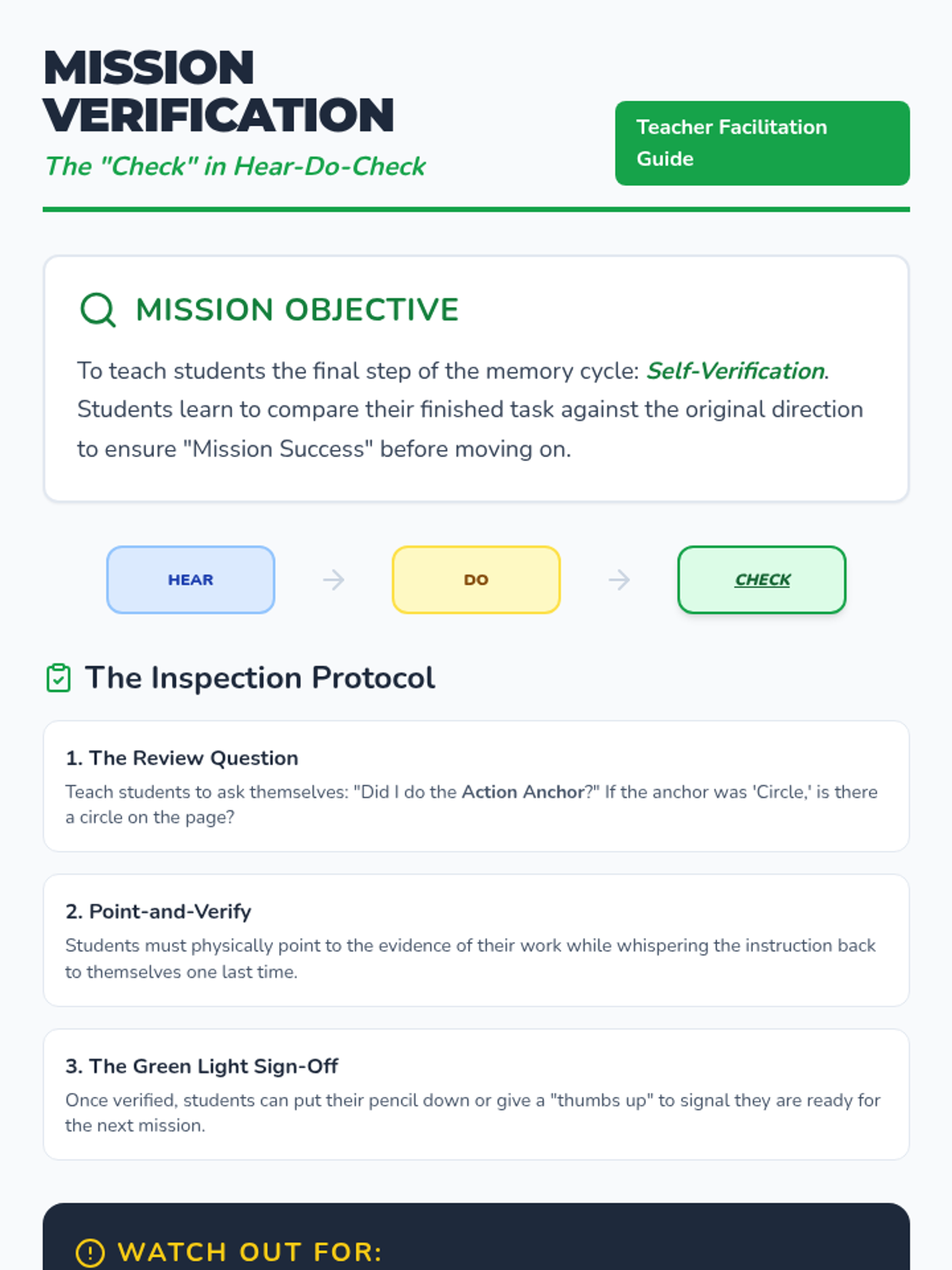 A specialized sequence for 4th-grade students to develop working memory through verbal rehearsal. Students practice the 'Hear-Repeat-Do' strategy, identify action keywords, utilize processing pauses, and verify their work to improve follow-through on single-step directions.