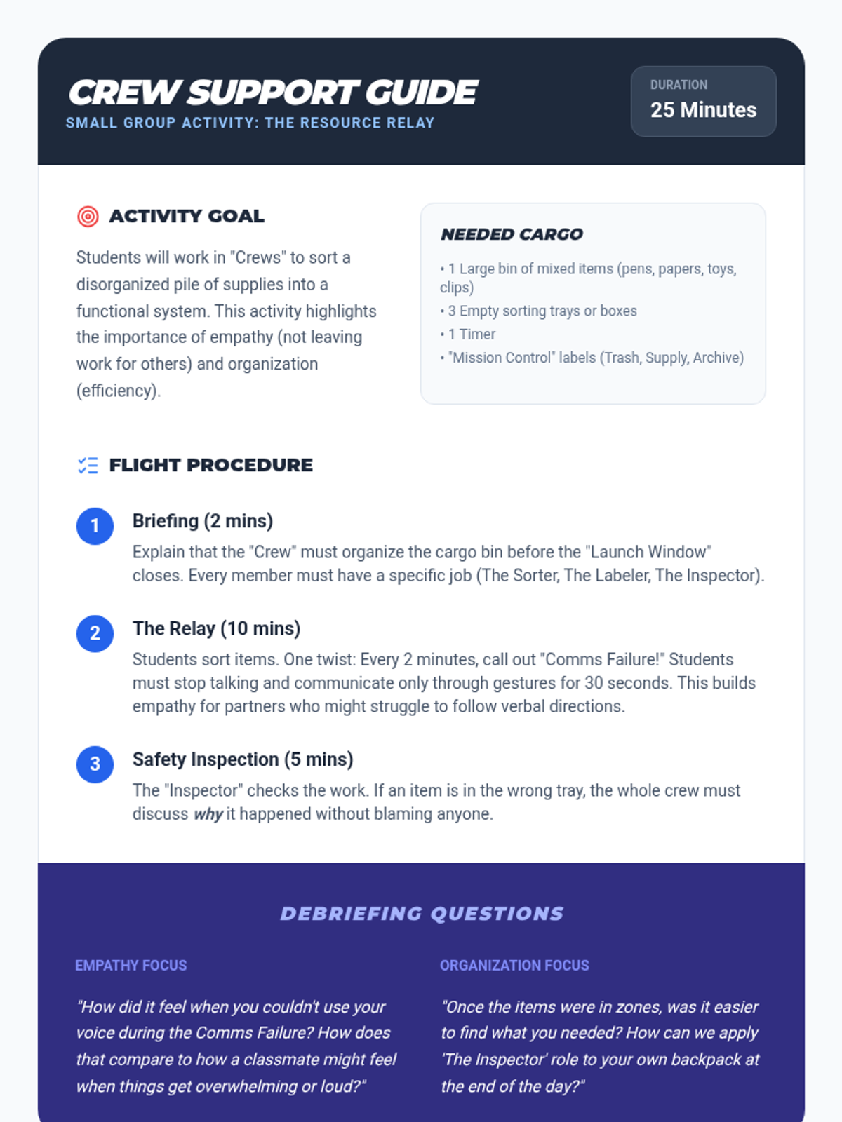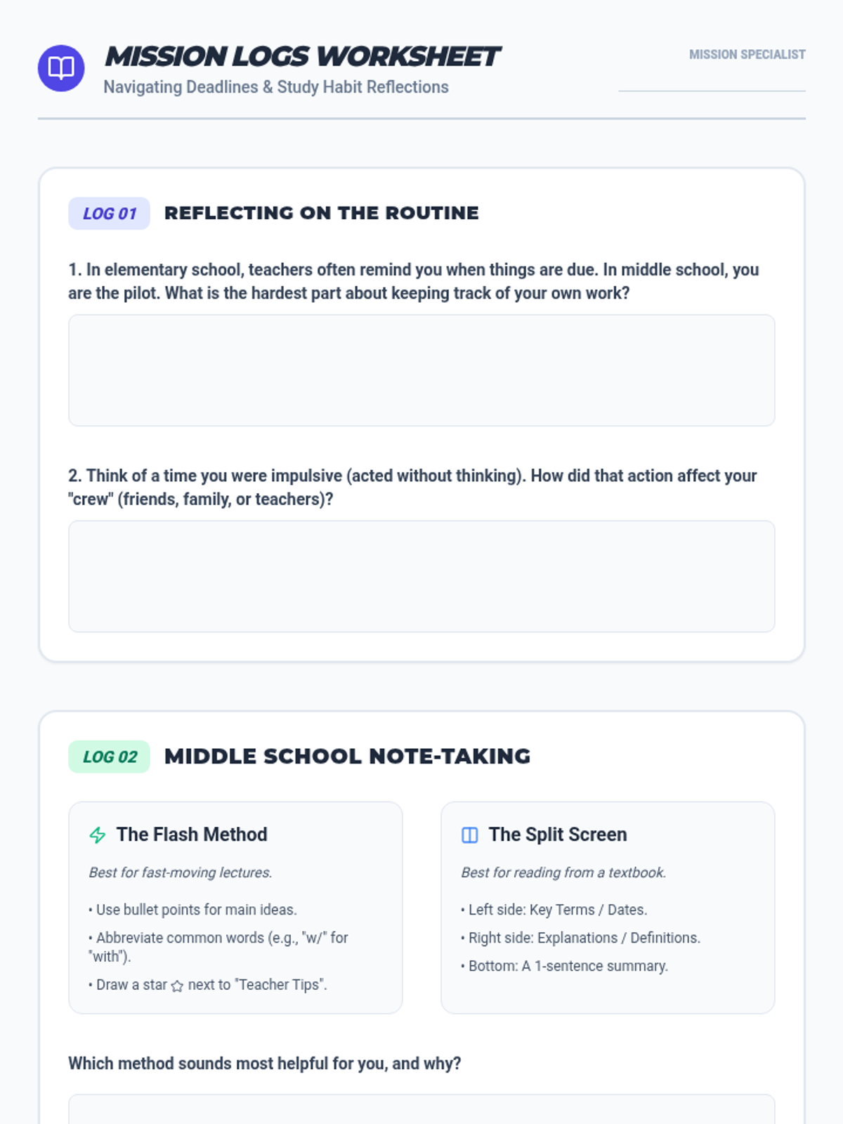 A comprehensive program designed to help 5th grade students transition to middle school by focusing on organizational systems, impulse control, and empathy. The theme uses a "Mission Control" metaphor to make the transition feel like an exciting space mission while providing concrete tools for success.