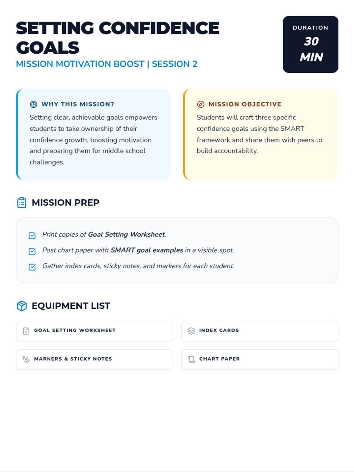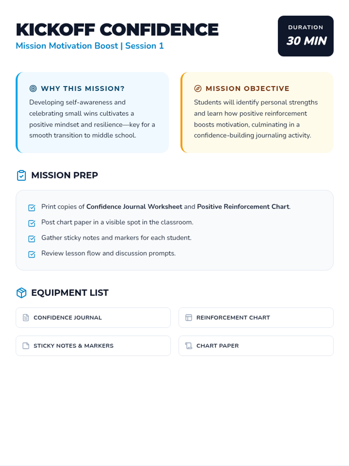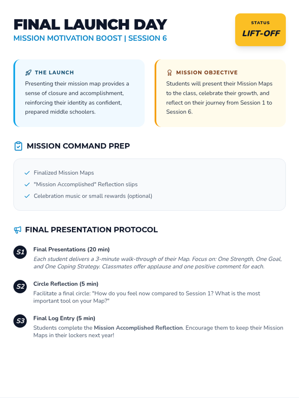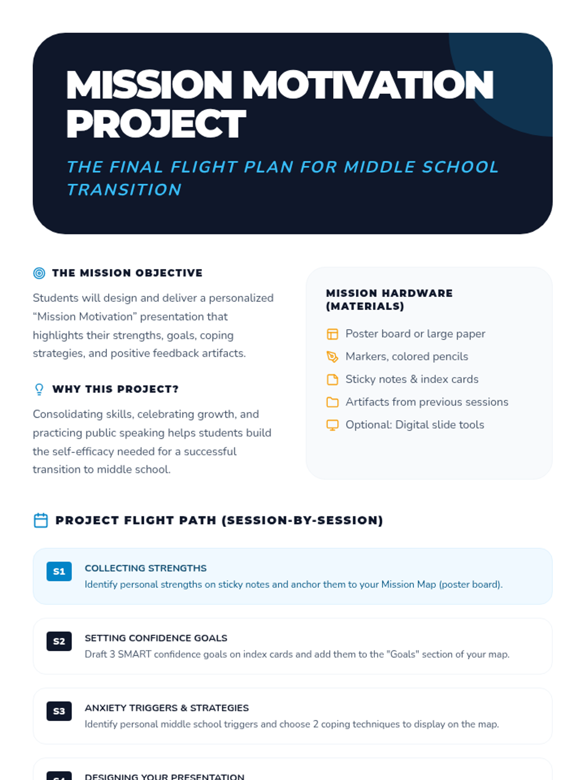 A 6-session journey for 5th graders to build confidence, manage anxiety, and develop motivation through a personalized project as they prepare for middle school.
