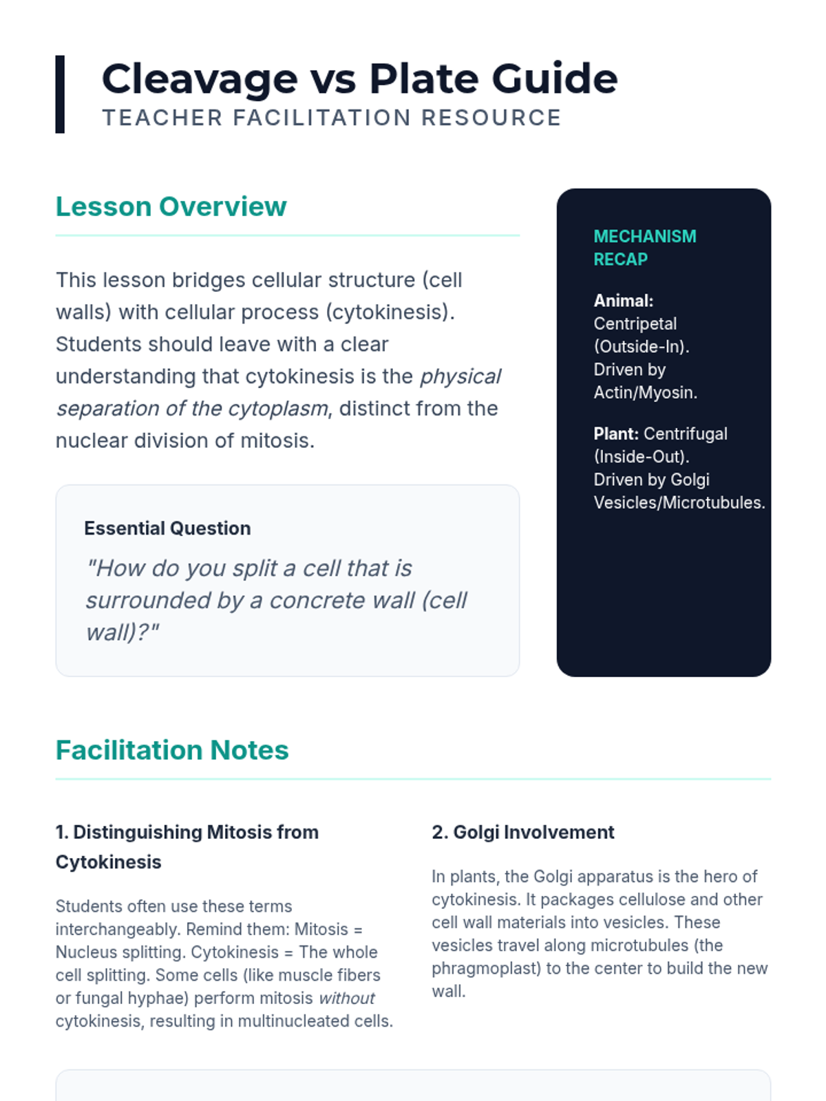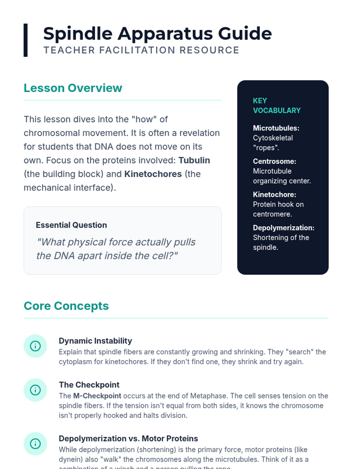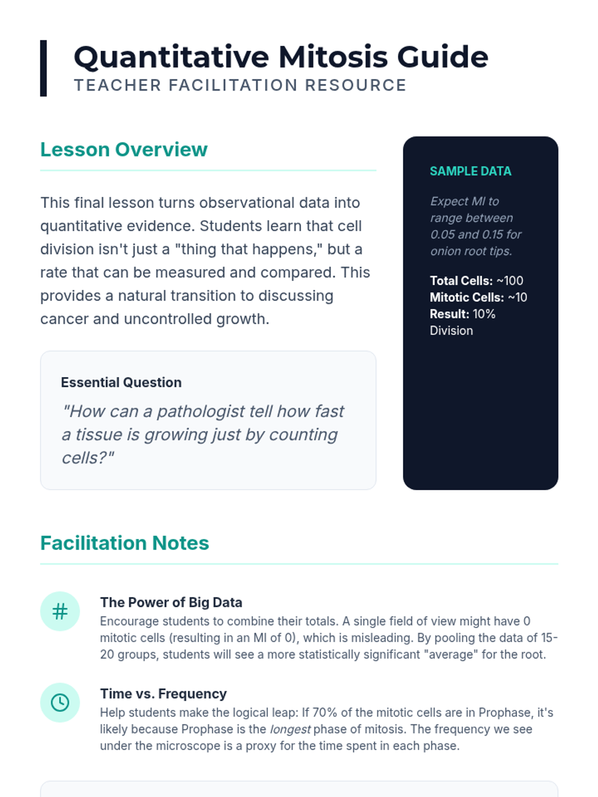 This sequence explores the mechanical process of mitosis and cytokinesis in somatic cells. Students progress from observational microscopy of onion root tips to modeling chromosome movement, investigating the spindle apparatus, comparing animal and plant cytokinesis, and calculating growth rates through the mitotic index.