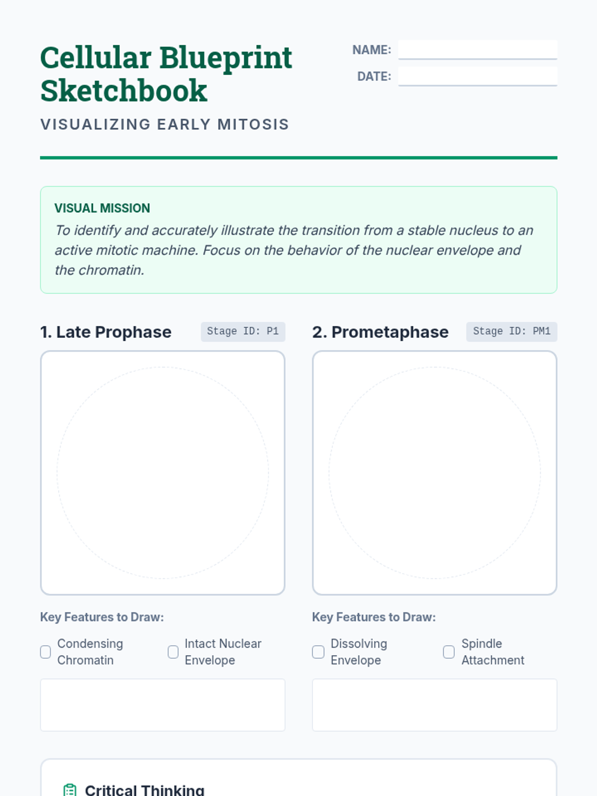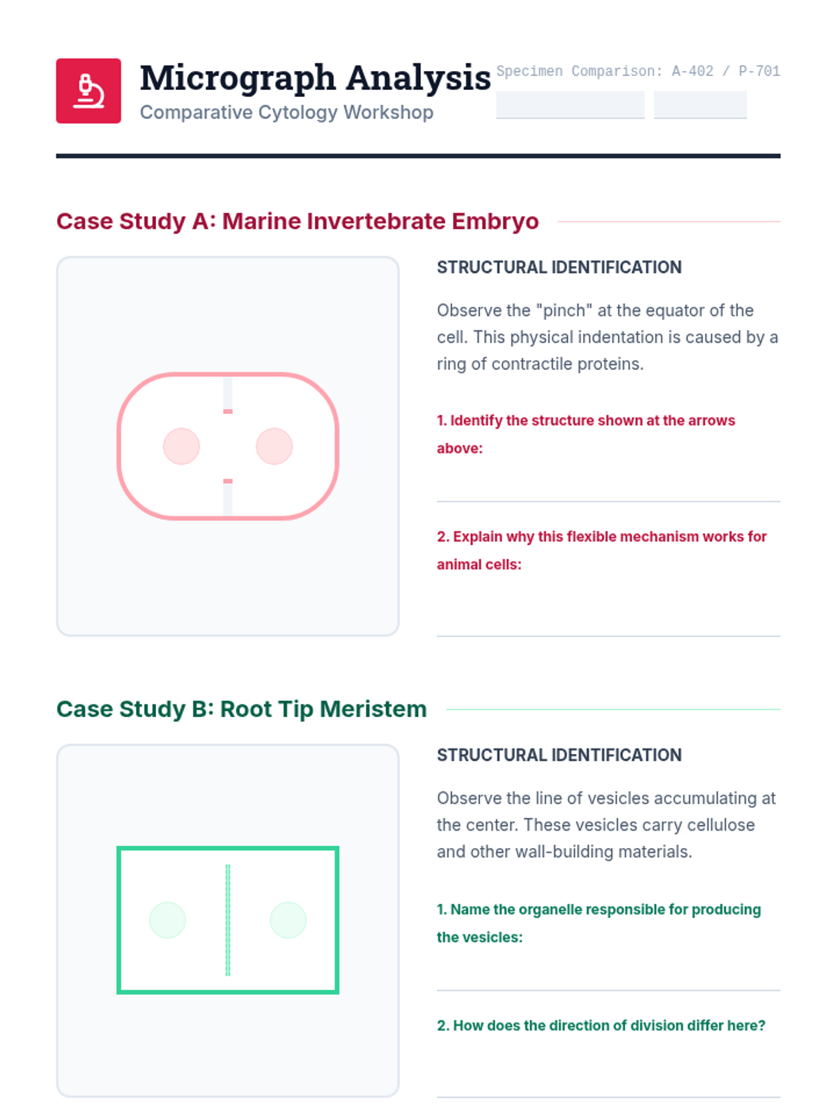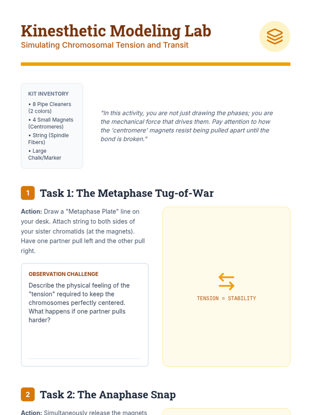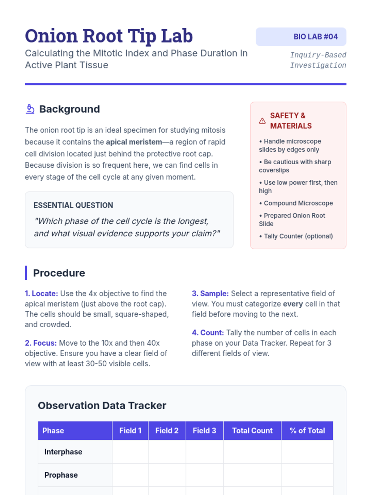 A laboratory-intensive biology sequence for 10th-grade students focusing on the mechanics of mitosis and cytokinesis. Students move from theoretical understanding to real-world microscopy observation and physical modeling to master chromosomal movement.