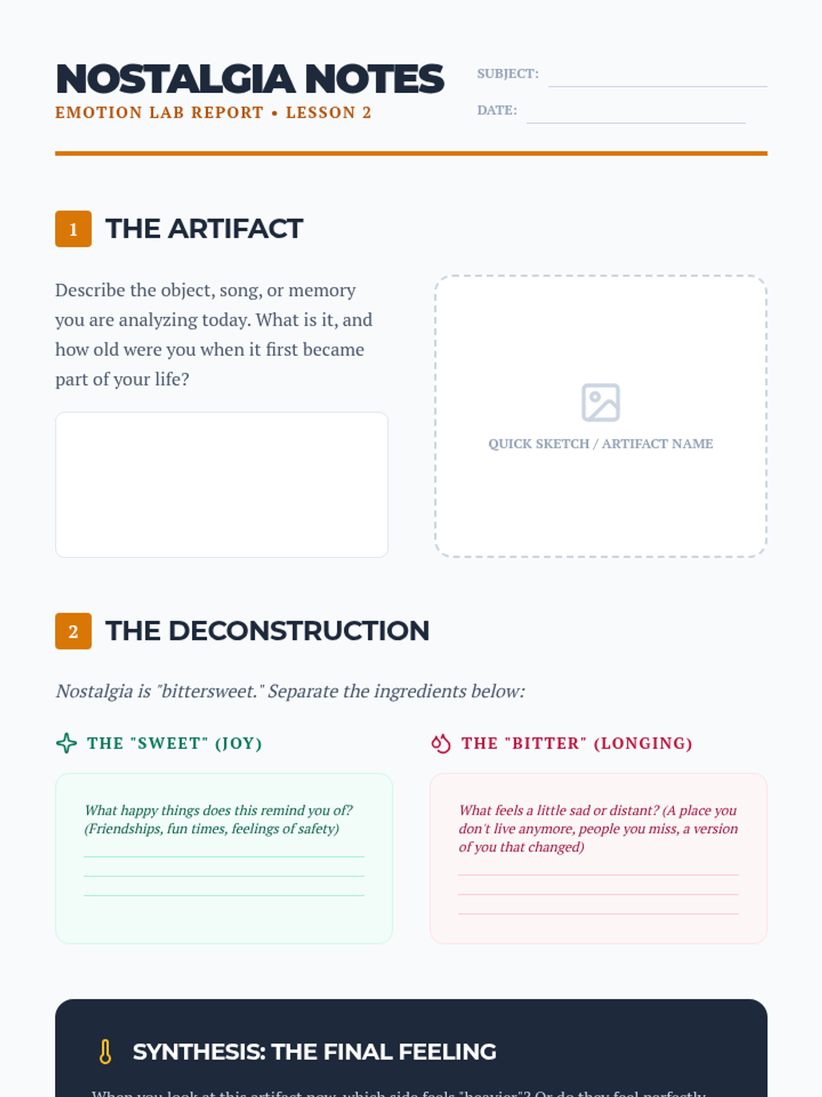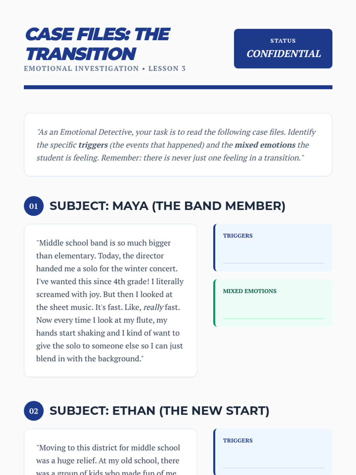 This sequence guides 6th-grade students through the complexity of mixed emotions, focusing on ambivalence, nostalgia, social conflict, and emotional mapping to help them navigate the transition into early adolescence.