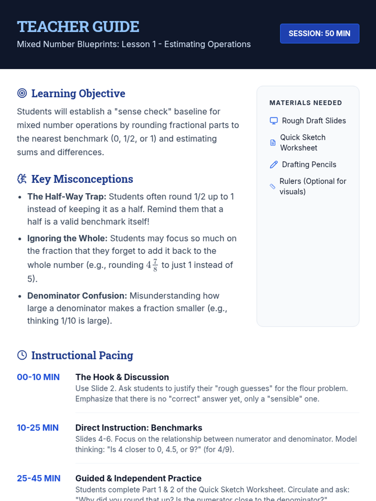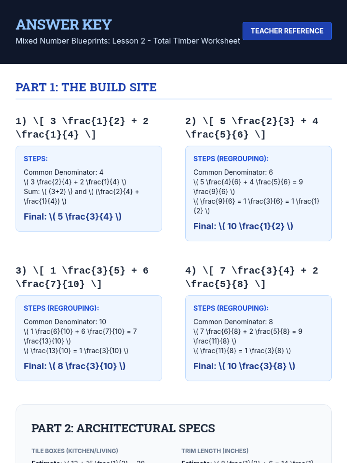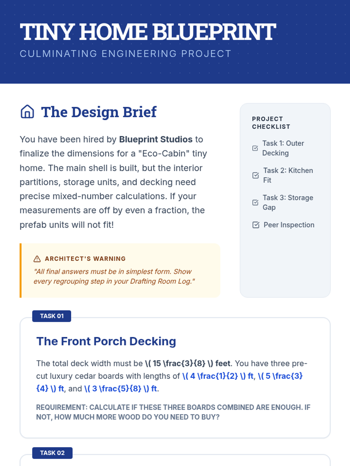 A comprehensive math sequence for 6th graders focusing on adding and subtracting mixed numbers with an emphasis on regrouping and real-world application through an architectural lens. Students progress from estimation to complex multi-step problems and a final tiny home design project.